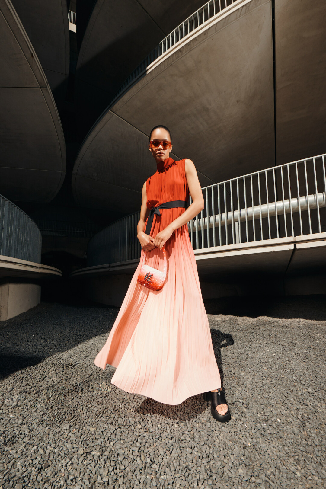 Но коллекция Весна-Лето 2023 — это еще и яркие цвета и анималистичные принты. Нынешний дизайн-директор KARL LAGERFELD Хун Ким хоть и оборачивается в прошлое, но стремительно движется вперед. Отсюда в его мудборде футуризм, научная фантастика и мысли о покорении Марса, отражающиеся в первую очередь в выбранной цветовой гамме: от охры и глубокого оранжевого до нежно-желтого и лаймового. Образцово-показательные вещи в этом плане — плиссированный комбинезон с градиентным переходом от красного в персиковый и неоново-зеленый плащ-трансформер — вещь из архива маэстро, выполненная из переработанного нейлона.
