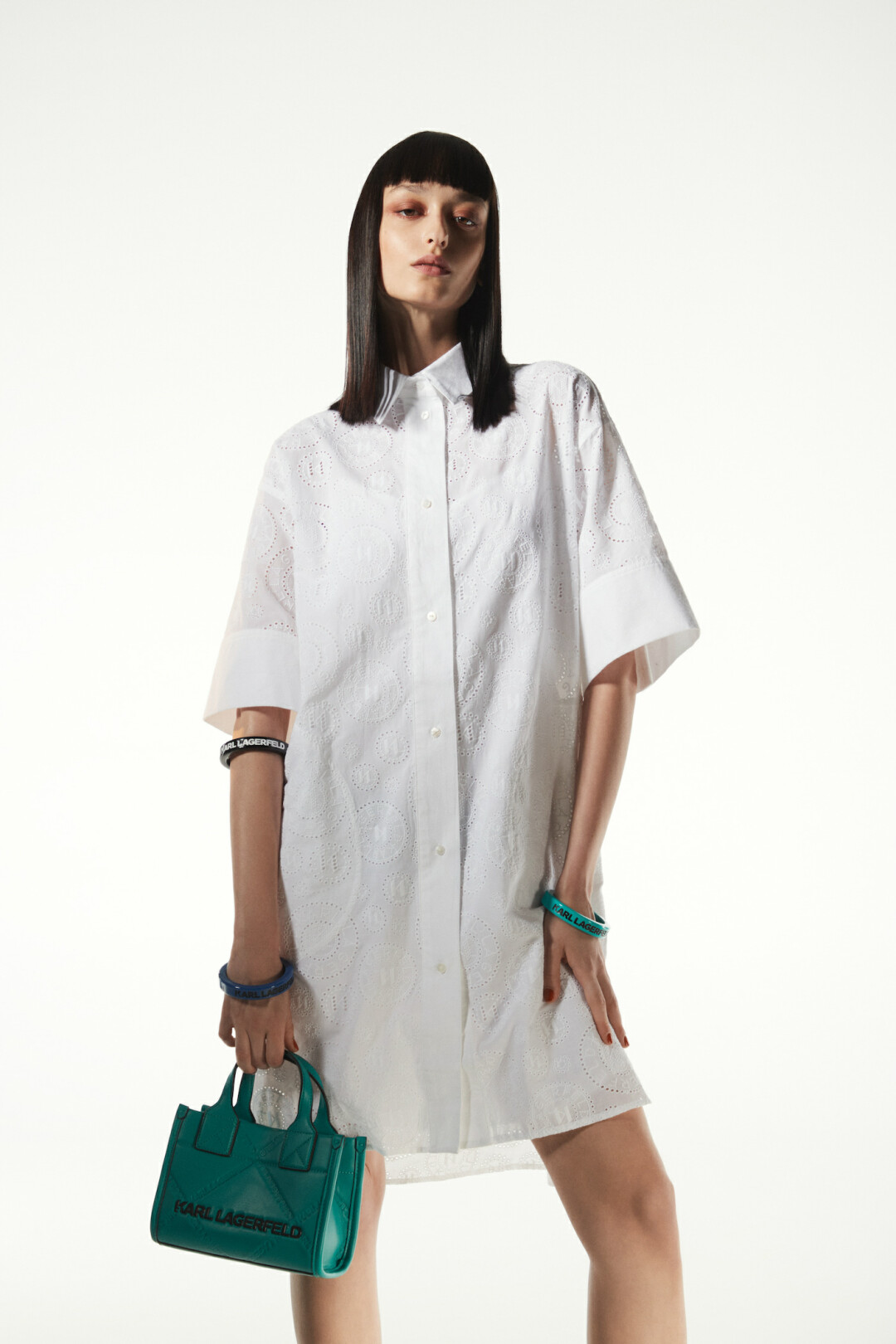 При этом в каждом сезоне дизайнеры KARL LAGERFELD отдают дань творчеству создателя бренда — через более или менее очевидные отсылки. Лагерфельд любил объемные, даже чуть громоздкие силуэты — здесь об этом напоминают не только оверсайз-футболки и свободные рубашки. По заветам Коко Шанель много работал с букле — из него в новой коллекции выполнены жакеты и вставки на джинсах и куртках из денима. А еще превращал классические вещи в арт-объекты за счет акцентов. Так, на обычных с виду брюках со стрелками при ближайшем рассмотрении появляется монограмма KL, и ее же образует кружево на сорочках, топах и летних тренчах. Нередко черно-белых — это любимое цветовое сочетание Карла Лагерфельда, которого он придерживался сам.