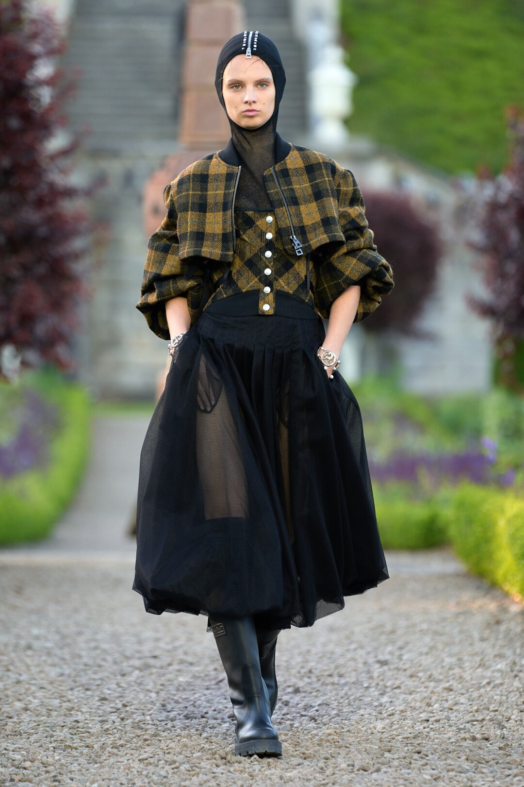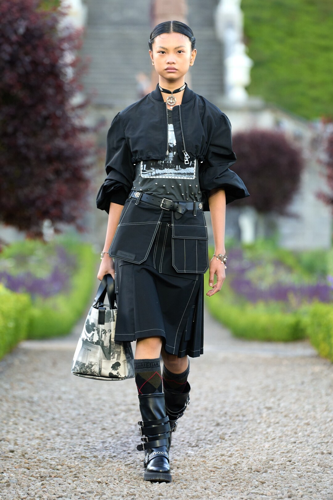 Круизная коллекция Dior — фэшн-доказательство, что клетка с нами надолго: Кьюри миксует шотландку, буффало и аргайл, превращая привычные килты в нано-шорты, корсетные баски и кейпы. Обувает моделей в мотокорные ботинки и рыбацкие бродни, голосует за обилие кожи и меха в одежде (вероятно, до следующей медийной эко-инициативы модного дома) и предлагает запастить кольчугой и мрачными балаклавами.