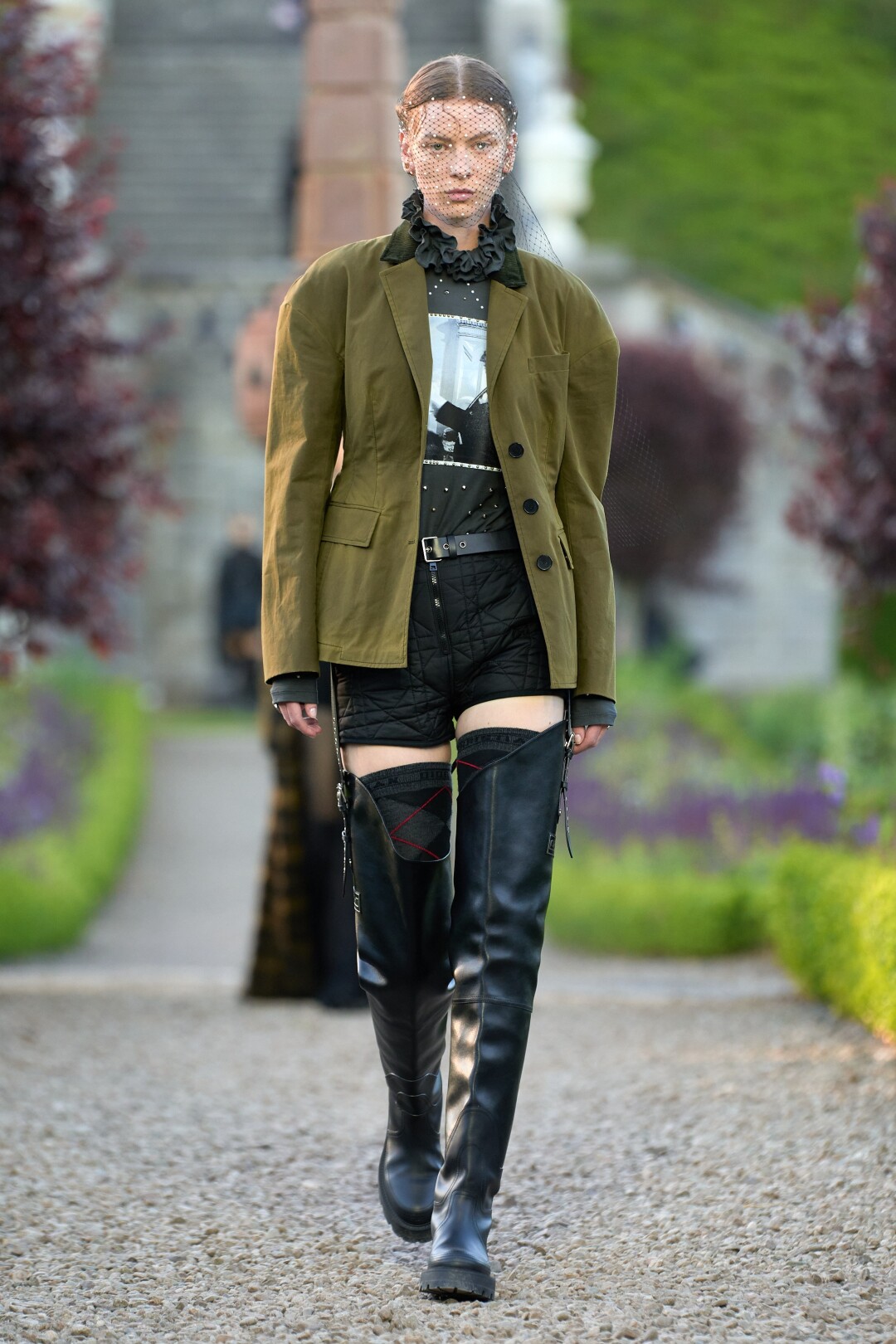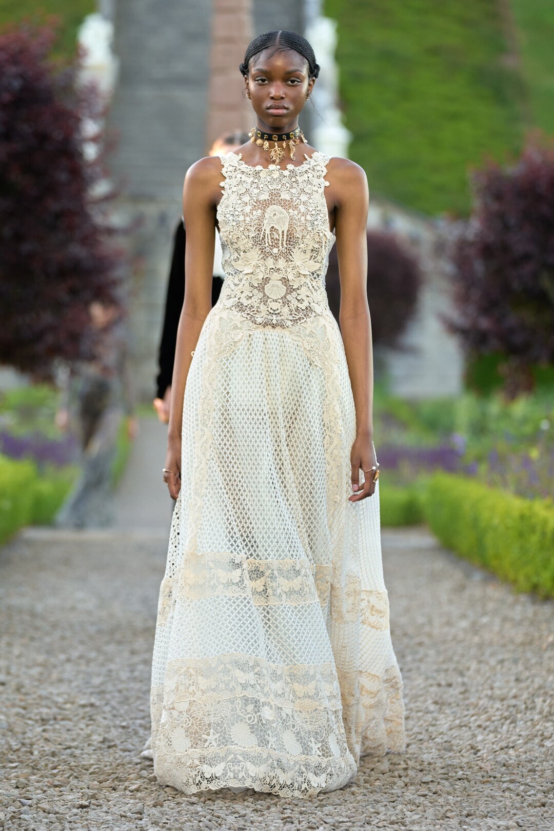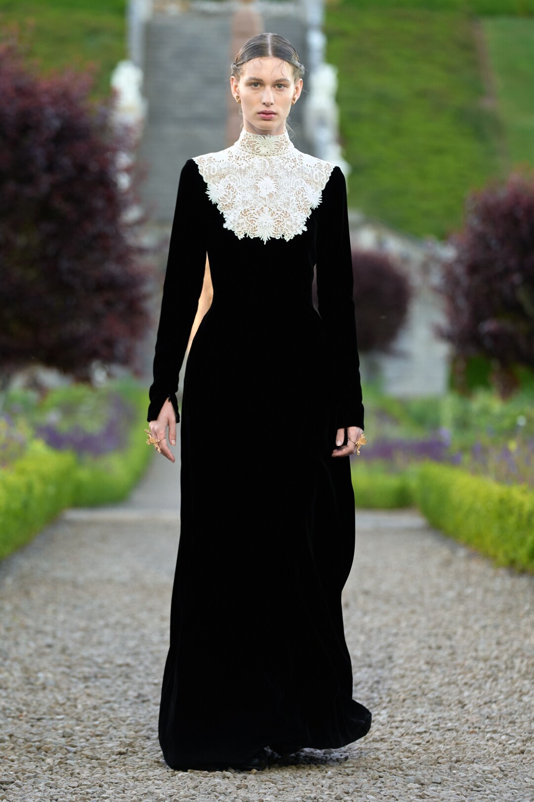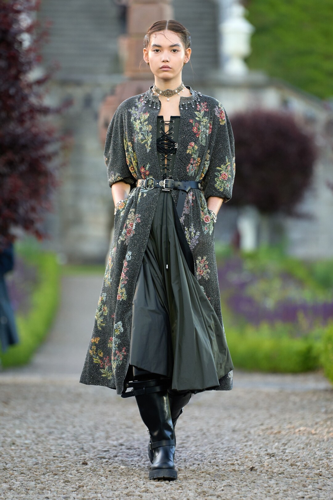 Если для показов весенне-летнего сезона 1955 года Кристиан Диор выбрал отели в Глазго и Оштерардере, то Мария Грация Кьюри провела круизное шоу 2025 года с 89-ю луками (диора много не бывает) в природных декорациях замка Драммонд. Вместо New Look — отсылки к тюдоровской эпохе Марии Стюарт и модная трансформация исторического костюма (с опорой на гальяновский Dior, панк-кутюр Вивьен Вествуд и шотландский культурный код — с килтами и волынкой).
