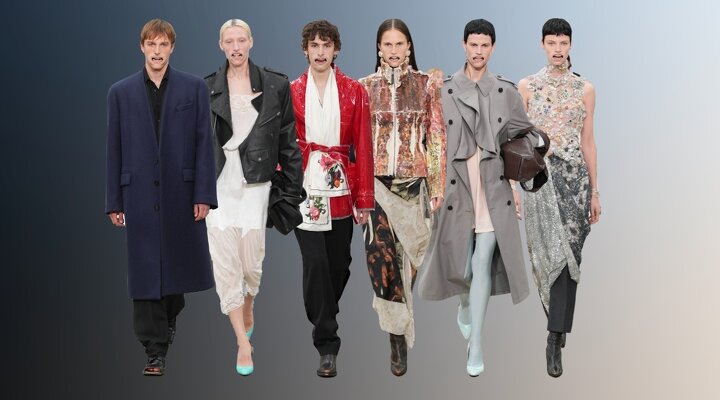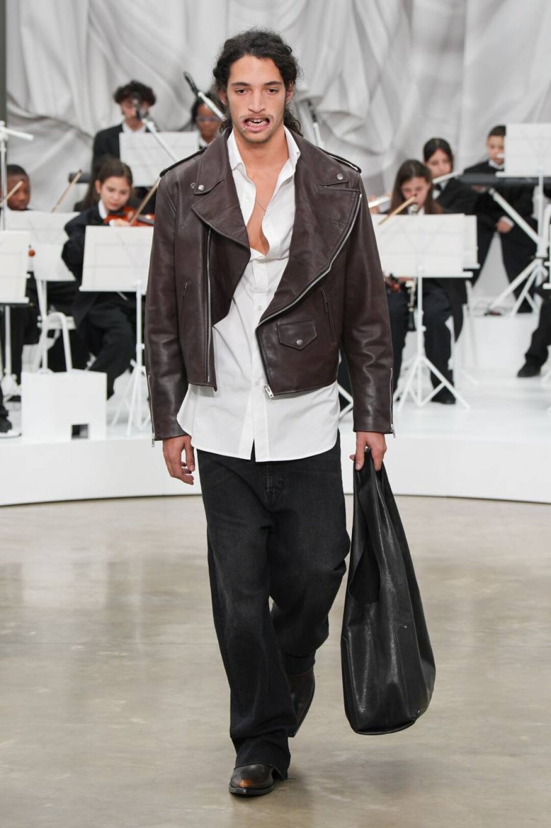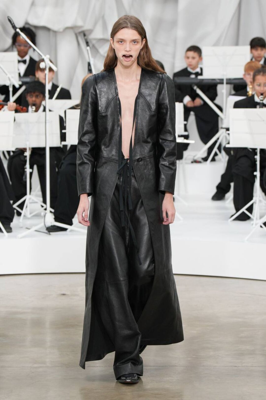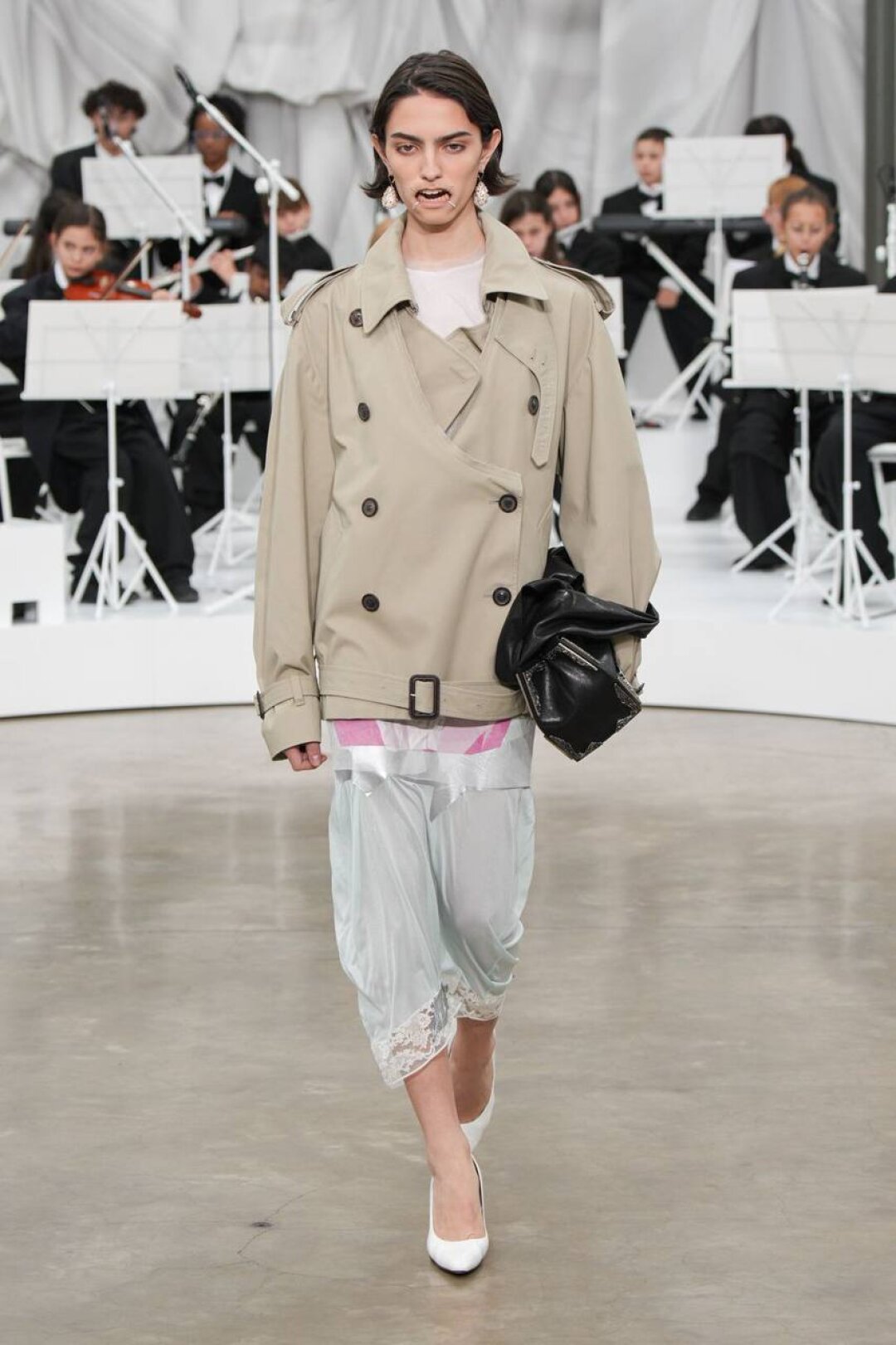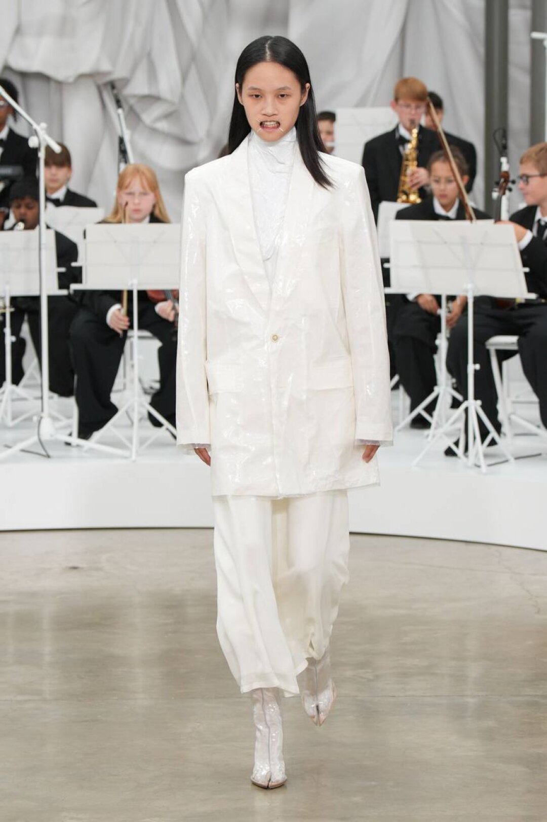 Лучшая униформа для театрального сезона, по мнению худрука Maison Margiela, — кожаные двойки с приталенными жакетами на завязках, юбки на запах с костюмными жилетами, глухие макси (тоже из кожи!) и оверсайз-бермуды из денима в комбо со смокингом. Вообще, в отличие от мощного осенне-зимнего кутюра в этом сезоне Гленн Мартенс делает однозначную ставку на коммерческие, относительно понятные и носибельные вещи. Помимо всевозможных костюмных айтемов —кэжуальных, но с оригинальными деталями (лишенные лацканов и покрытые пластиковым слоем объемные пиджаки, брюки с экстремально удлиненной ширинкой, гибриды жилетов и макси-жакетов) — увидели много денима, кожи и повседневной верхней одежды — от помятых косух до базовых тренчей и плечистых пальто из плотной шерсти.