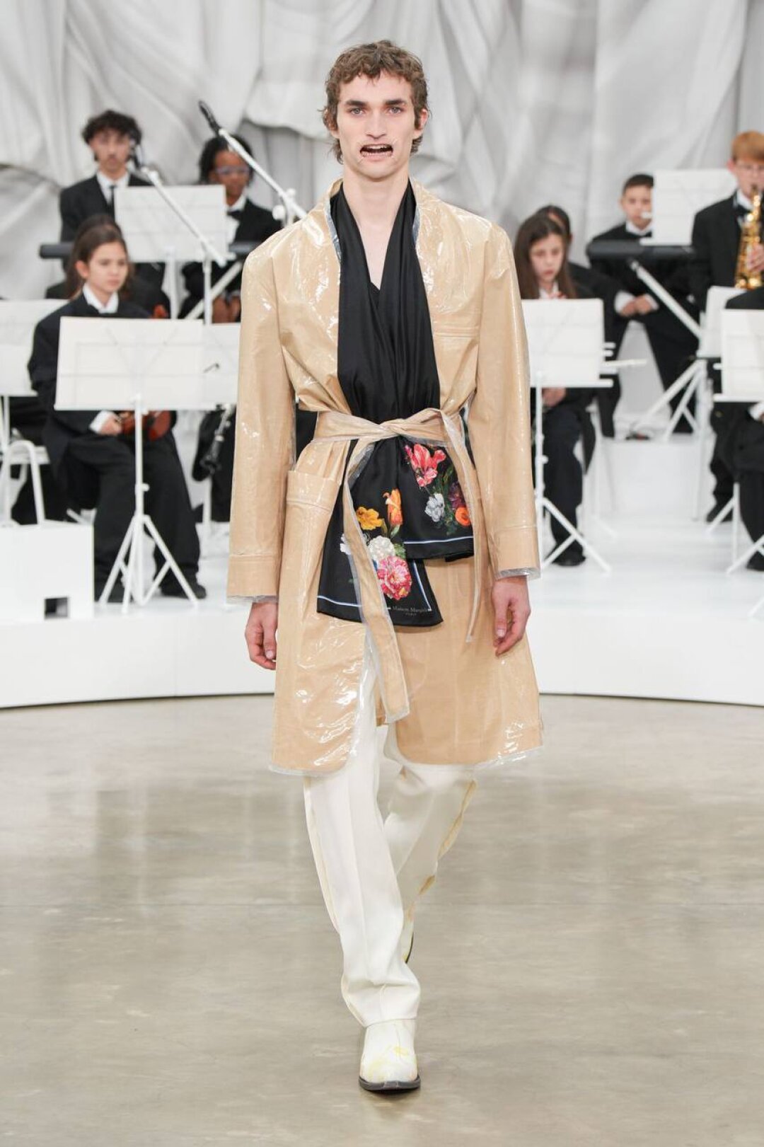 Дизайнер намекнул на весенне-летний сезон обилием цветочных принтов: Мартенс замиксовал флористический жакет с потрескавшейся краской (эффект будто живущей, увядающей и трансформирующейся вещи — один из любимых в арсенале самого Маржелы!) с юбкой Франкенштейна, показал сложносочиненные драпированные платья и сверкающие юбки, а еще — дополнил покрытые винилом плащи-халаты шелковыми платками с разноцветными букетами. Отец основатель помахал рукой не только через состаренный жакет, но и обмотанные скотчем платья в финале шоу, мужские лоферы с обрезанным мысом (peep-toe for men!) и фирменные четыре стежка, фиксирующие губы моделей наподобие стоматологического ретрактора.