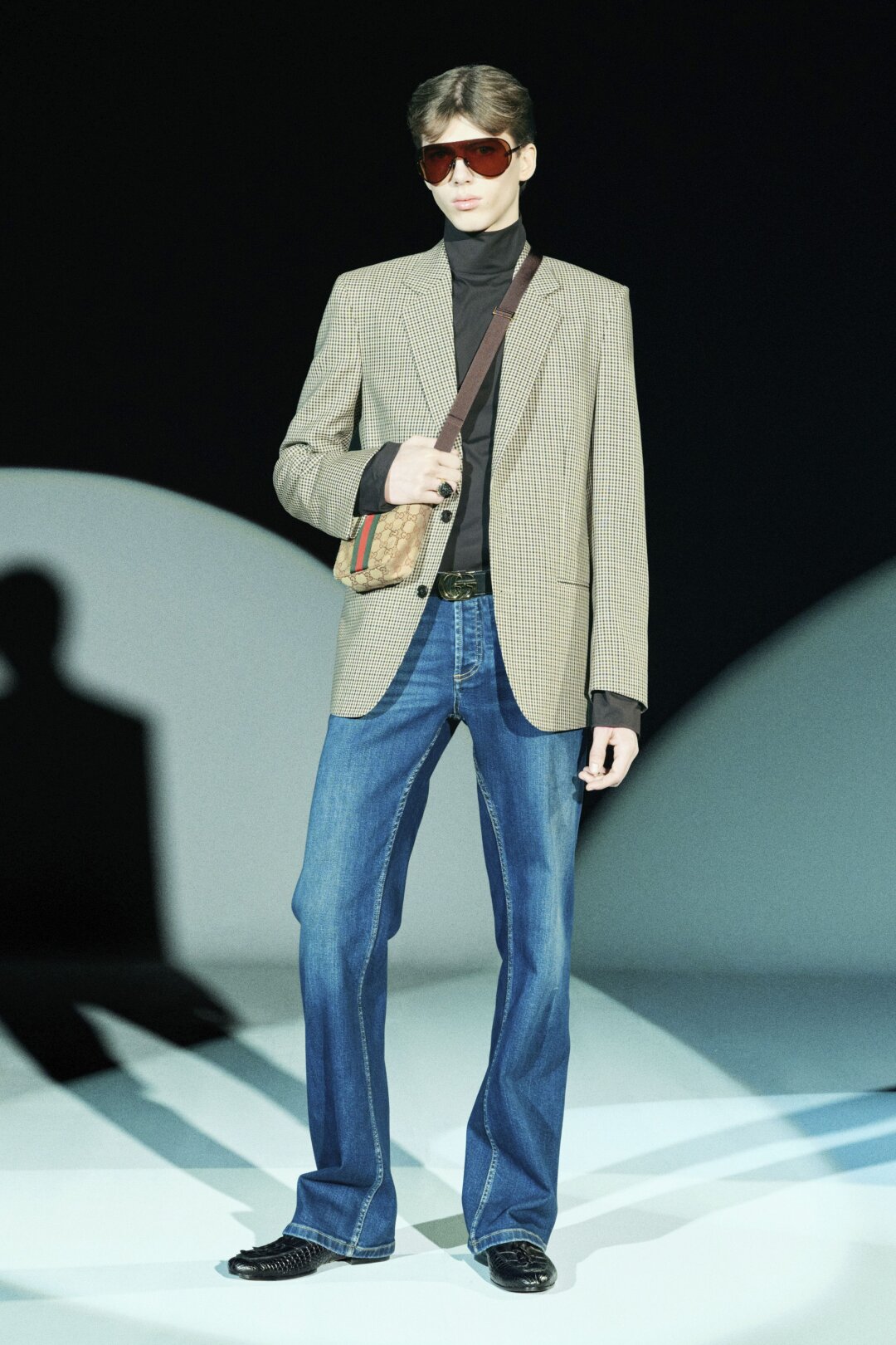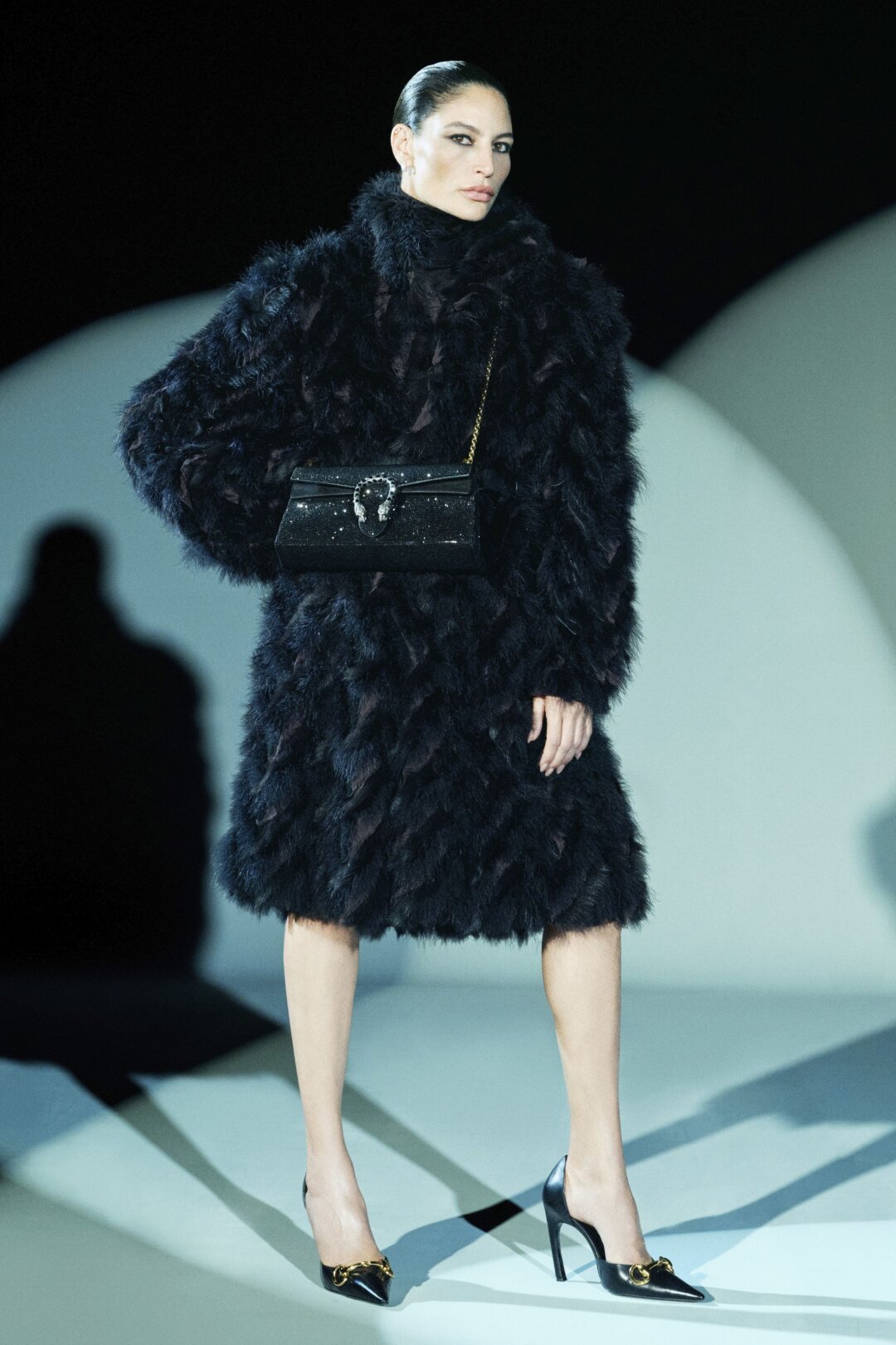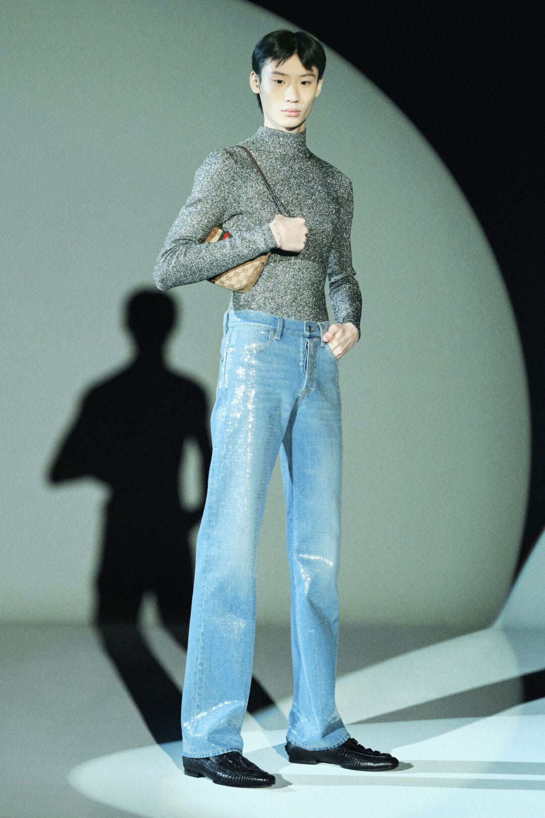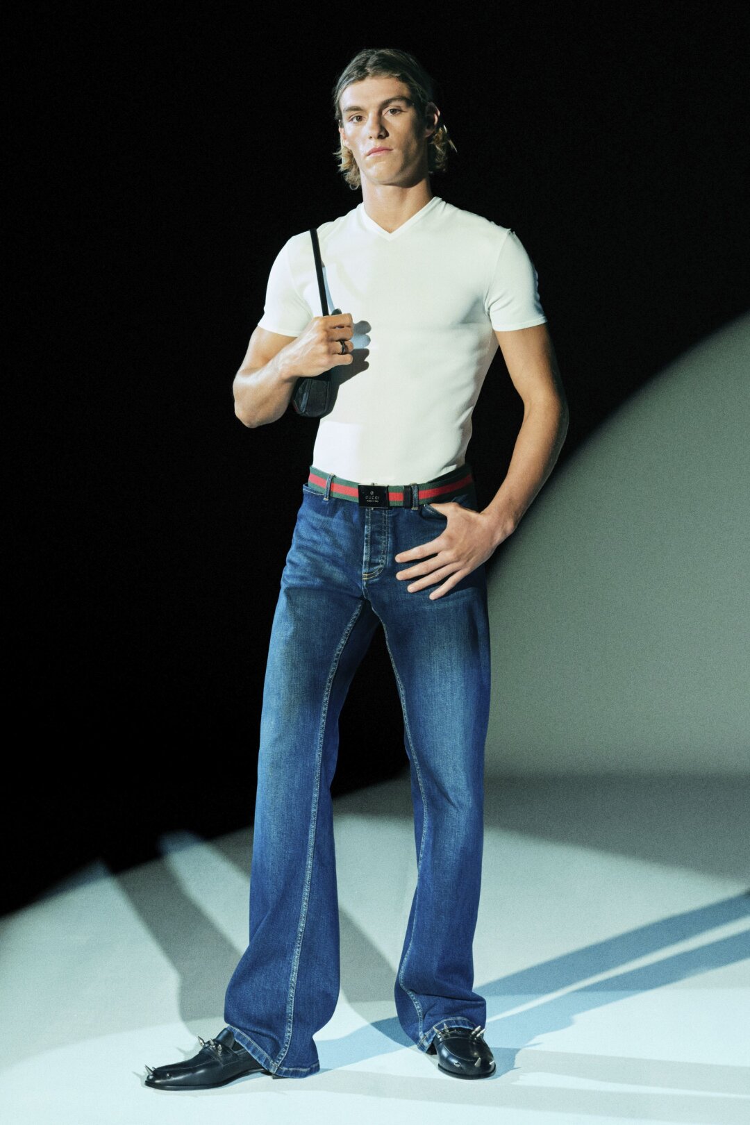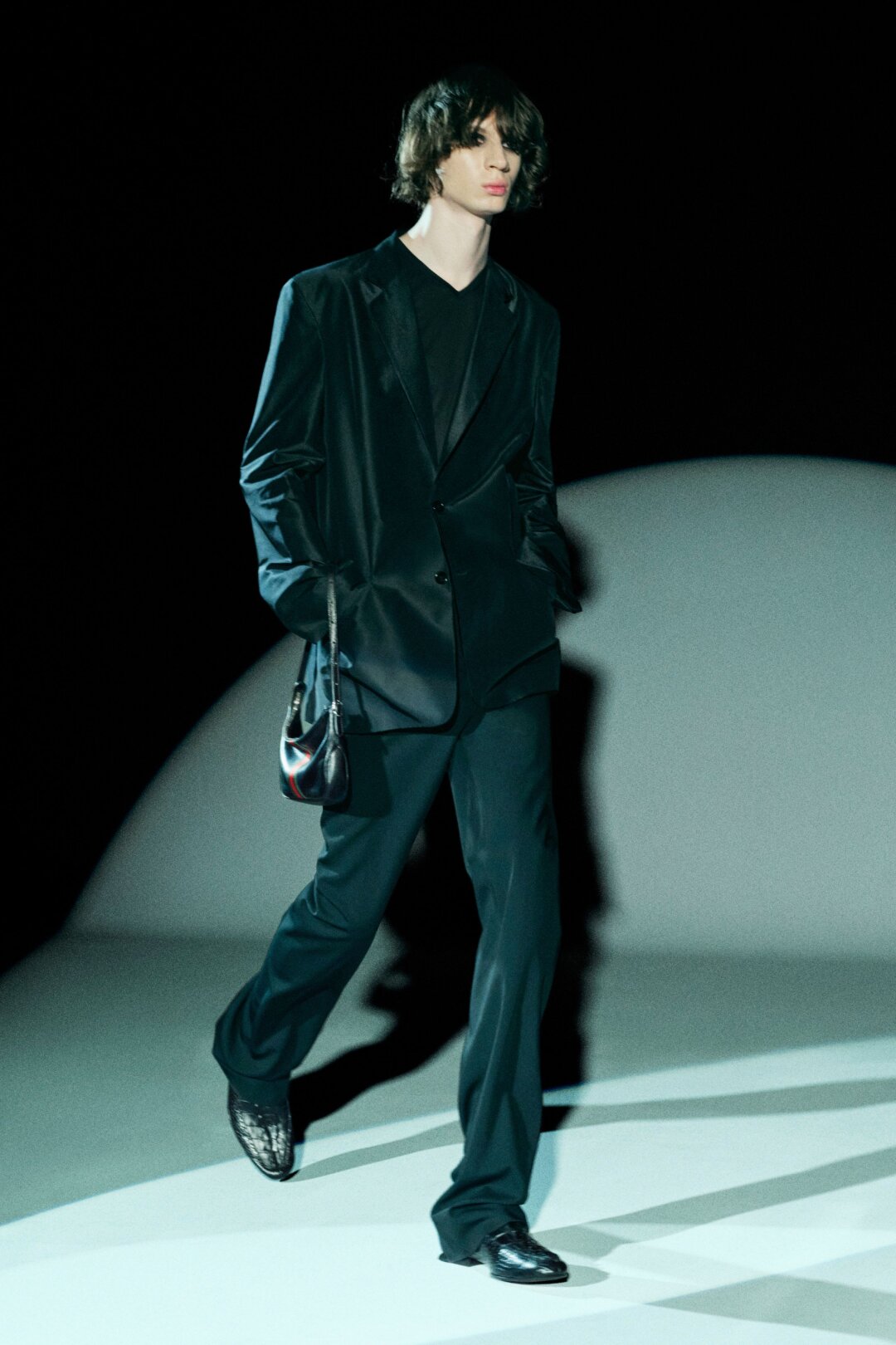 Меняем оверсайз-худи и мешковатые брюки на скинни-джинсы, ультраобтягивающие косухи и бимбо-платья, плюс говорим «да» приталенным футболкам (даже в мужском гардеробе), кружевным брюкам (тоже как с показа 1999 года) и легким пальто из черных перьев, сшитых из муслина. В мире обуви отказываемся от гигакроссов в пользу кожаных лоферов, широких БДСМ-сапог и мегавысоких лодочек с культовыми пряжками Horsebit, а в линейке аксессуаров ловим FOMO от обновленной Jackie 1961 и геометричных Dionysus с тигрозастежкой. И да, логомания — снова ин, в том числe те самые web-лампасы (на ремнях, сумках, кожанках и брюках!).