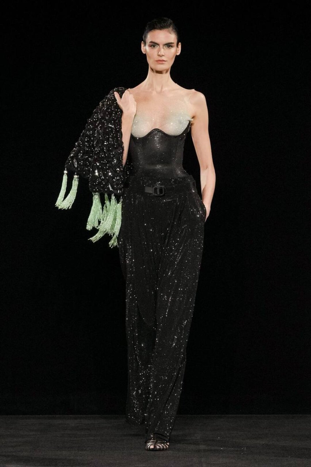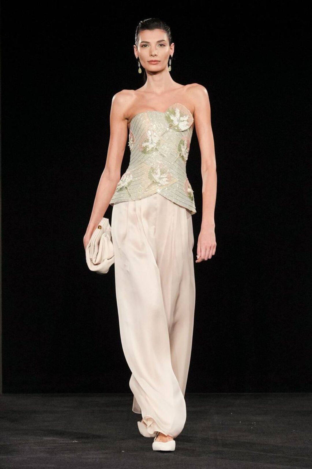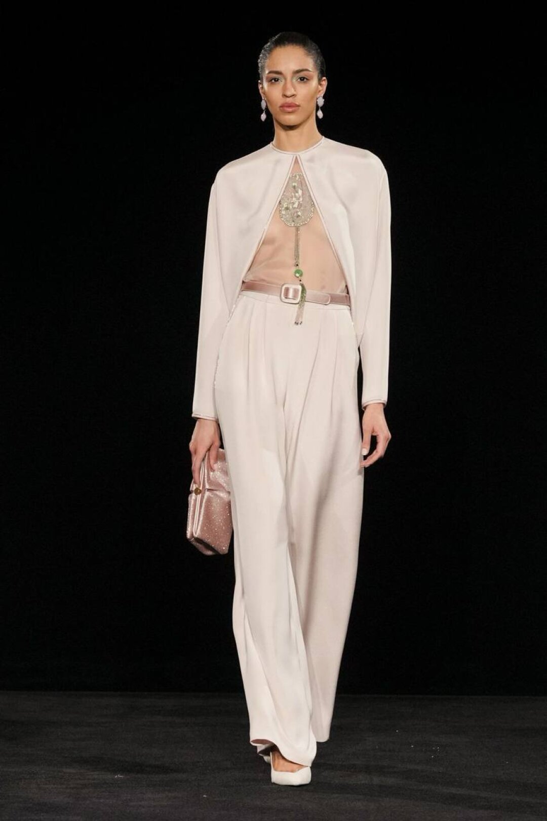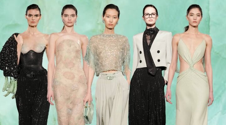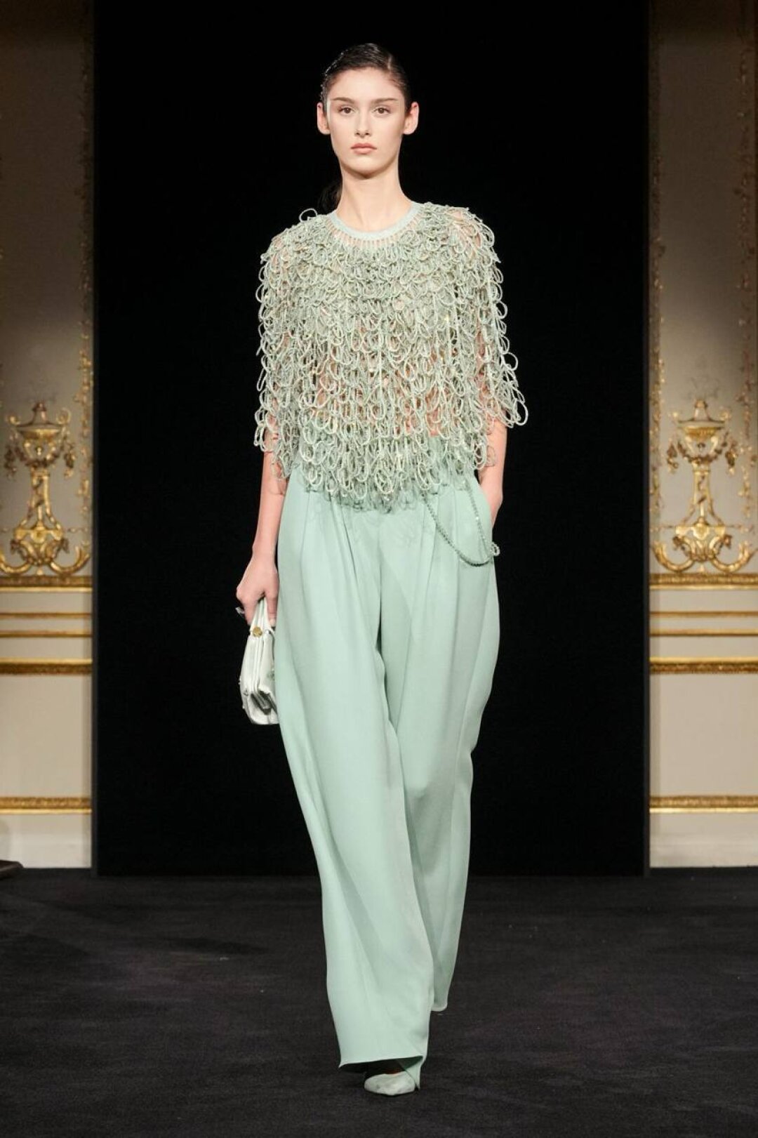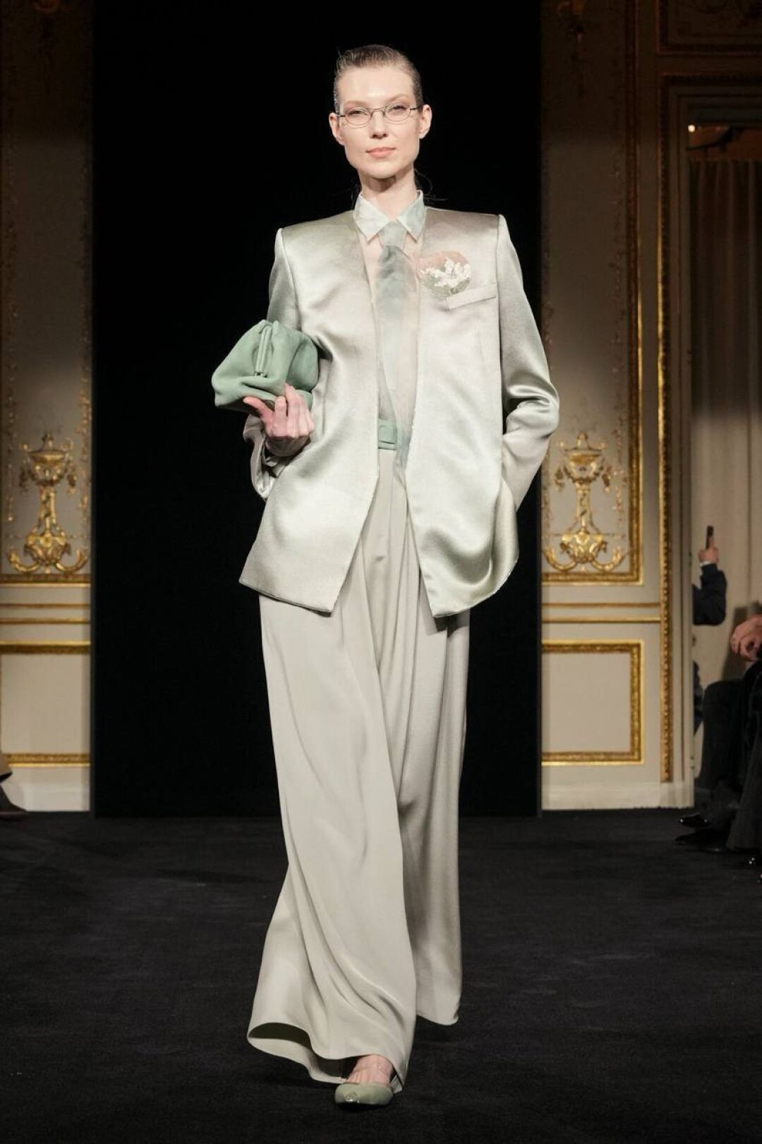 Излюбленный Армани шинуазри (практиковал до того, как это стало мейнстримом!) тоже на месте: Сильвана обратилась к образу традиционного китайского веера (утива) и украсила им прозрачные топы с глубоким V-образным вырезом, искрящиеся корсеты, шелковые жакеты с акцентными плечами и нюдовые платья-колонны. Плюс: неравнодушие к азиатской эстетике выразилось в шинуазри-блузах, напоминающих кимоно жакетах и корсетах в духе поясов-оби. Преемница осталась верна и палитре — вместо экстремально ярких или нарочито трендовых оттенков Сильвана сделала ставку на традиционной для дома пастельной гамме. Основой показа стал бледно-бирюзовый оттенок, принадлежащий одному из самых редких минералов жадеиту (по англ. Jade — именно так и была названа коллекция). Нежный зеленый оттенок разбавляли бежевый, бело-лиловый и черный.