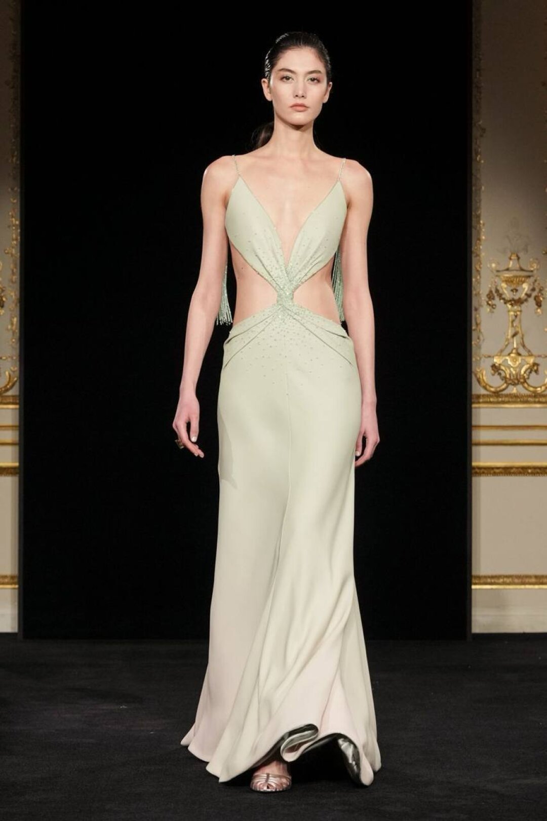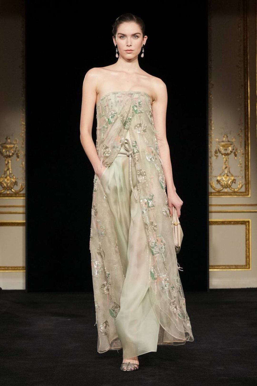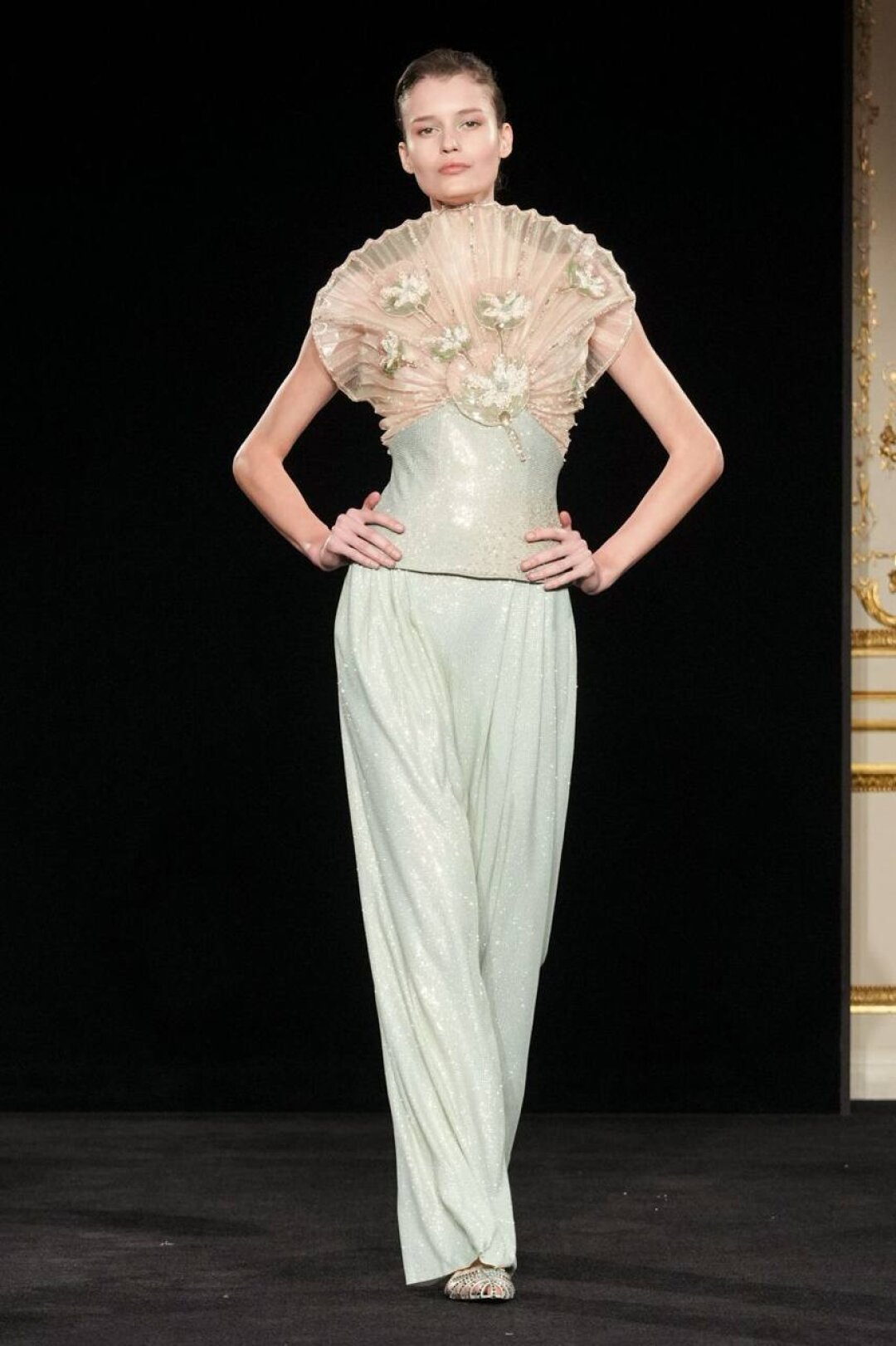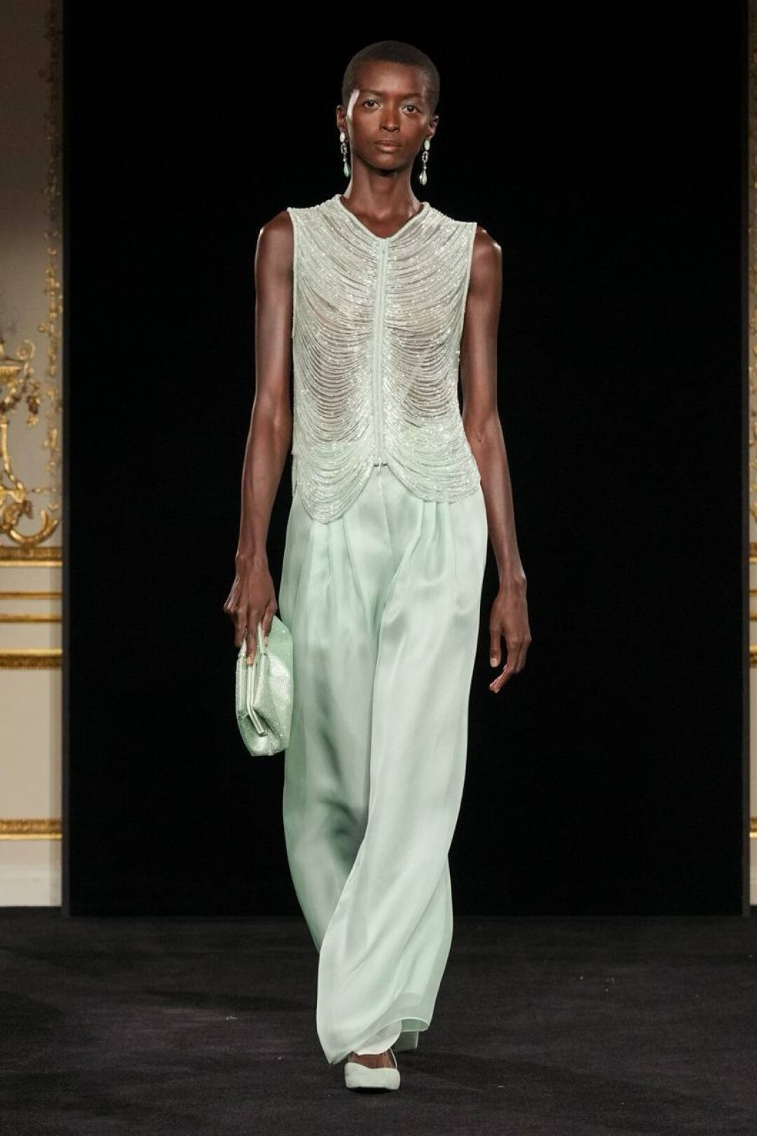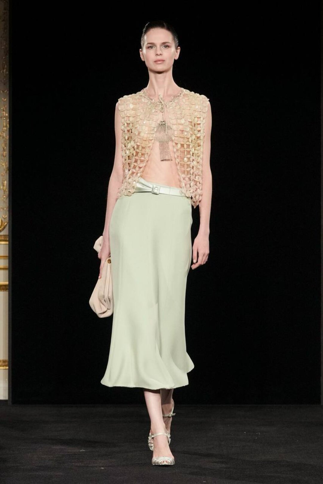 Излюбленный Армани шинуазри (практиковал до того, как это стало мейнстримом!) тоже на месте: Сильвана обратилась к образу традиционного китайского веера (утива) и украсила им прозрачные топы с глубоким V-образным вырезом, искрящиеся корсеты, шелковые жакеты с акцентными плечами и нюдовые платья-колонны. Плюс: неравнодушие к азиатской эстетике выразилось в шинуазри-блузах, напоминающих кимоно жакетах и корсетах в духе поясов-оби. Преемница осталась верна и палитре — вместо экстремально ярких или нарочито трендовых оттенков Сильвана сделала ставку на традиционной для дома пастельной гамме. Основой показа стал бледно-бирюзовый оттенок, принадлежащий одному из самых редких минералов жадеиту (по англ. Jade — именно так и была названа коллекция). Нежный зеленый оттенок разбавляли бежевый, бело-лиловый и черный.