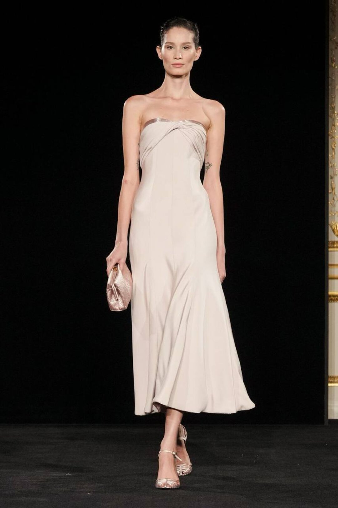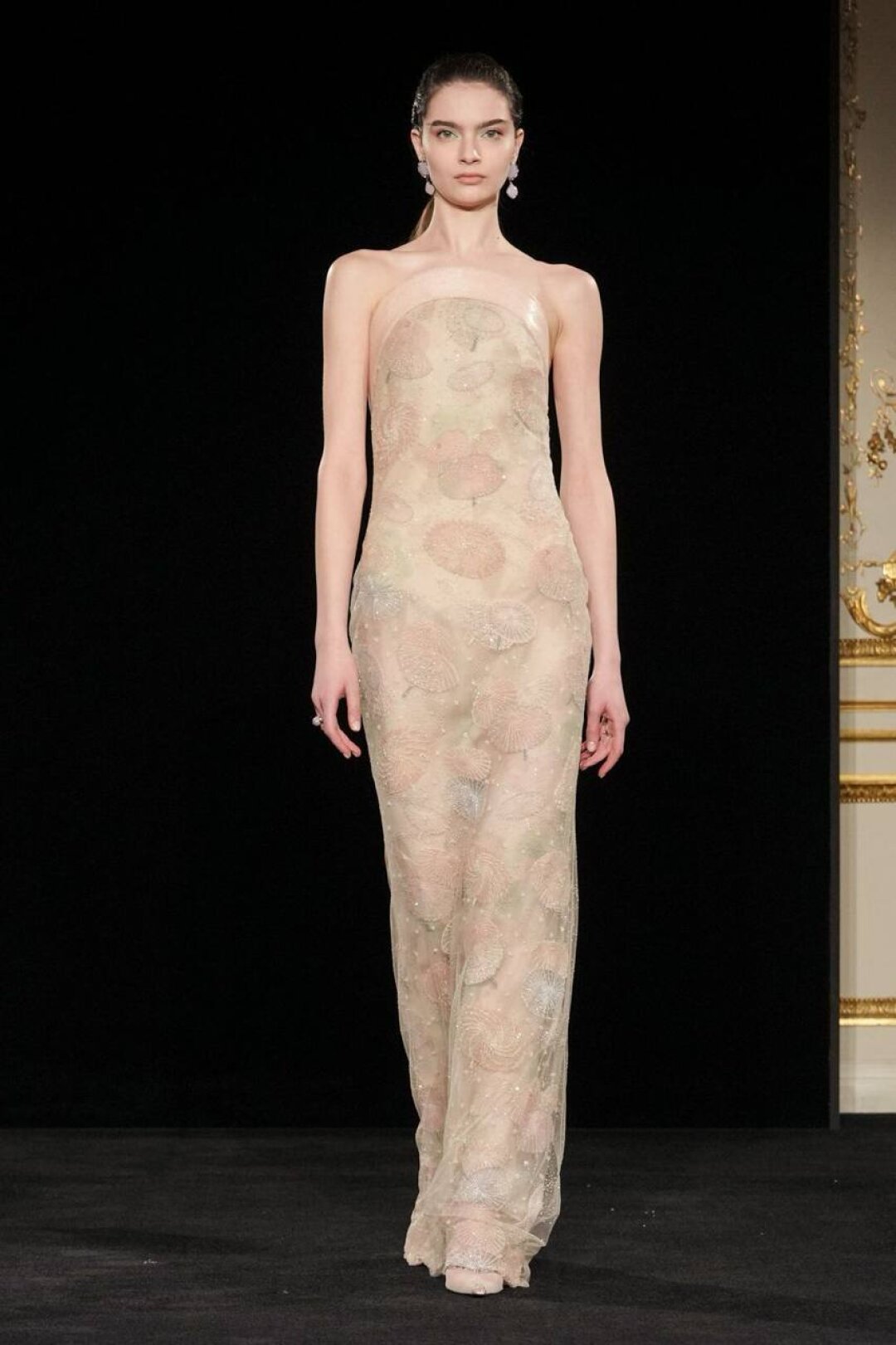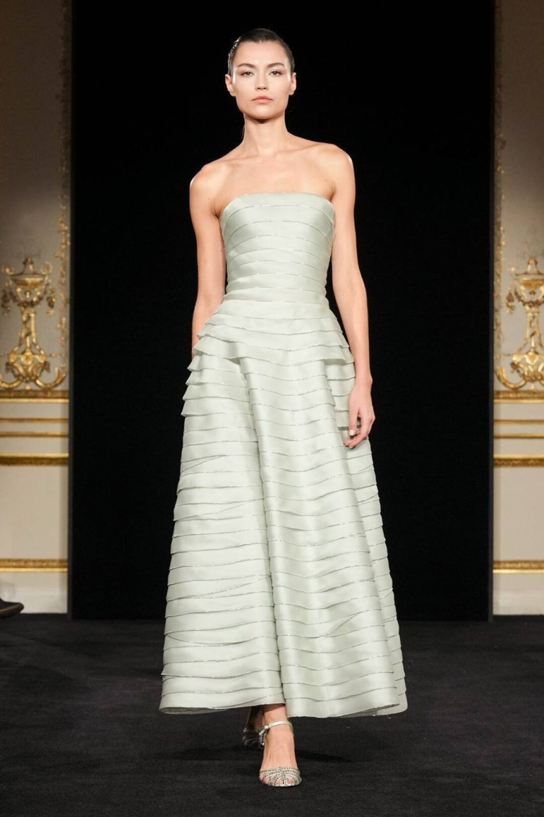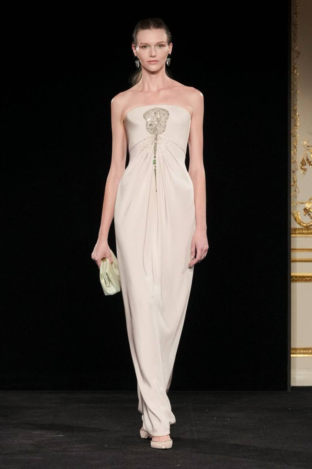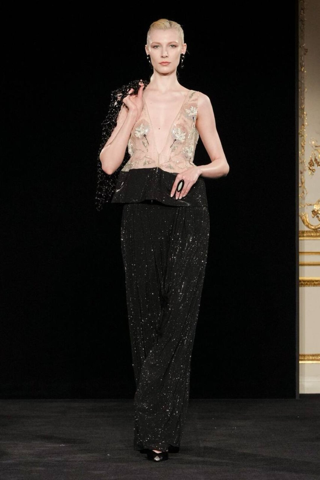 Излюбленный Армани шинуазри (практиковал до того, как это стало мейнстримом!) тоже на месте: Сильвана обратилась к образу традиционного китайского веера (утива) и украсила им прозрачные топы с глубоким V-образным вырезом, искрящиеся корсеты, шелковые жакеты с акцентными плечами и нюдовые платья-колонны. Плюс: неравнодушие к азиатской эстетике выразилось в шинуазри-блузах, напоминающих кимоно жакетах и корсетах в духе поясов-оби. Преемница осталась верна и палитре — вместо экстремально ярких или нарочито трендовых оттенков Сильвана сделала ставку на традиционной для дома пастельной гамме. Основой показа стал бледно-бирюзовый оттенок, принадлежащий одному из самых редких минералов жадеиту (по англ. Jade — именно так и была названа коллекция). Нежный зеленый оттенок разбавляли бежевый, бело-лиловый и черный.