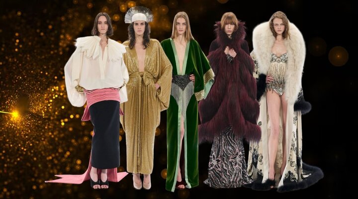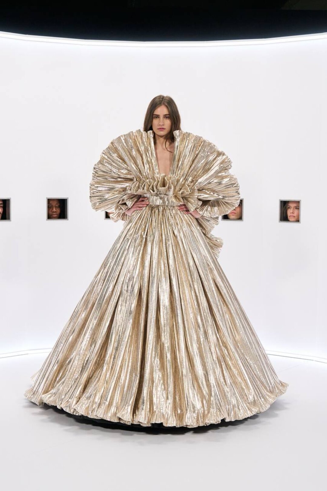Золотистое платье со сложносочиненными драпировками будто из кино 30-х соседствовало с полупрозрачным хитоном и лучеобразной короной. За кимоно из изумрудного бархата (похожее платье носила героиня Вивьен Ли в «Унесенных ветром») — огненная накидка в тандеме с головным убором, украшенным плюмажем, и расшитый сверкающими вышивками декадентский пеньюар с меховой отделкой.