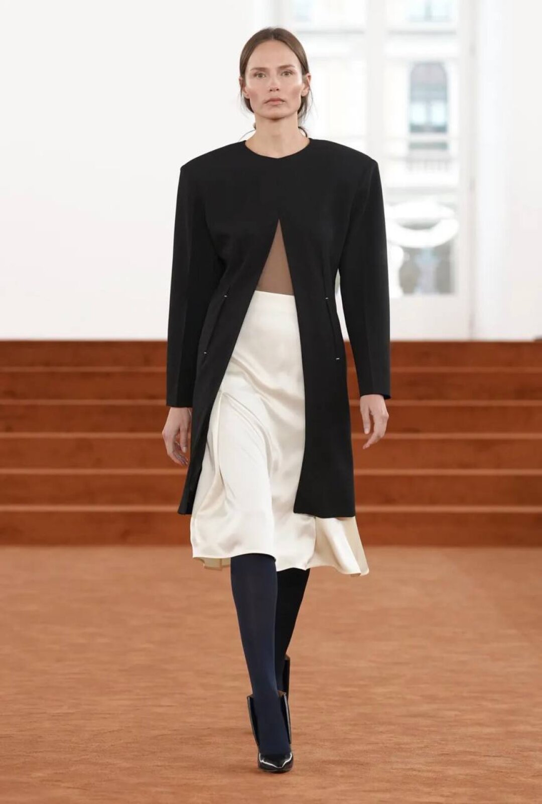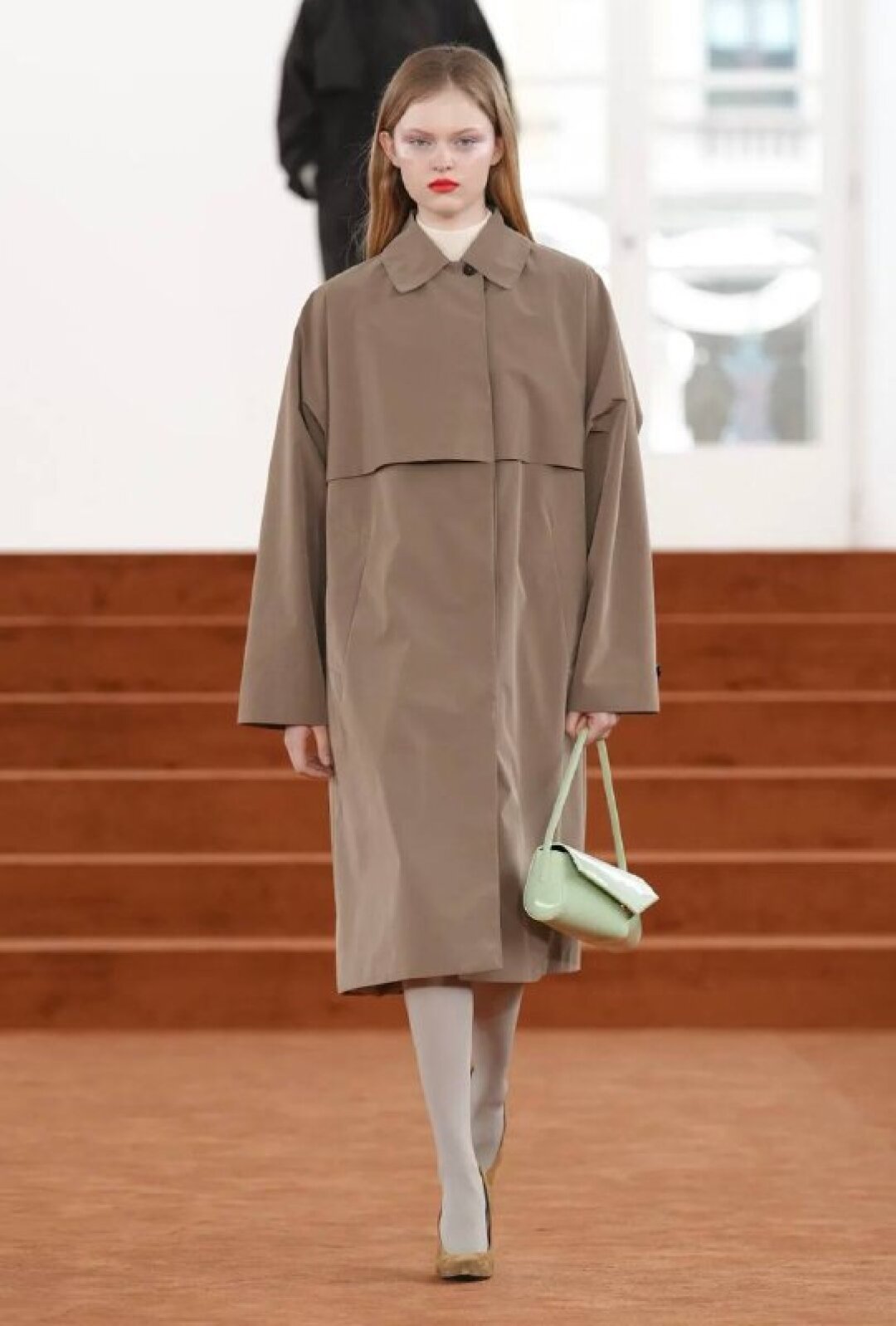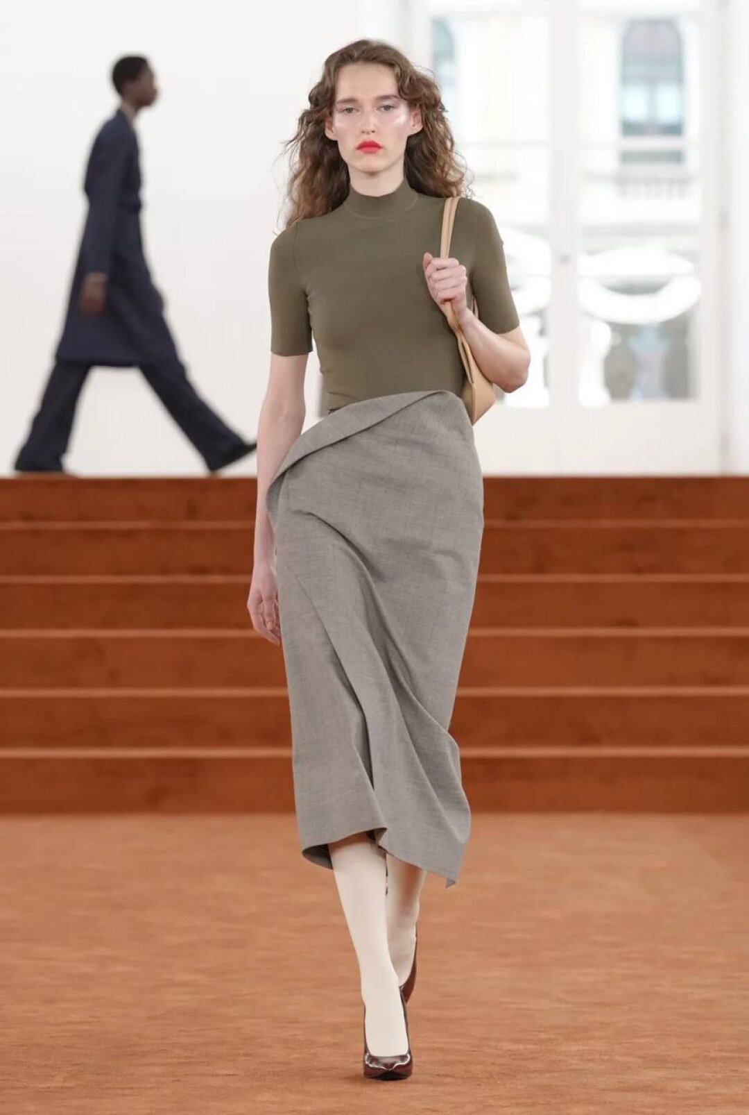 Чистый, почти стерильный минимализм, который был в центре предыдущей коллекции Jil Sander, Беллотти разбавил еле заметной небрежностью. Так, из-под безупречно сидящего жакета торчал лишь один край воротника рубашки, верх платья-футляра спадал, топорщась, на плечи, у строгих юбок-карандашей появились спонтанные отвороты и акцентные симметричные разрезы (поднимались выше, чем позволил бы офисный дресс-код!), а объемные баллоны будто случайно заправили с одной стороны в колготки.