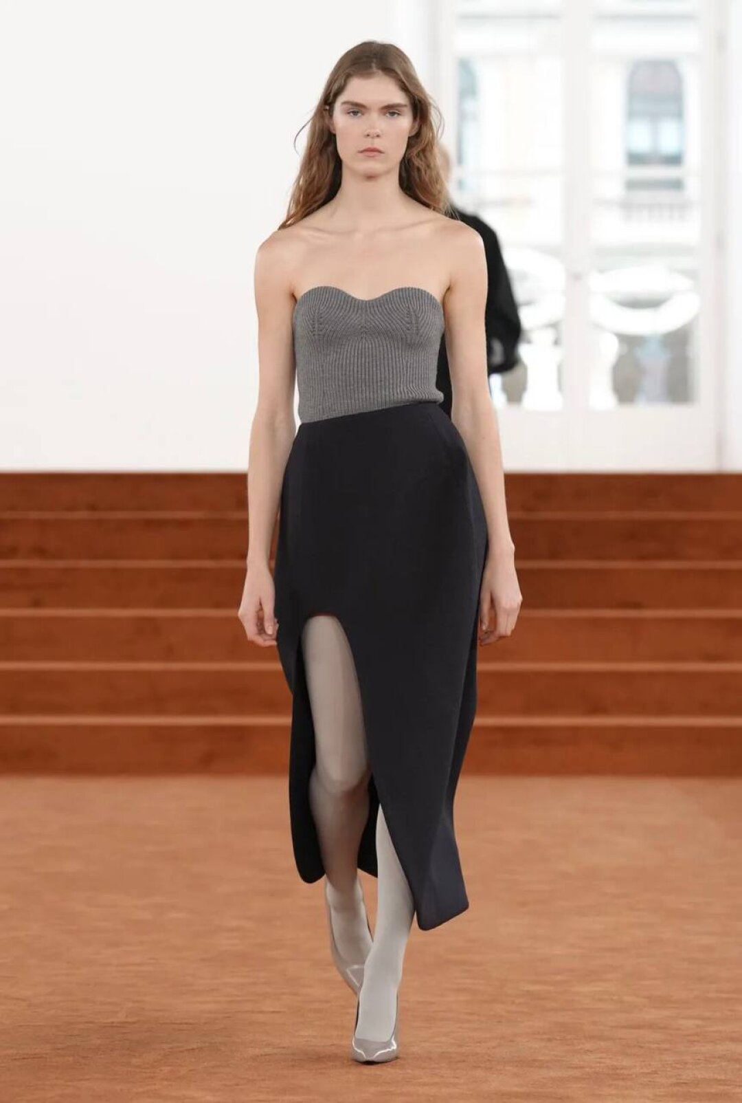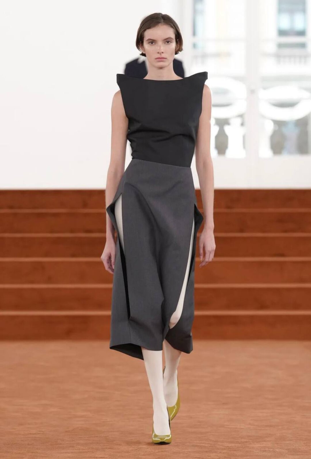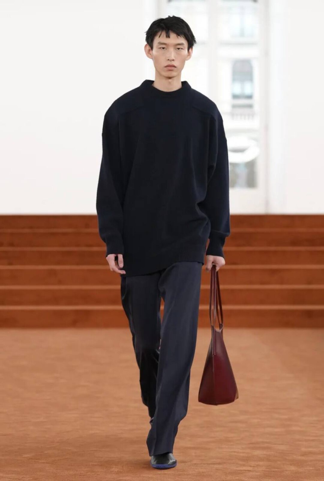Чистый, почти стерильный минимализм, который был в центре предыдущей коллекции Jil Sander, Беллотти разбавил еле заметной небрежностью. Так, из-под безупречно сидящего жакета торчал лишь один край воротника рубашки, верх платья-футляра спадал, топорщась, на плечи, у строгих юбок-карандашей появились спонтанные отвороты и акцентные симметричные разрезы (поднимались выше, чем позволил бы офисный дресс-код!), а объемные баллоны будто случайно заправили с одной стороны в колготки.