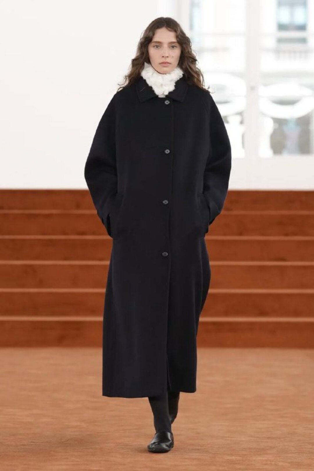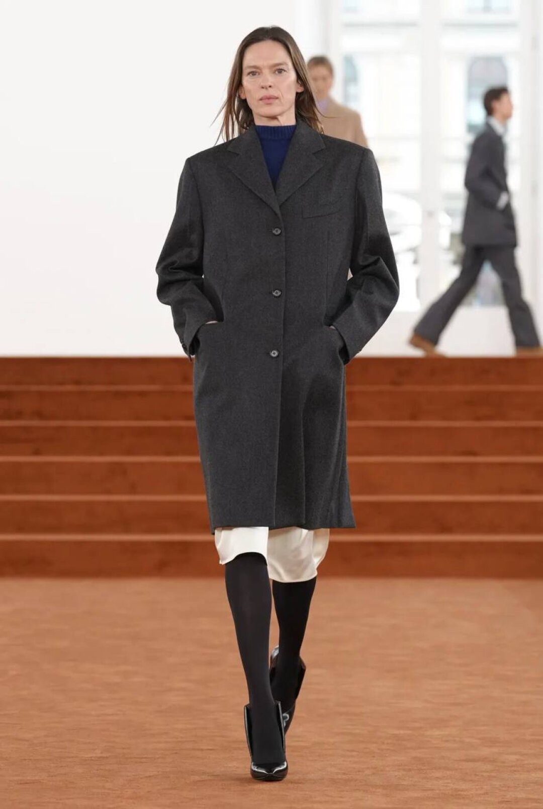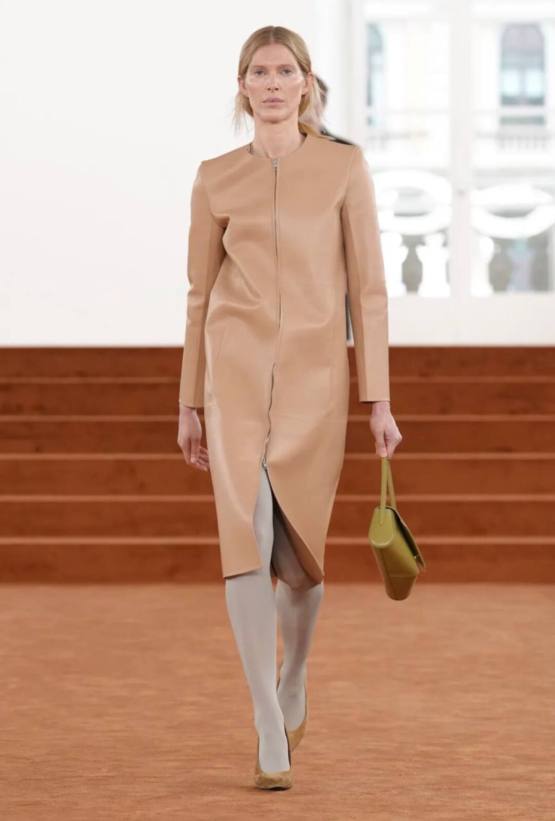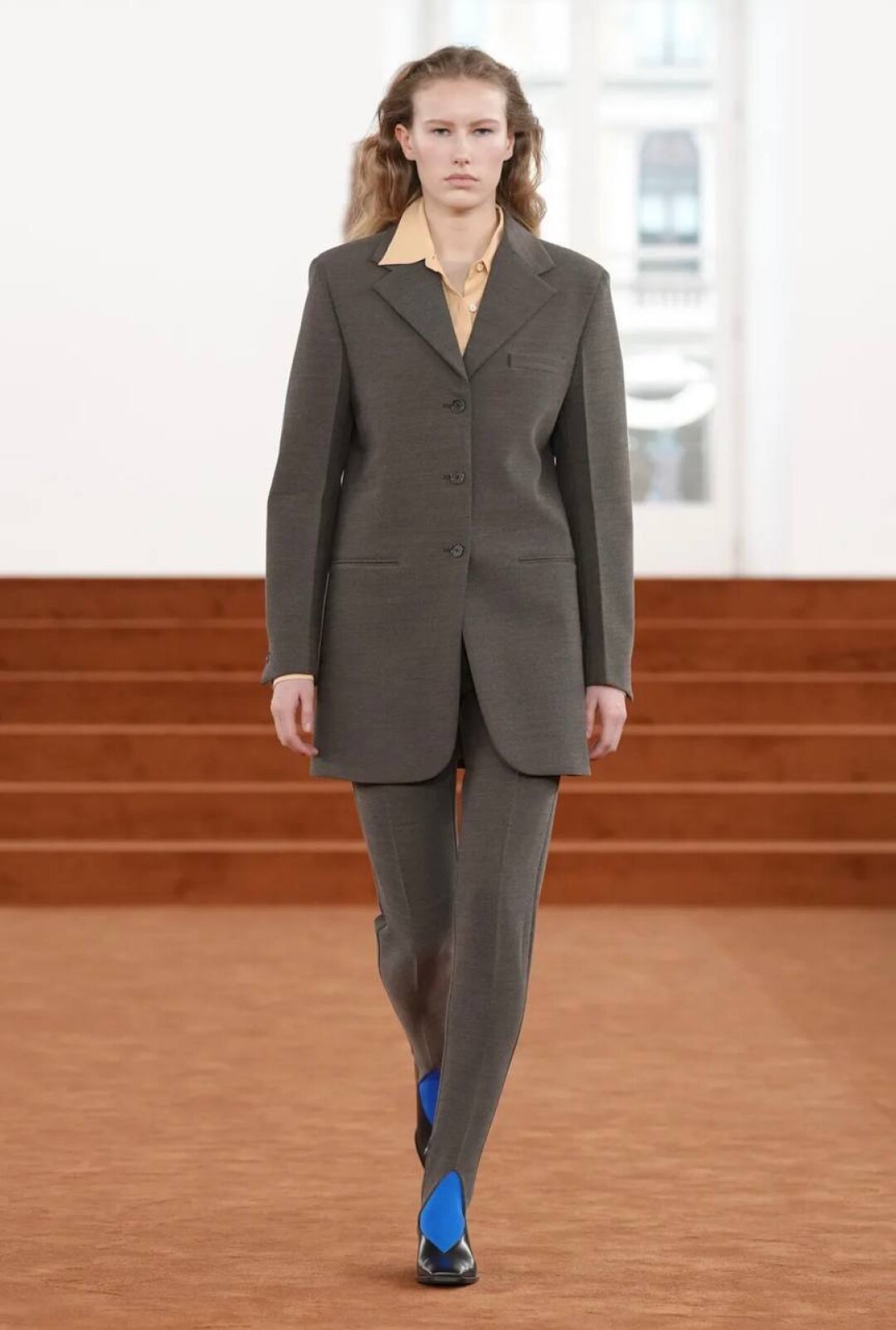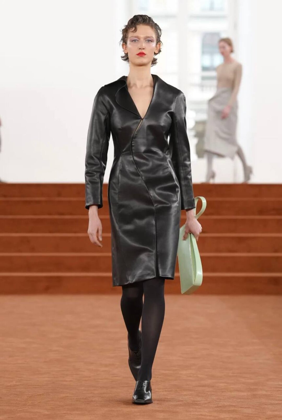 От прежней униформенности коллекцию сезона FW’26 уводят и торчащие из-под пиджаков и пальто пернатые манжеты рубашек и воротники, а заметно поношенные замшевые ботинки возвращают застегнутый на все пуговицы total black в реальный мир. О жизни напоминают и пухлые жаккардовые мини-платья, отсылающие к диванам и креслам, которые когда-то отец Беллотти вручную обтягивал тканью. Из похожего материала худрук отшил нарядные рубашки, которые замиксовал с неожиданной леопардовой юбкой. Несмотря на то, что вещь с принтом на подиуме была всего лишь одна (не считая лакированных вау-туфель в пестрый горошек!), Симоне поэкспериментировал с цветом и вдумчиво расставил небольшие акценты — серый костюм дополнил ультрамариновыми носками, лиловую водолазку оставил торчать из-под бежевого пальто, в пару к платью из черной кожи добавил мятную сумку.