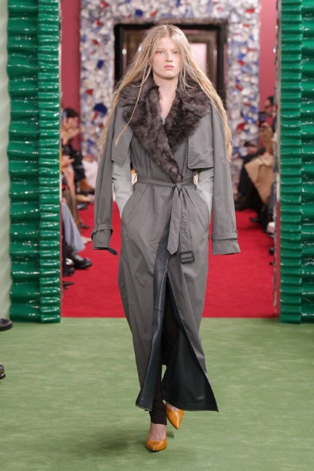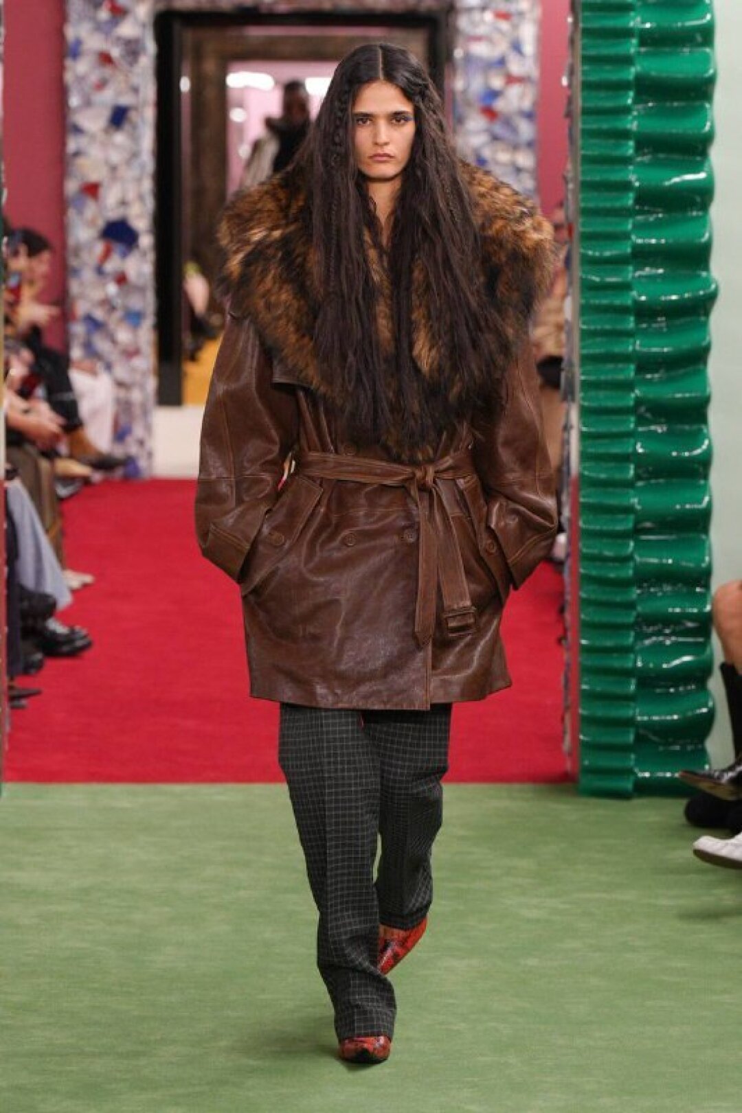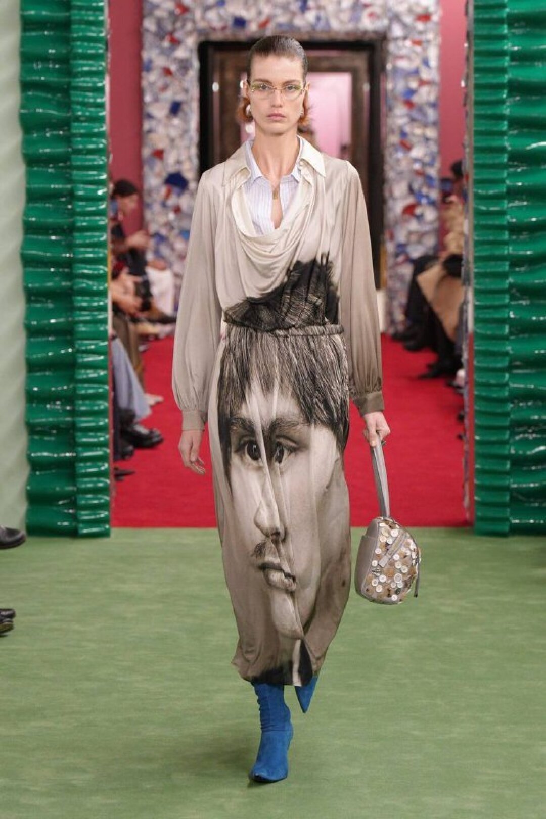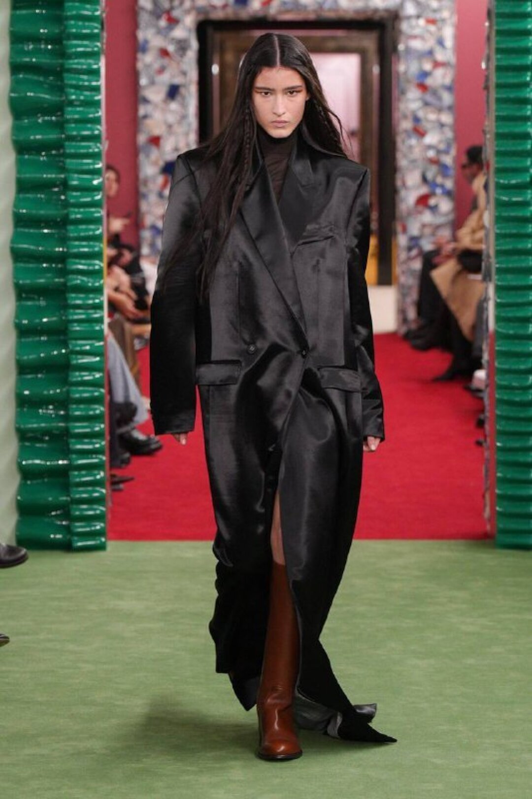 Важный микротренд — юбки и платья с принтами-портретами (до этого видели в коллекции Prada FW'26 и весенне-летнем дропе российского Sanchy!). Для Acne Studios креативный директор Джонни Йоханссон сочинил строгие юбки-карандаши и струящиеся миди-платья. Плюс: худрук ворвался во всеобщую fur-манию с остроносыми сапогами-чулками с меховой оторочкой, ультрапушистыми горжетками и плащами с волосатыми лацканами.