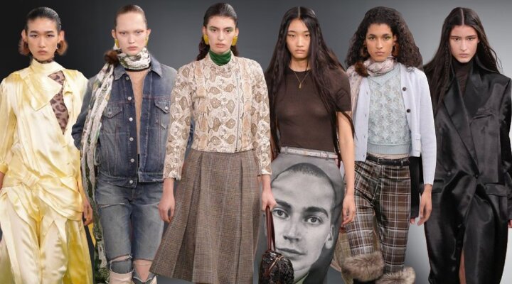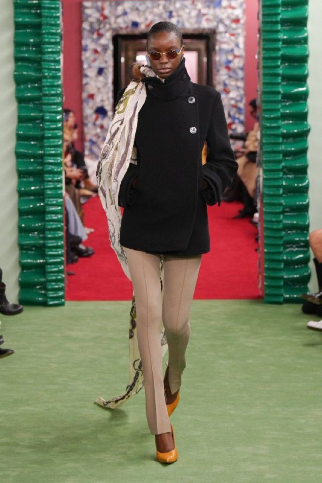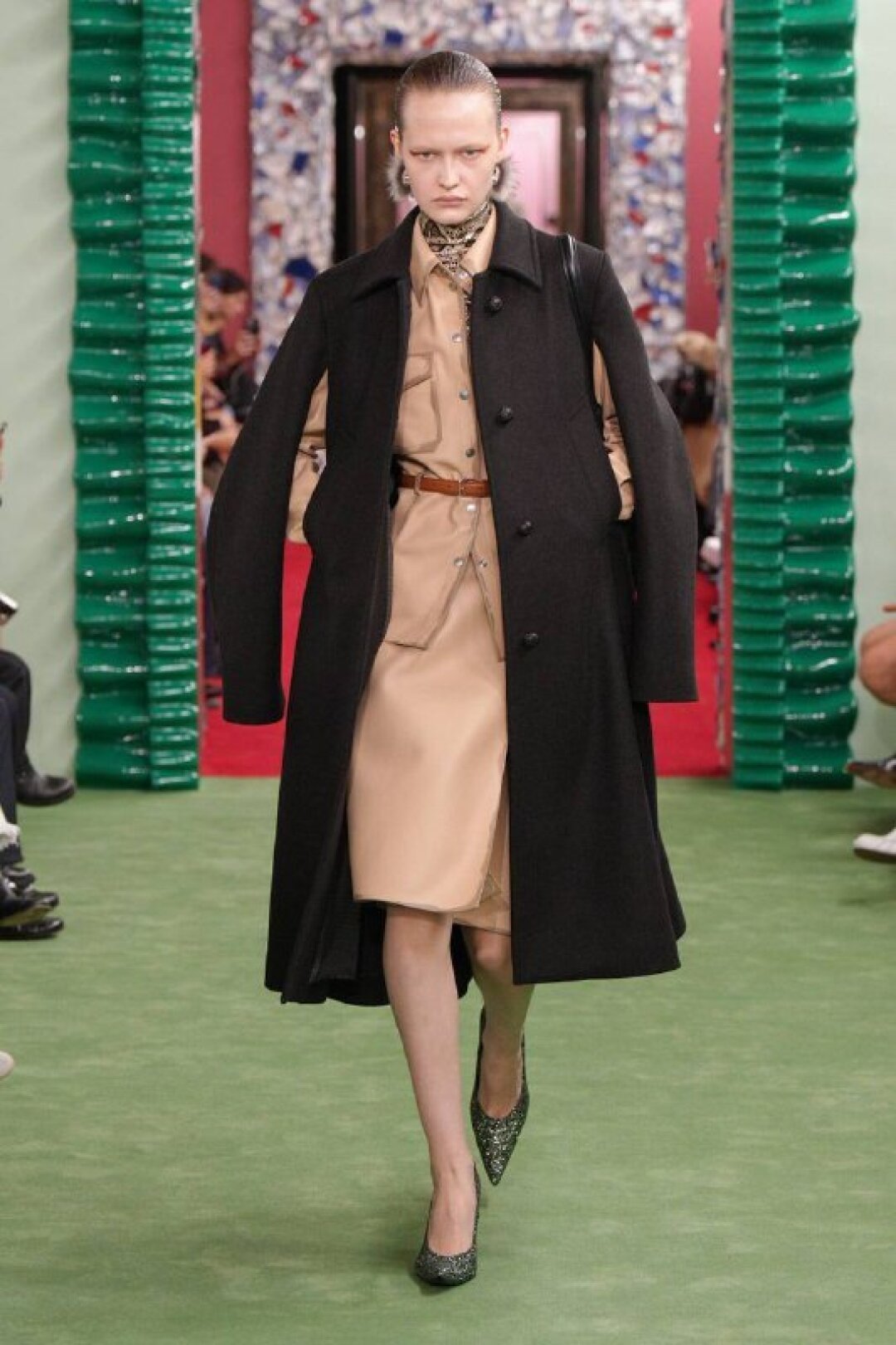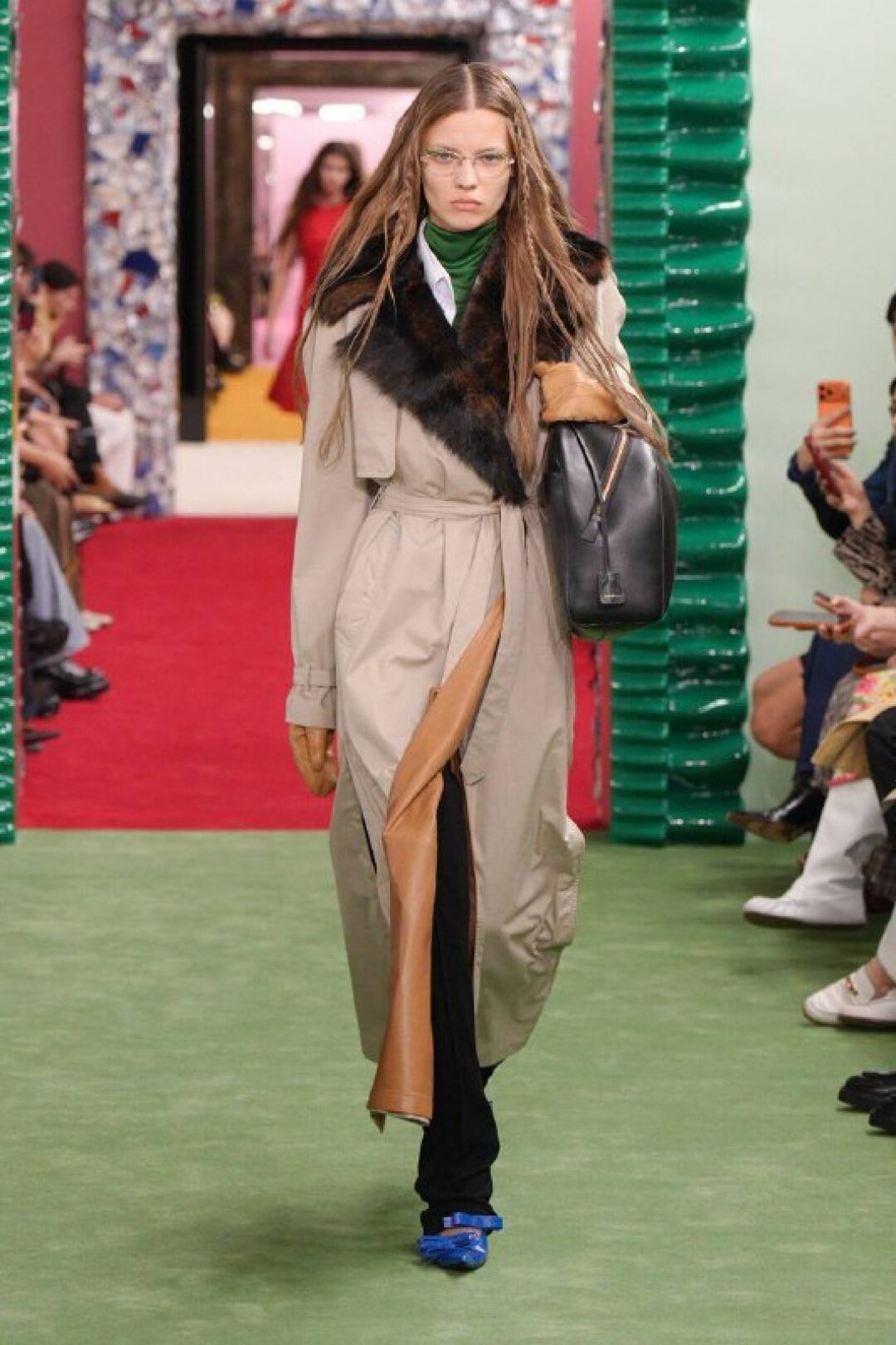 Важный микротренд — юбки и платья с принтами-портретами (до этого видели в коллекции Prada FW'26 и весенне-летнем дропе российского Sanchy!). Для Acne Studios креативный директор Джонни Йоханссон сочинил строгие юбки-карандаши и струящиеся миди-платья. Плюс: худрук ворвался во всеобщую fur-манию с остроносыми сапогами-чулками с меховой оторочкой, ультрапушистыми горжетками и плащами с волосатыми лацканами.