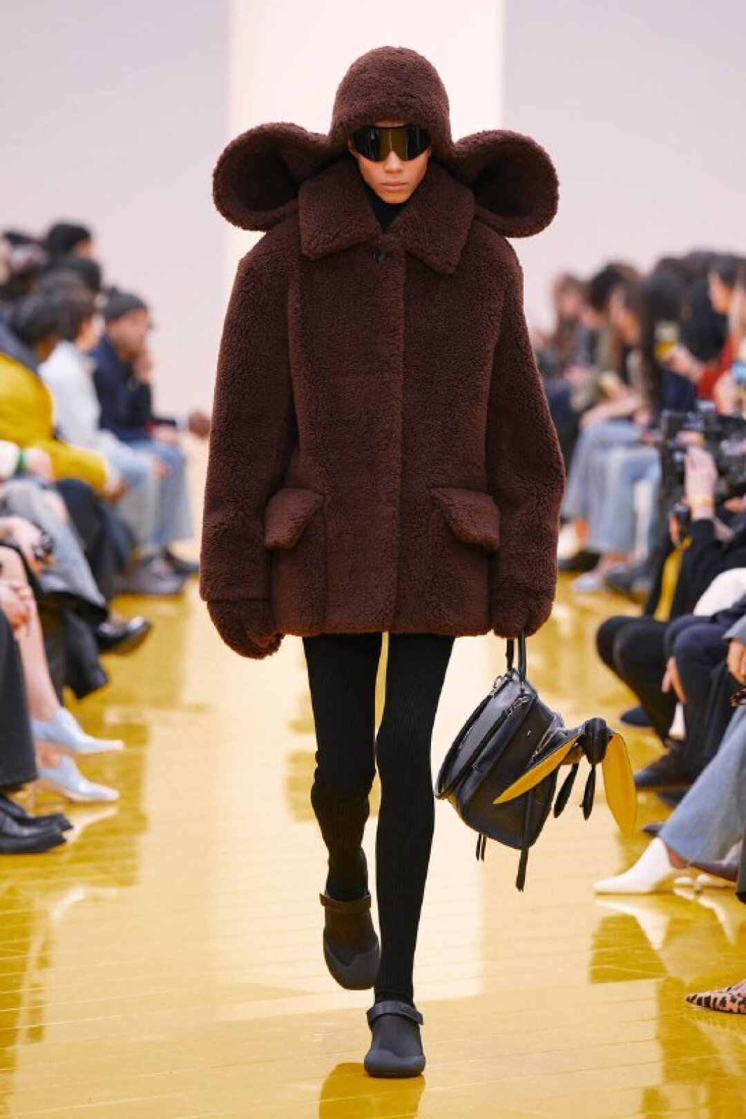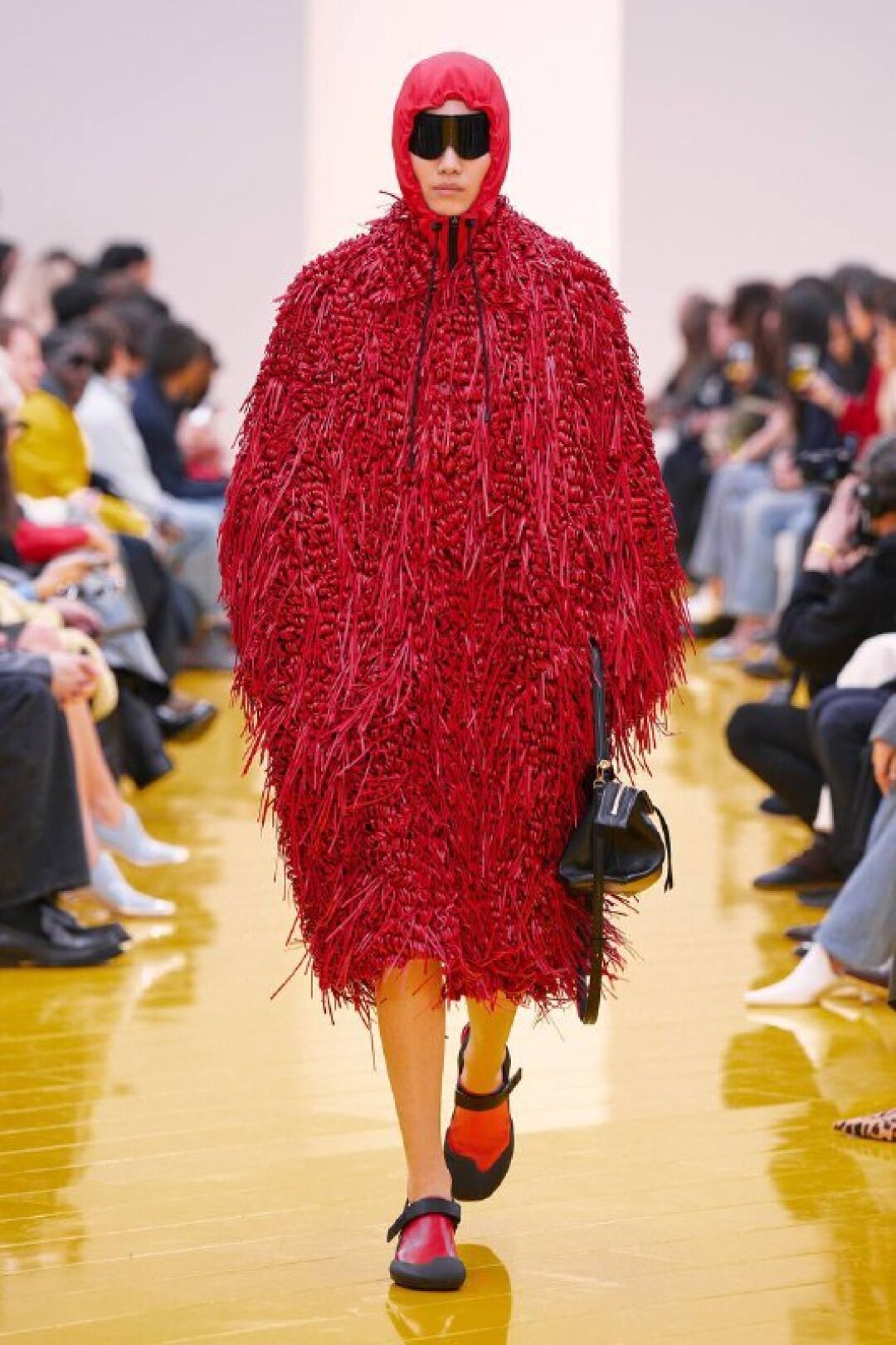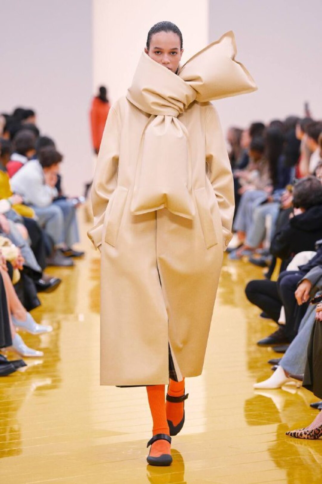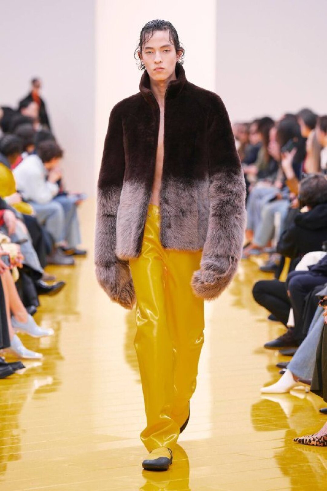 И если о необходимости шубы (чем пушистее, тем лучше!) в следующем сезоне сказал каждый, то фэшн-дуэт Джека Маккалоу и Лазаро Эрнандеса напомнили о важности аутдорных пуховиков и парок — будем носить с ворсистыми мини-платьями и колготками в рубчик, а еще — с куцыми костюмными брюками (супертренд!). Фиксируем любовь дизайнеров к винилу: недавно Хайдер Акерманн показал прозрачные юбки и плащи в духе «Американского психопата», а худруки Loewe вывели на подиум дофаминовых двойников Патрика Бейтмана в пестрых ПВХ-комбинациях, лонгсливах и брюках.