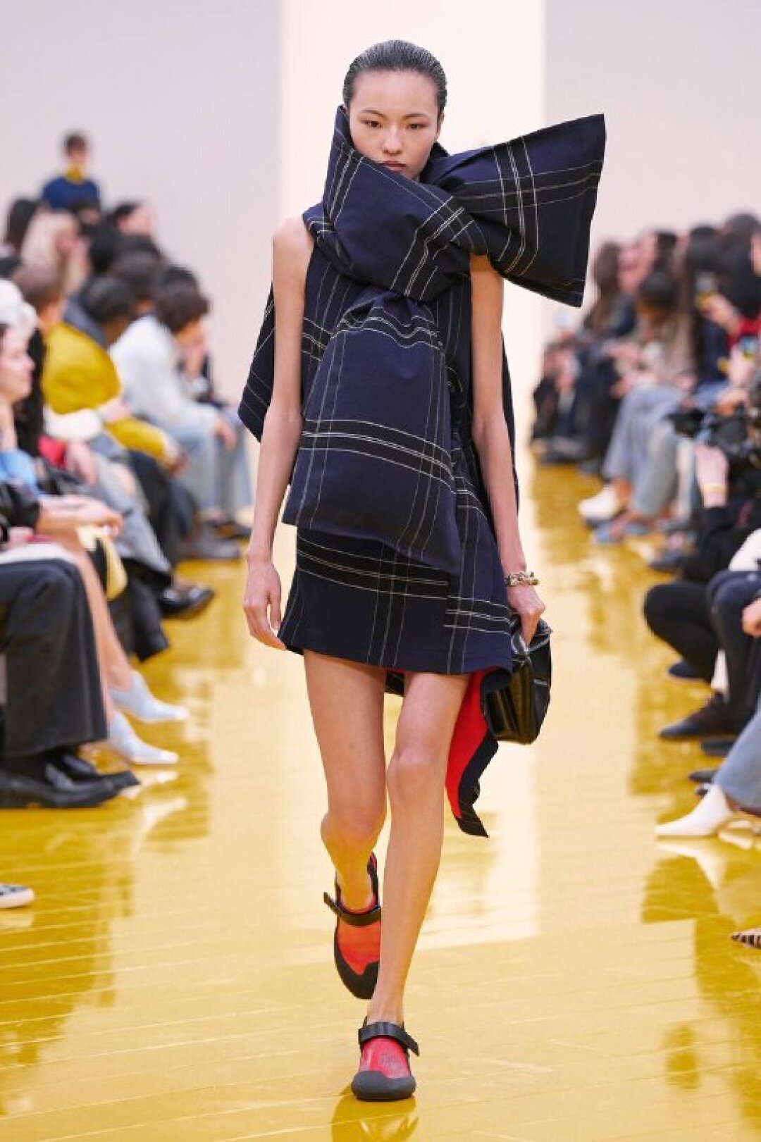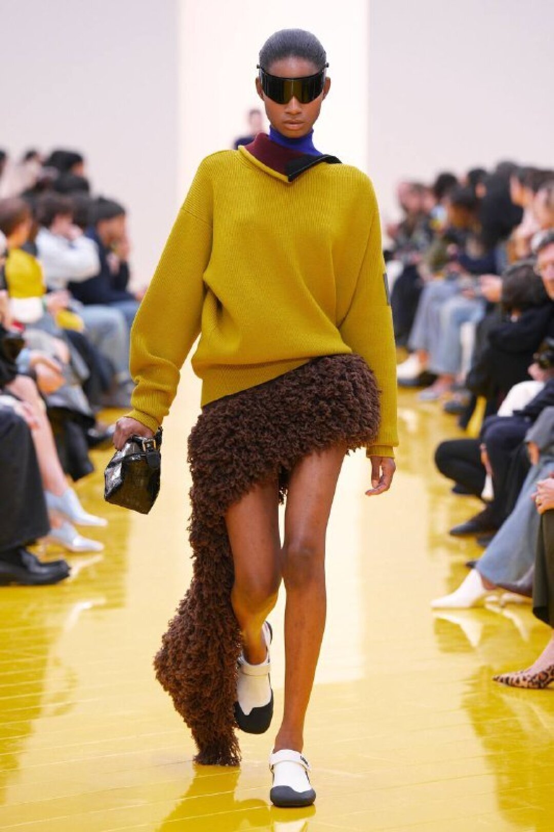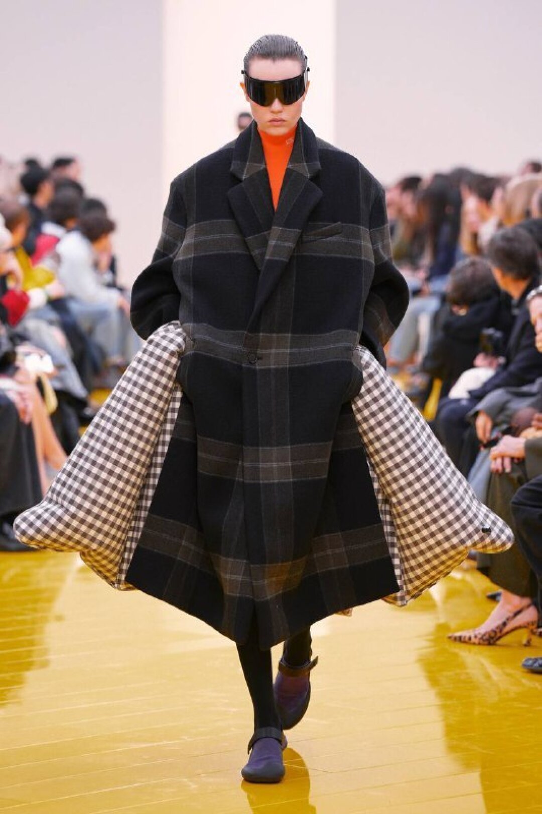 Главная юбка года — асимметричная (заверено Джонатаном Андерсеном во время показа Christian Dior FW'26!). Маккалоу и Эрнандес решили объединить два гранд-тренда и создали вязаные мини со шлейфами и торчащими кучерявыми нитками. Плюс: объявляем вторую волну клетко-мании. К следующей осени пополняем коллекцию тартан-джемперами (миксуем с виши-рубашкой и строгим офискорным костюмом!), геометрик-пальто и après-ski-свитерами сразу с несколькими видами клетки. От горнолыжной эстетики коллекции достались не только верхняя одежда и трикотаж, но и нейлоновые капюшоны и массивные очки-маска, которые сочетали буквально со всем — от цветочных лонгсливов (из глянцевого технологичного материла, напоминающего кожу) до сливочных дубленок и тедди-шуб.