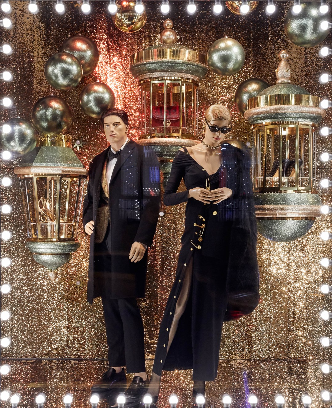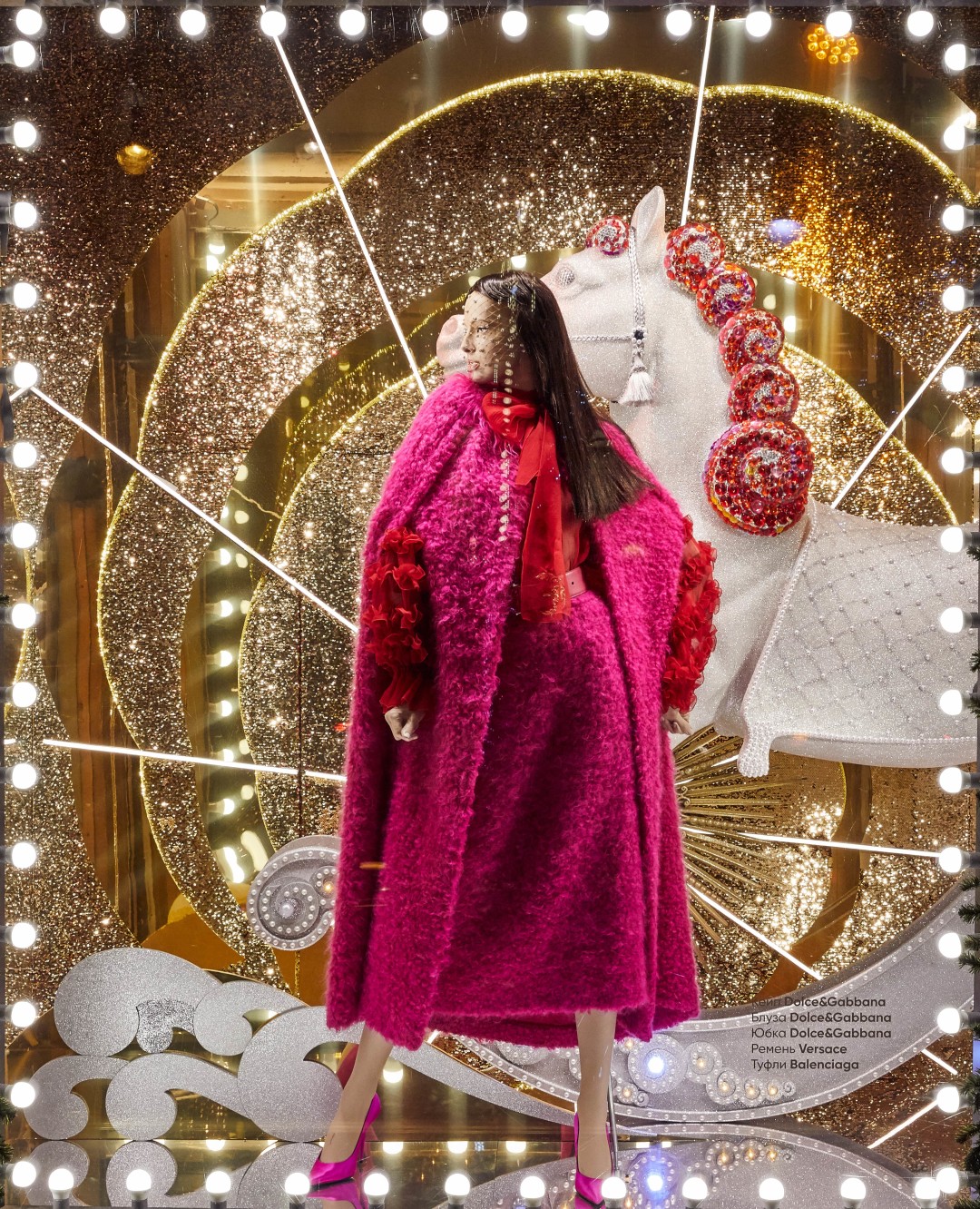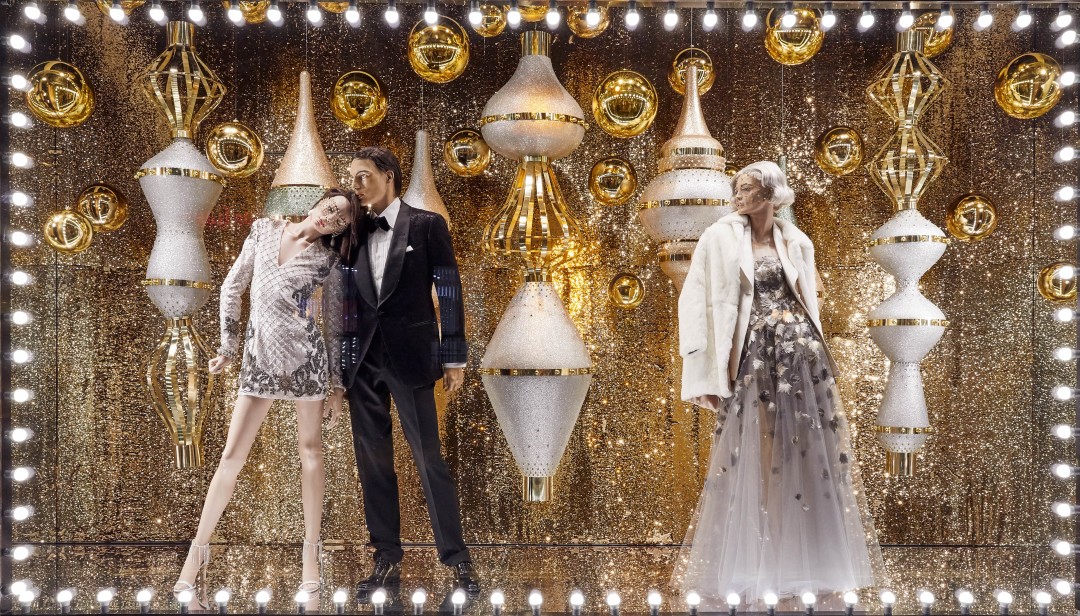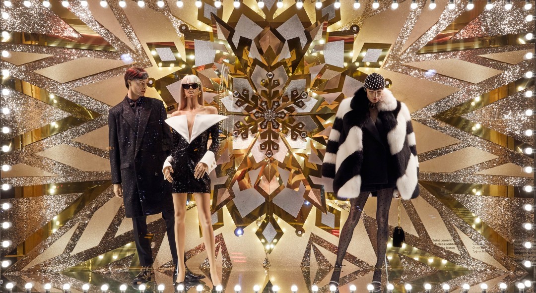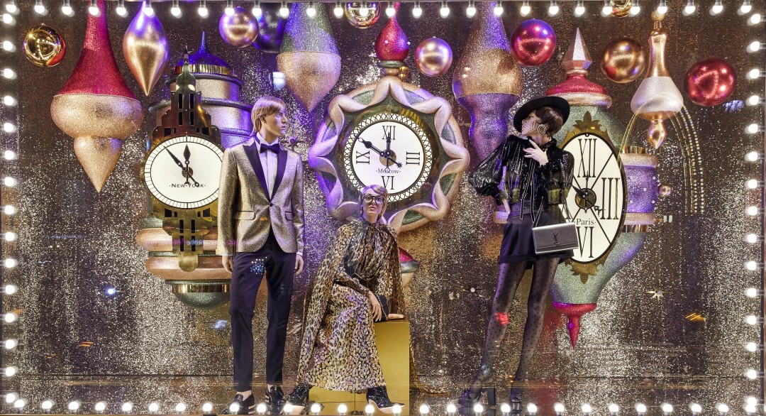 Источником вдохновения для композиций стали сказки, старинные открытки и личные воспоминания художников, связанные с детством. И действительно, присмотревшись к витринам, можно обнаружить среди застывших героев Снежную Королеву в платье Dries Van Noten на фоне сумок Celine и Золушку в Versace вместе с принцем и золотыми туфельками в елочных игрушках-фонарях. Дополняют картину (и создают праздничное настроение!) зеркальные отражения и часы, которые вот-вот пробьют двенадцать, а также обилие глиттера, латуни и кристаллов.