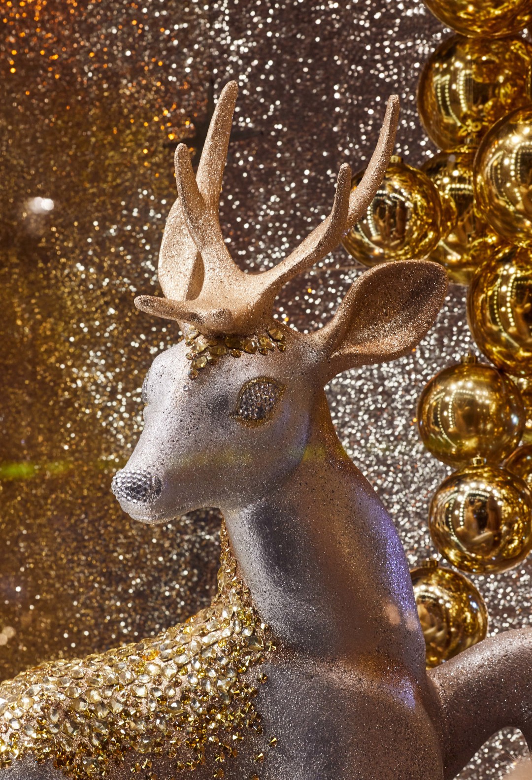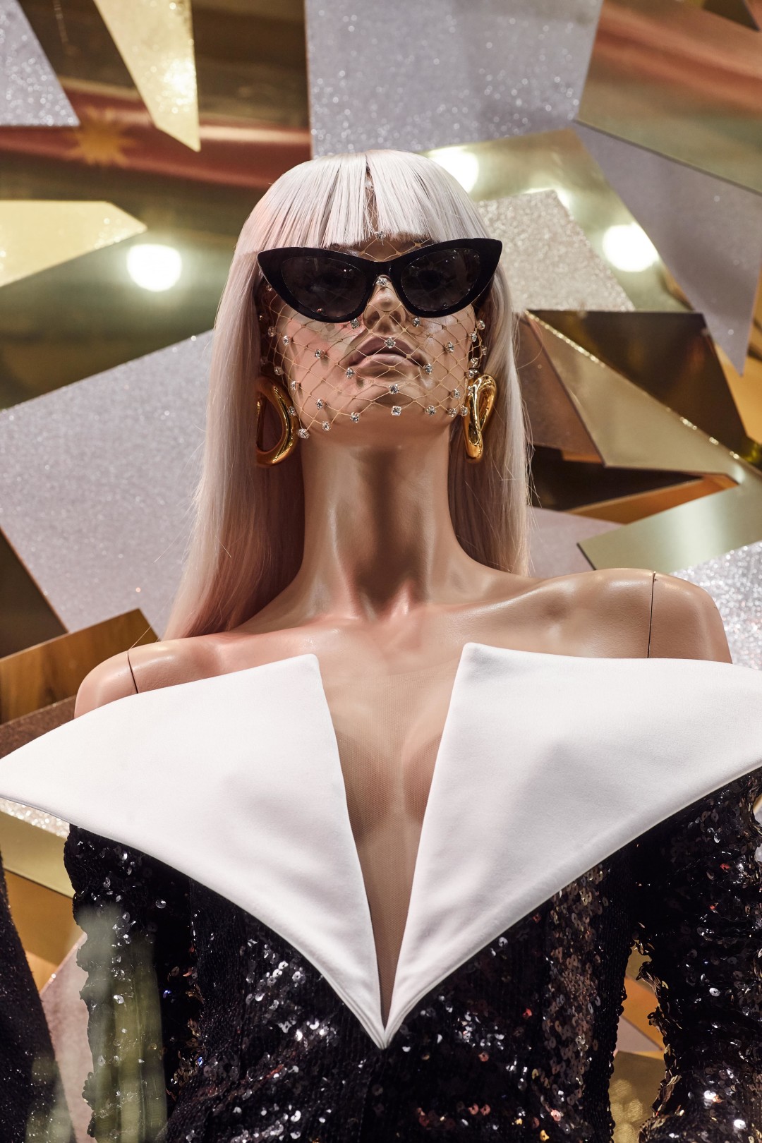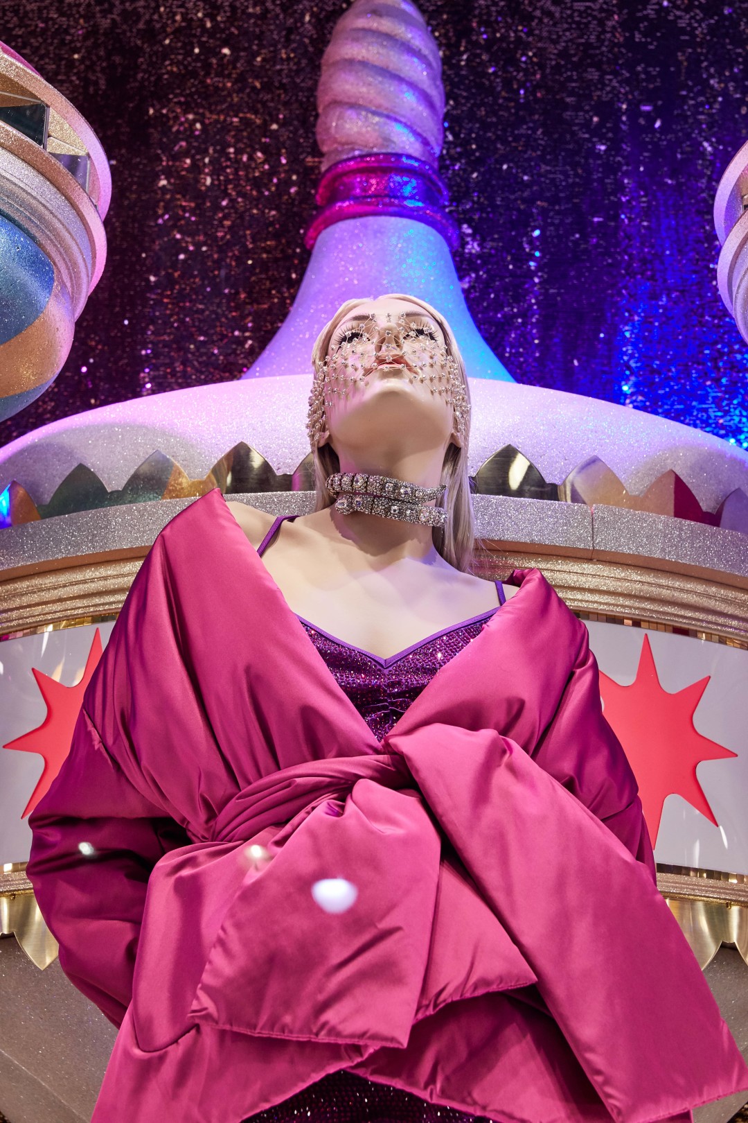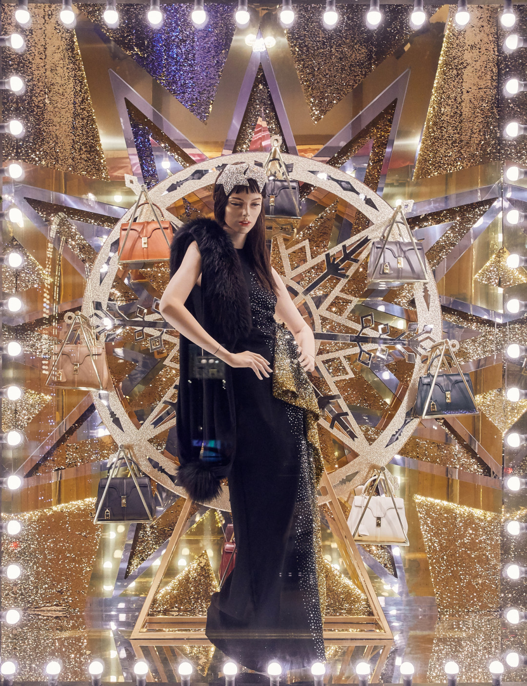 Источником вдохновения для композиций стали сказки, старинные открытки и личные воспоминания художников, связанные с детством. И действительно, присмотревшись к витринам, можно обнаружить среди застывших героев Снежную Королеву в платье Dries Van Noten на фоне сумок Celine и Золушку в Versace вместе с принцем и золотыми туфельками в елочных игрушках-фонарях. Дополняют картину (и создают праздничное настроение!) зеркальные отражения и часы, которые вот-вот пробьют двенадцать, а также обилие глиттера, латуни и кристаллов.
