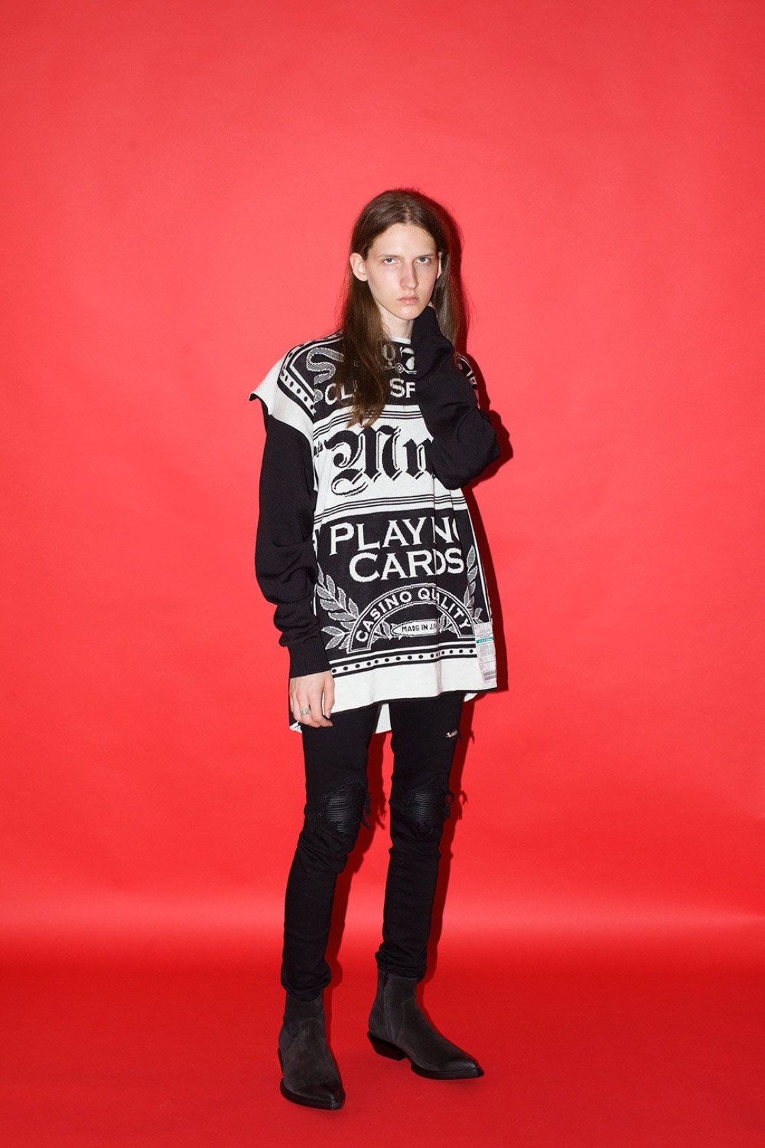 В новой коллекции молодой дизайнер Михара Ясухиро концентрируется на реконструированных и детализированных моделях одежды и аксессуаров. Вдохновившись искусством аутсайдеров, прогрессивный японец из двух рубашек кроит одну, а потом пришивает к ней галстук, подтяжки или поясную сумку. Среди хитов – соединенные с футболками худи и созданные из нескольких пар джинсы. Кроме того, для этой линейки Ясухиро разработал принты коробок с игральными картами и кубиками, колеса рулетки, лотерейные билеты и логотипы несуществующих компаний, которые он нанес практически на каждую вещь.