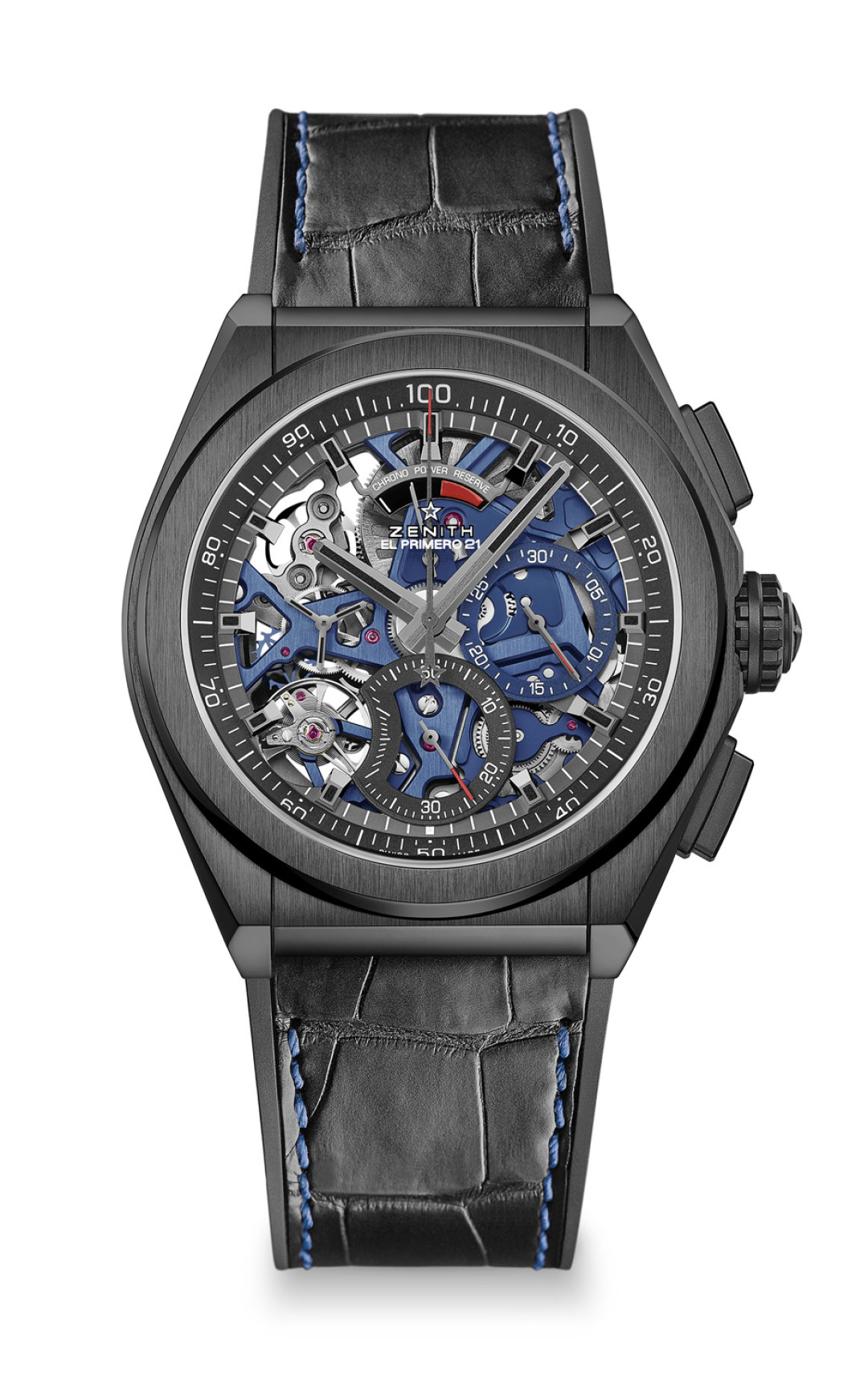 Серия из 250 сверхточных хронографов, способных замерять сотые доли секунды, выпущена во впечатляющем 44-миллиметровом корпусе из керамики полуночного черного цвета. А часть открытого механизма окрашена в фирменный «синий электрик» Zenith Blue.