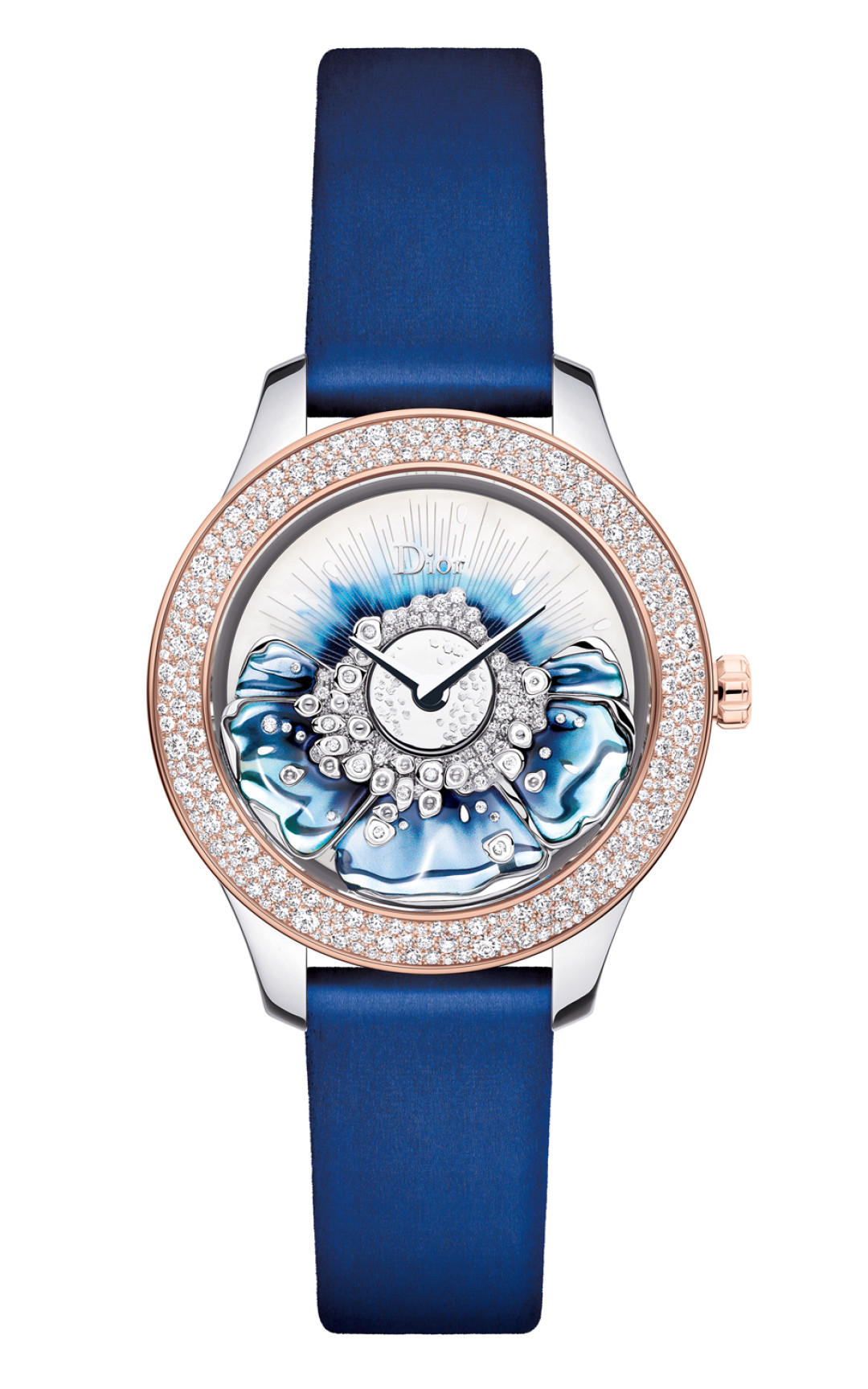 Это не просто синие лепесточки из полупрозрачной керамики, белого золота и бриллиантов — это вынесенный на циферблат ротор механического калибра Dior Inverse 11½. Его движения обеспечивают часам подзавод, а в покое запаса хода хватит на 48 часов.