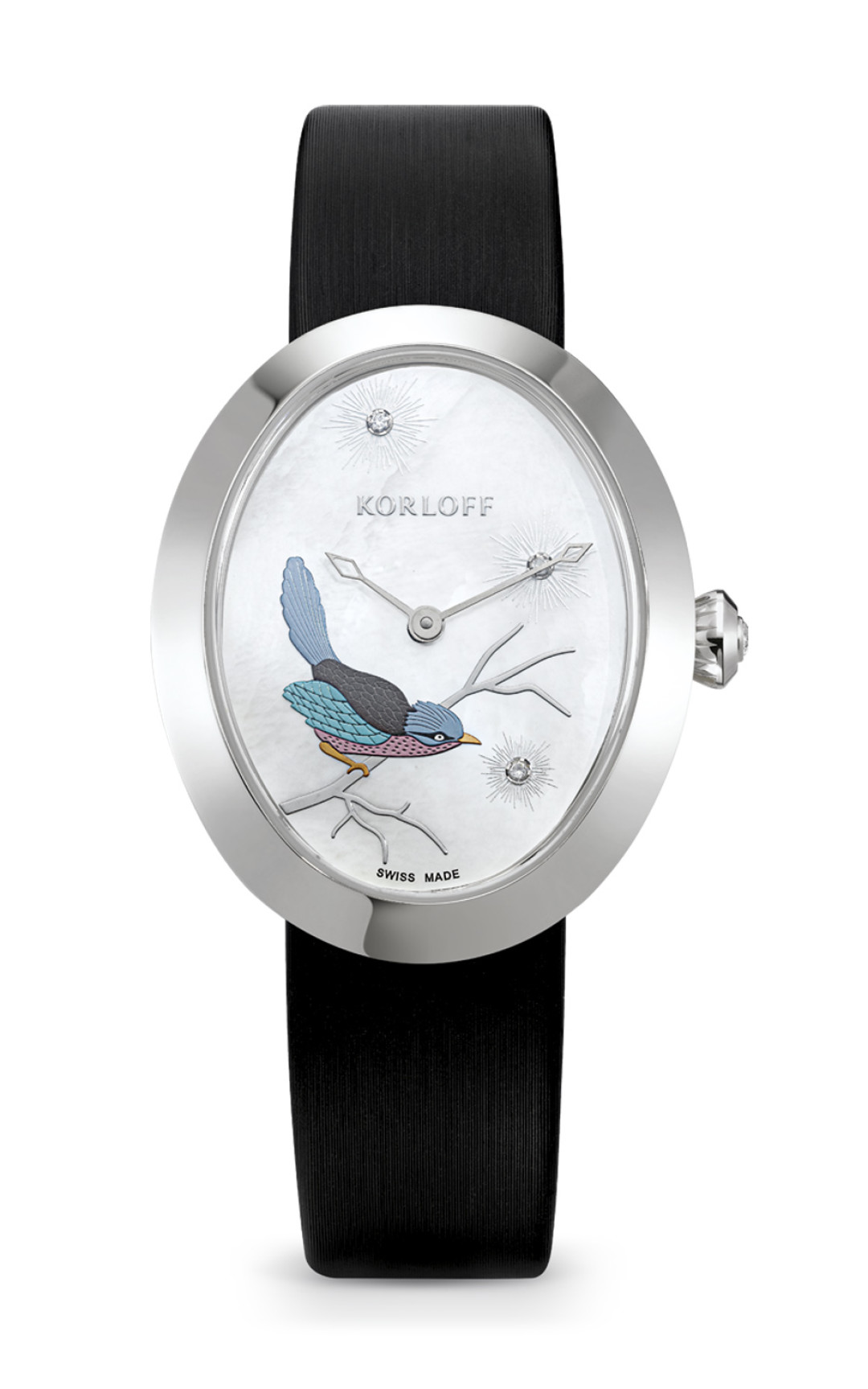 Как сделать, чтобы перелетные птицы досрочно вернулись с юга? Покрошить бриллиантами, например. Блеск 0,7 карата подманил одну прямо на перламутровый циферблат кварцевых часов в корпусе из стали.
