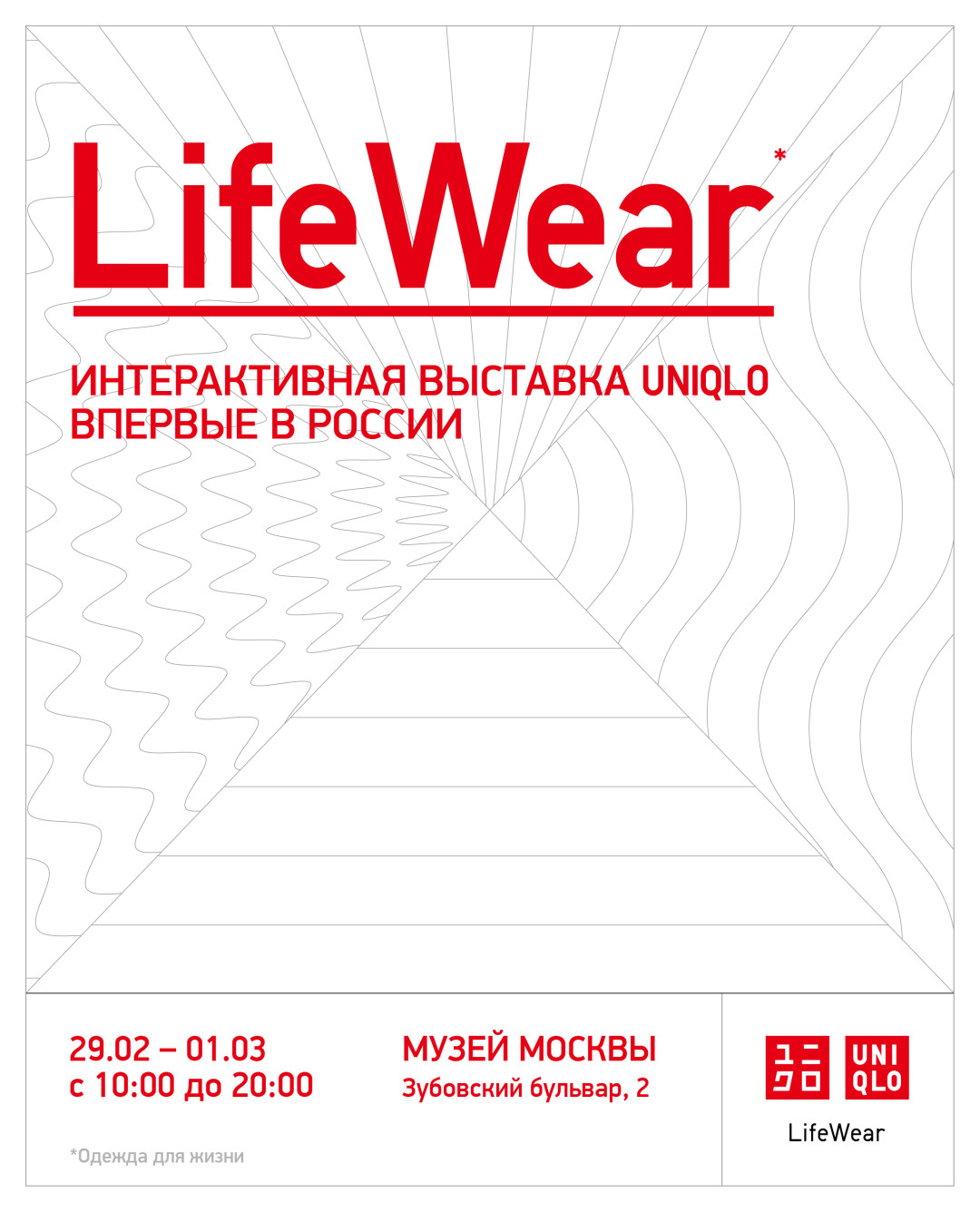 Японская сеть магазинов UNIQLO впервые в России проведет интерактивную выставку LifeWear. Экспозиция будет действовать в Музее Москвы два дня, с 29 февраля по 1 марта, и раскроет концепцию бренда, основанную на взаимосвязях человека, высоких технологий и окружающей среды. Вход бесплатный, а подробности можно найти по ссылке.
