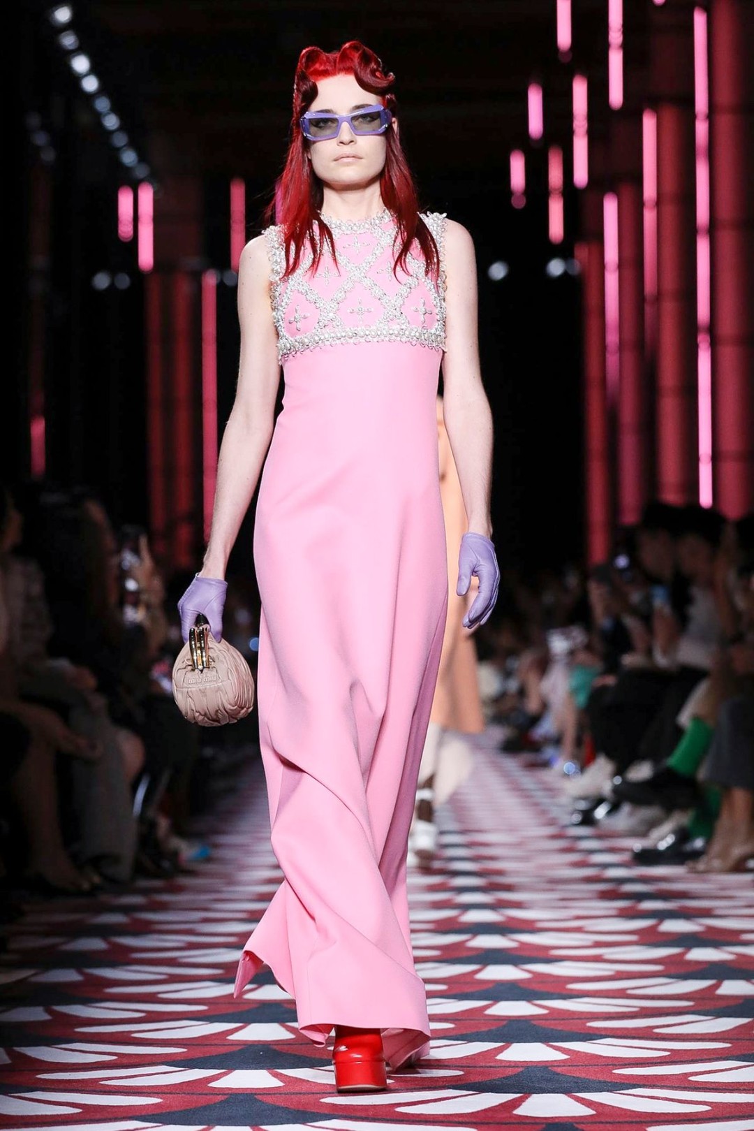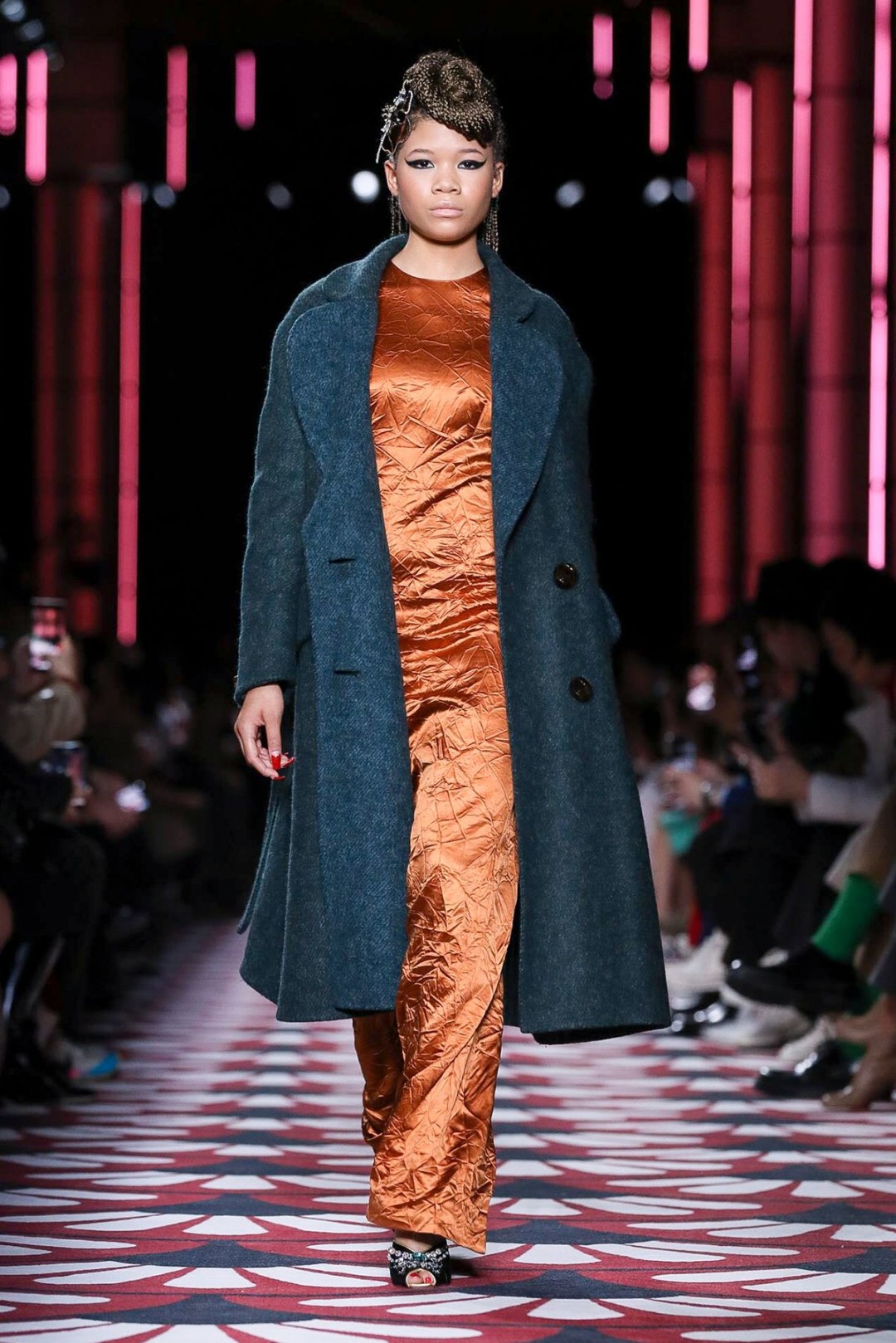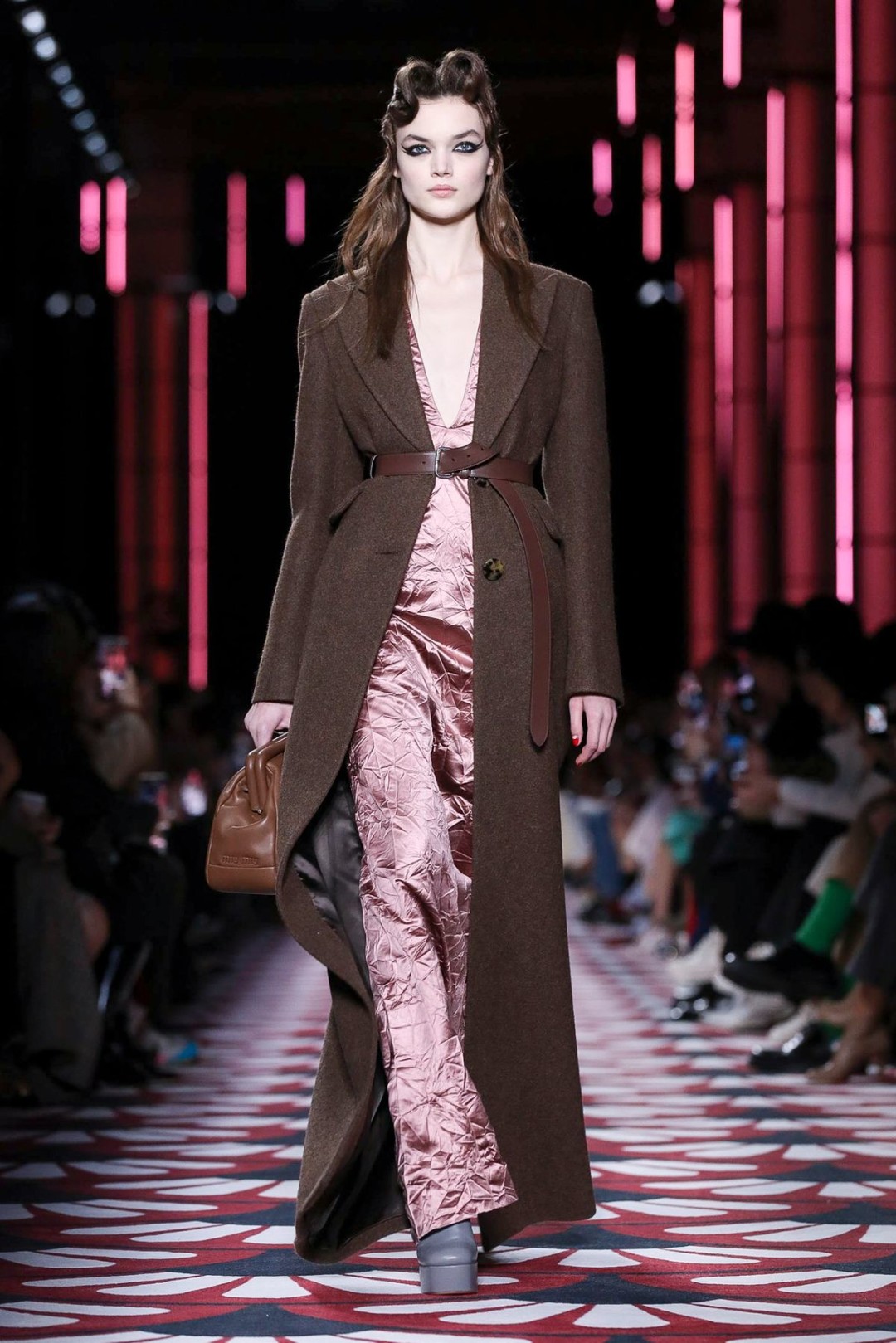 Миучча Прада (недавно пригласившая Рафа Симонса стать со-креативным директором Prada) показала в парижском Palais d'lena осенне-зимнюю коллекцию Miu Miu. Открывая шоу и задавая общий лейтмотив, первыми на подиум вышли модели в платьях из крэш-ткани и с ретро-прическами, украшенными цветными заколками причудливой формы.