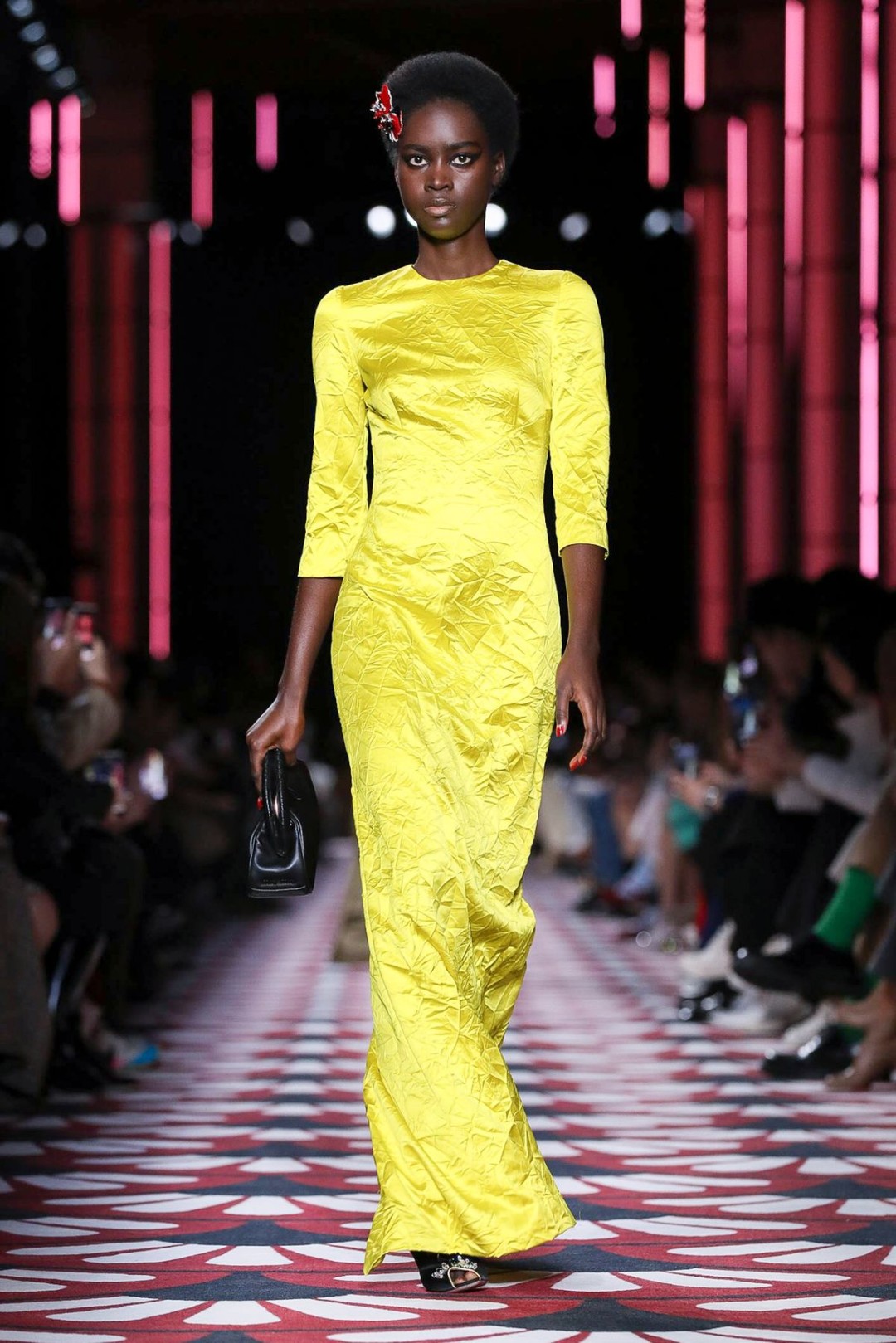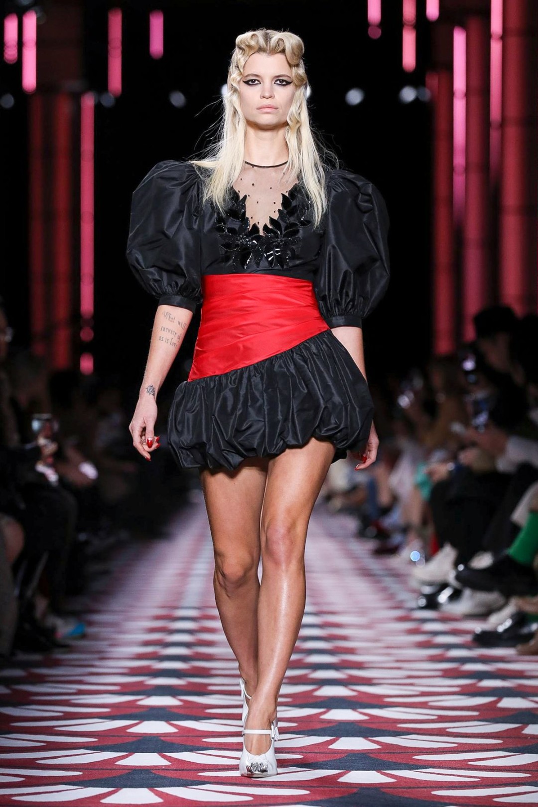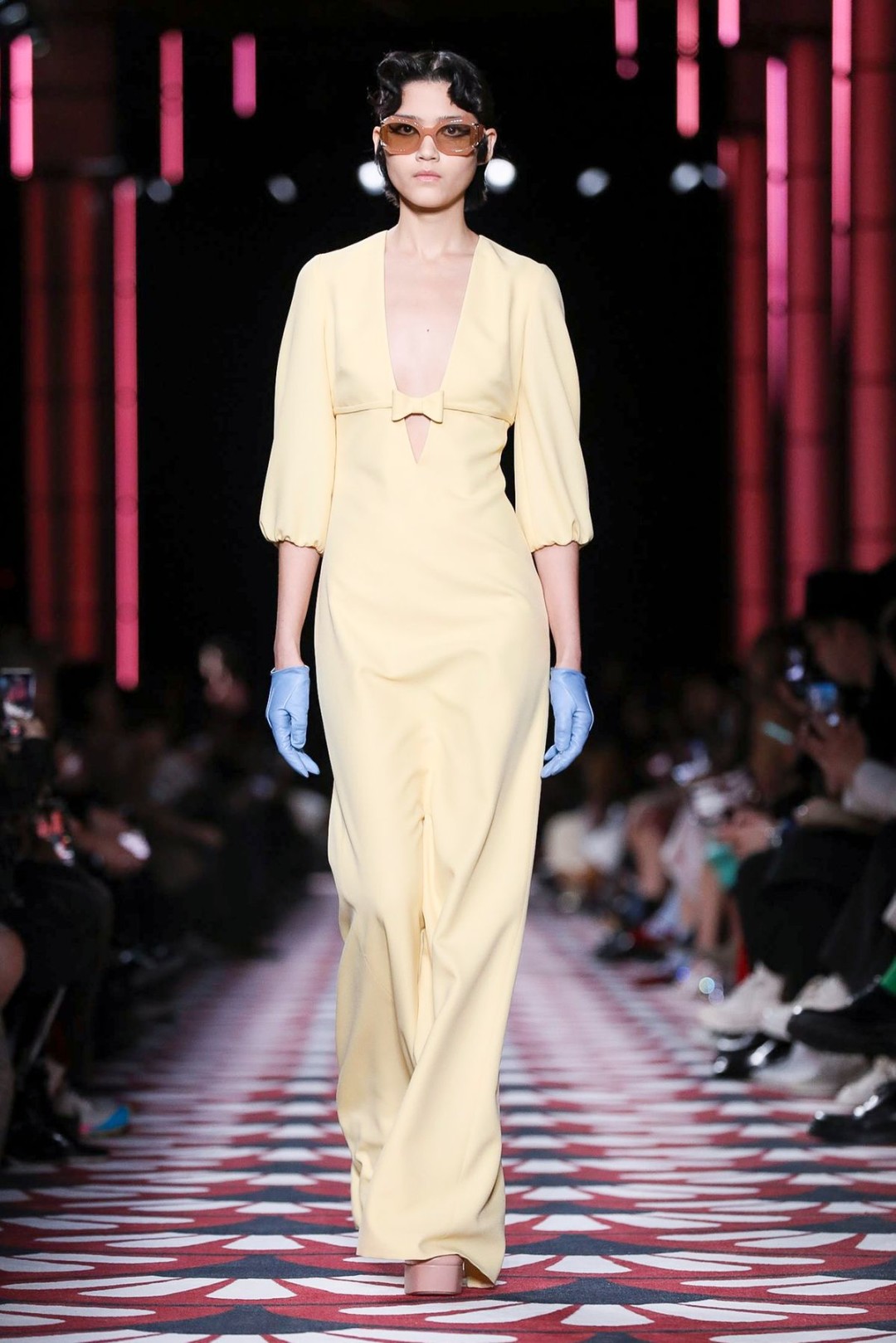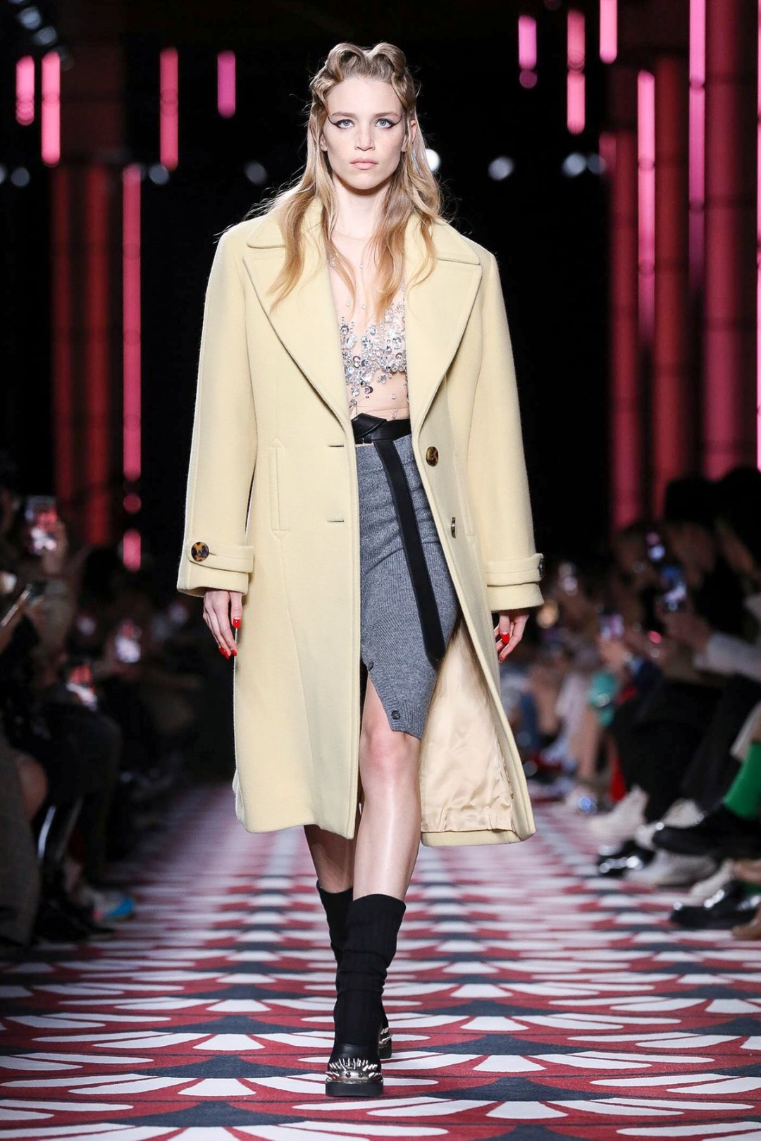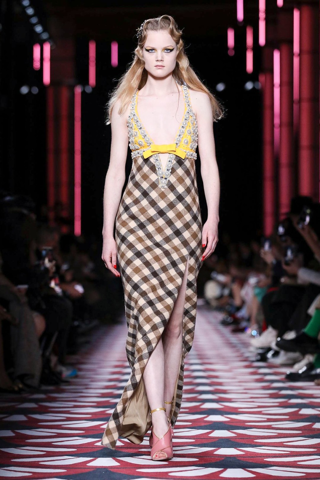 Винтажное настроение продолжили пальто с отложным воротником (как у Франсуазы Арди), черно-белая клетка (в стиле Брижит Бардо) и укороченные платья Кармен, перетянутые на талии красным платком (Джеральдина Фаррар в 1915 году оценила бы длину!). Белла Хадид в вязаном боди с поясом, стилизованном под матросскую форму, была похожа на современный ремейк девушки мореплавателя 20-го века.