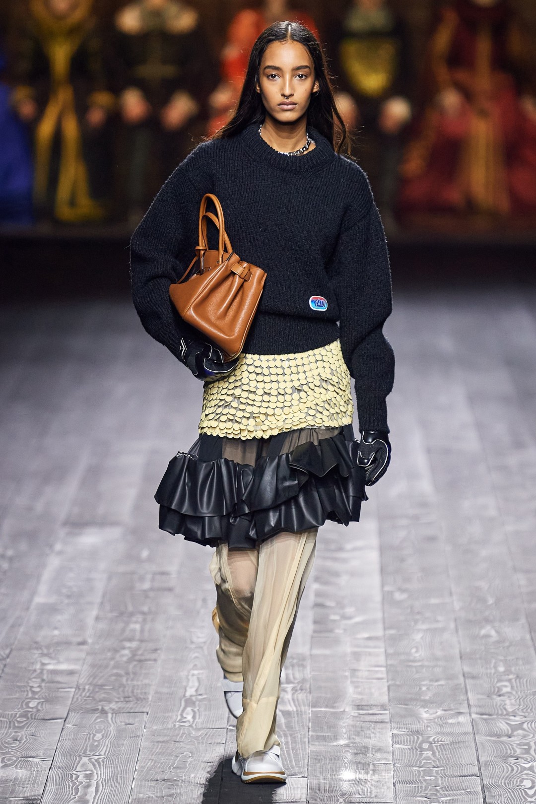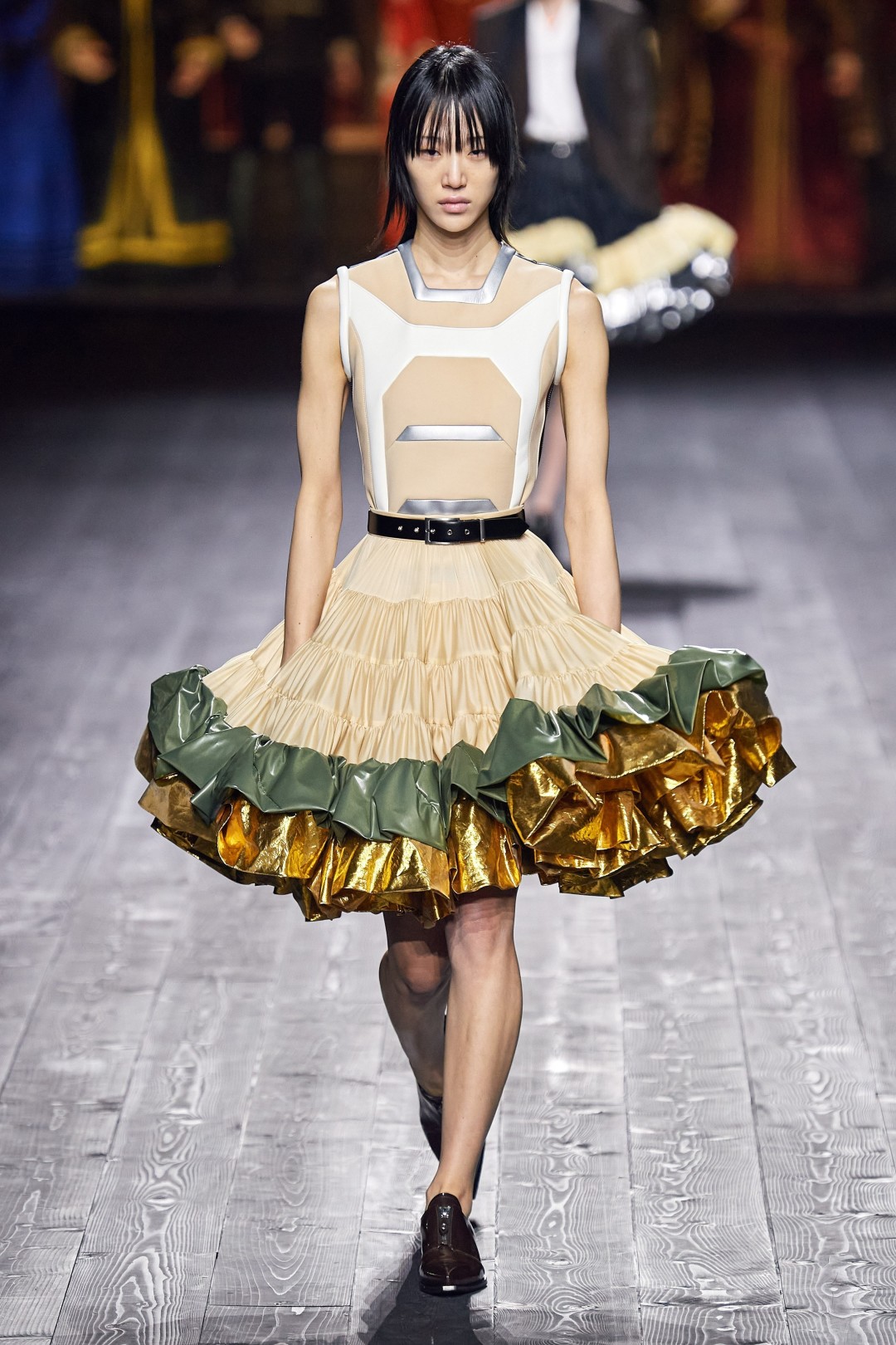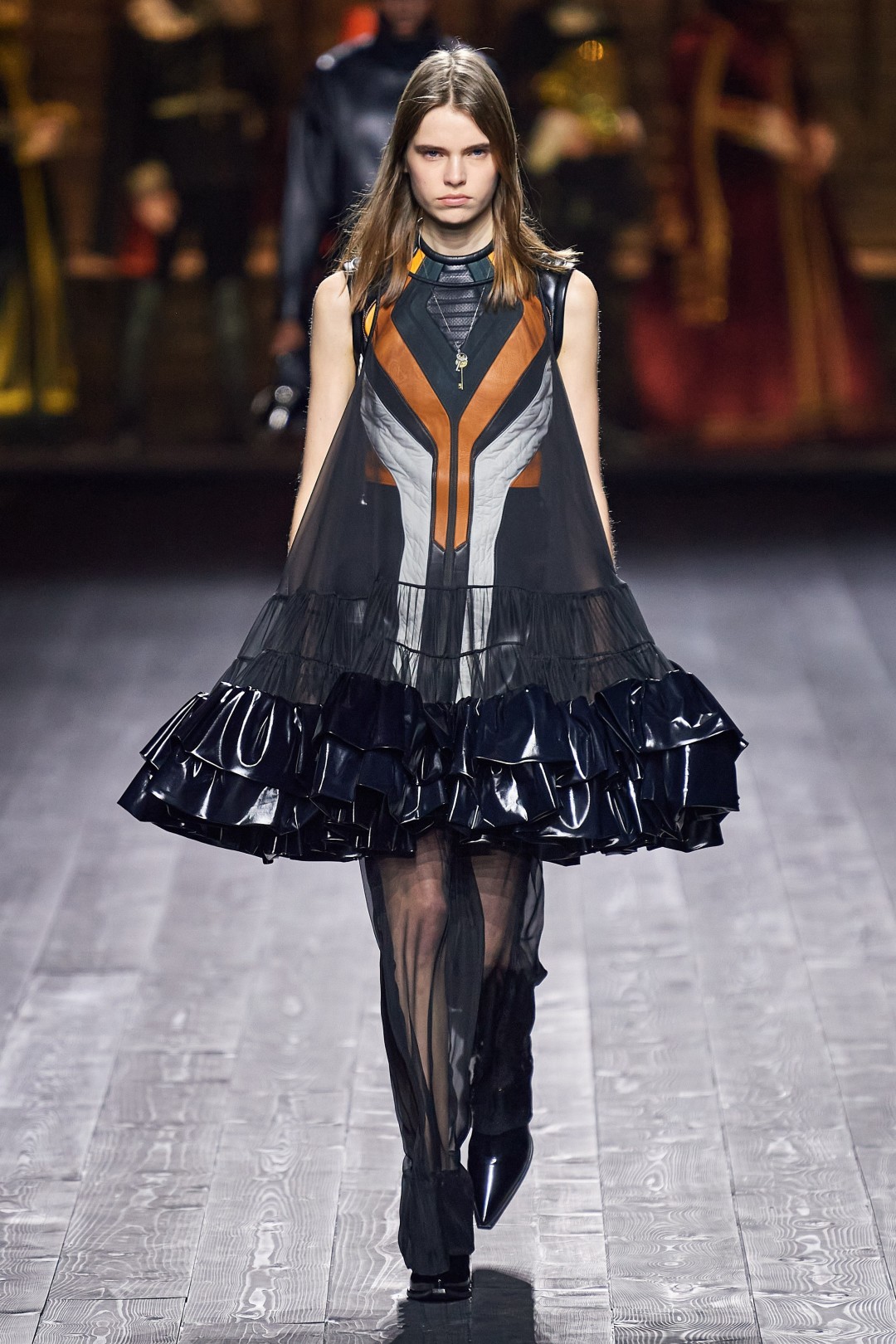 Креативный директор искал вдохновение в работах европейских живописцев начала средневековья конца XIX века. В коллекцию вошли пышные платья с волнами, многослойные пуховики и футуристические кожаные топы, напоминающие костюмы героев космических саг будущего. Образы дополнили перчатки, похожие на мотоциклетные, серебряные казаки и сумки-сундуки.