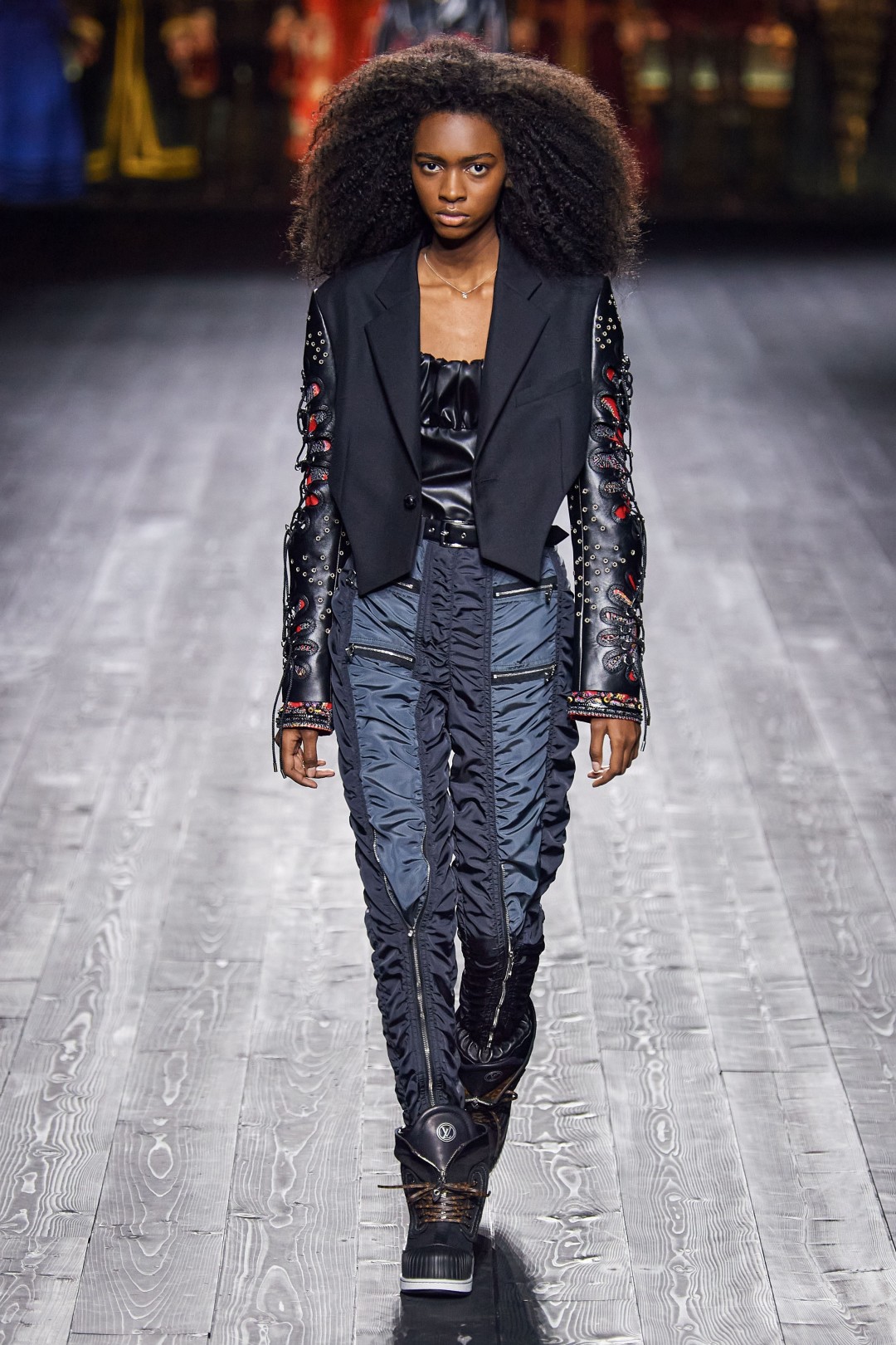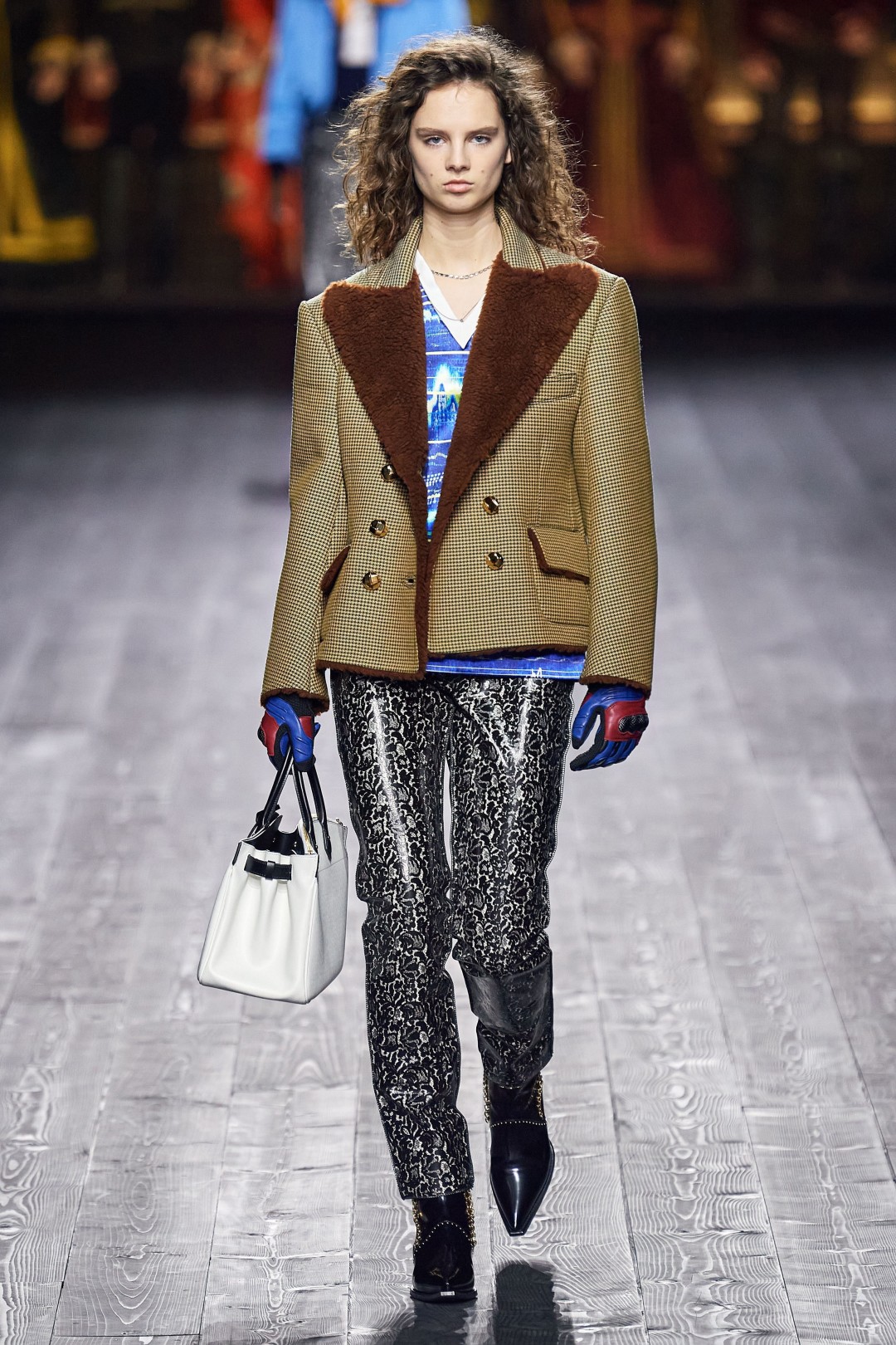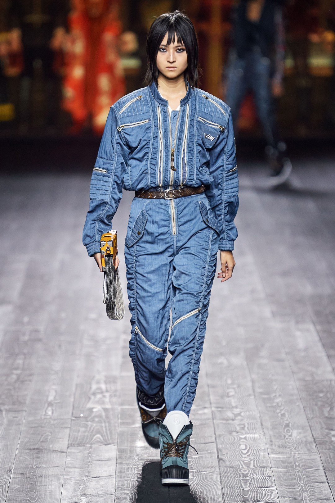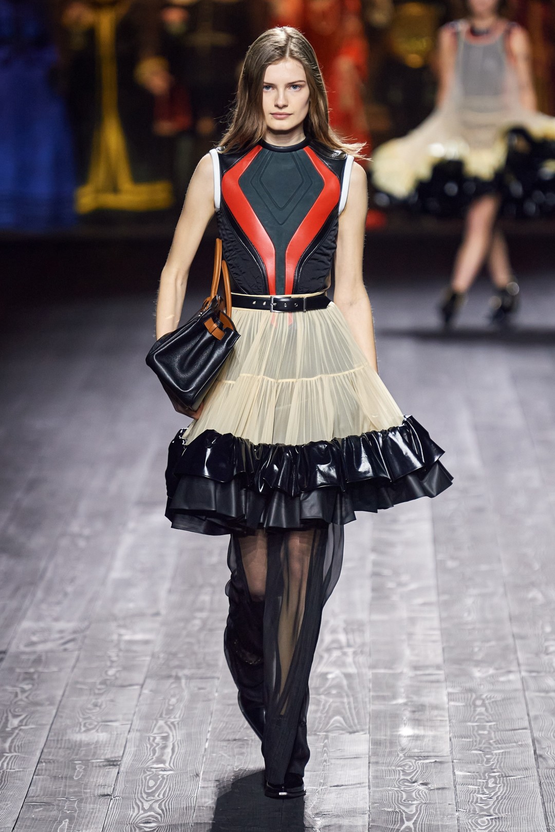 Креативный директор искал вдохновение в работах европейских живописцев начала средневековья конца XIX века. В коллекцию вошли пышные платья с волнами, многослойные пуховики и футуристические кожаные топы, напоминающие костюмы героев космических саг будущего. Образы дополнили перчатки, похожие на мотоциклетные, серебряные казаки и сумки-сундуки.