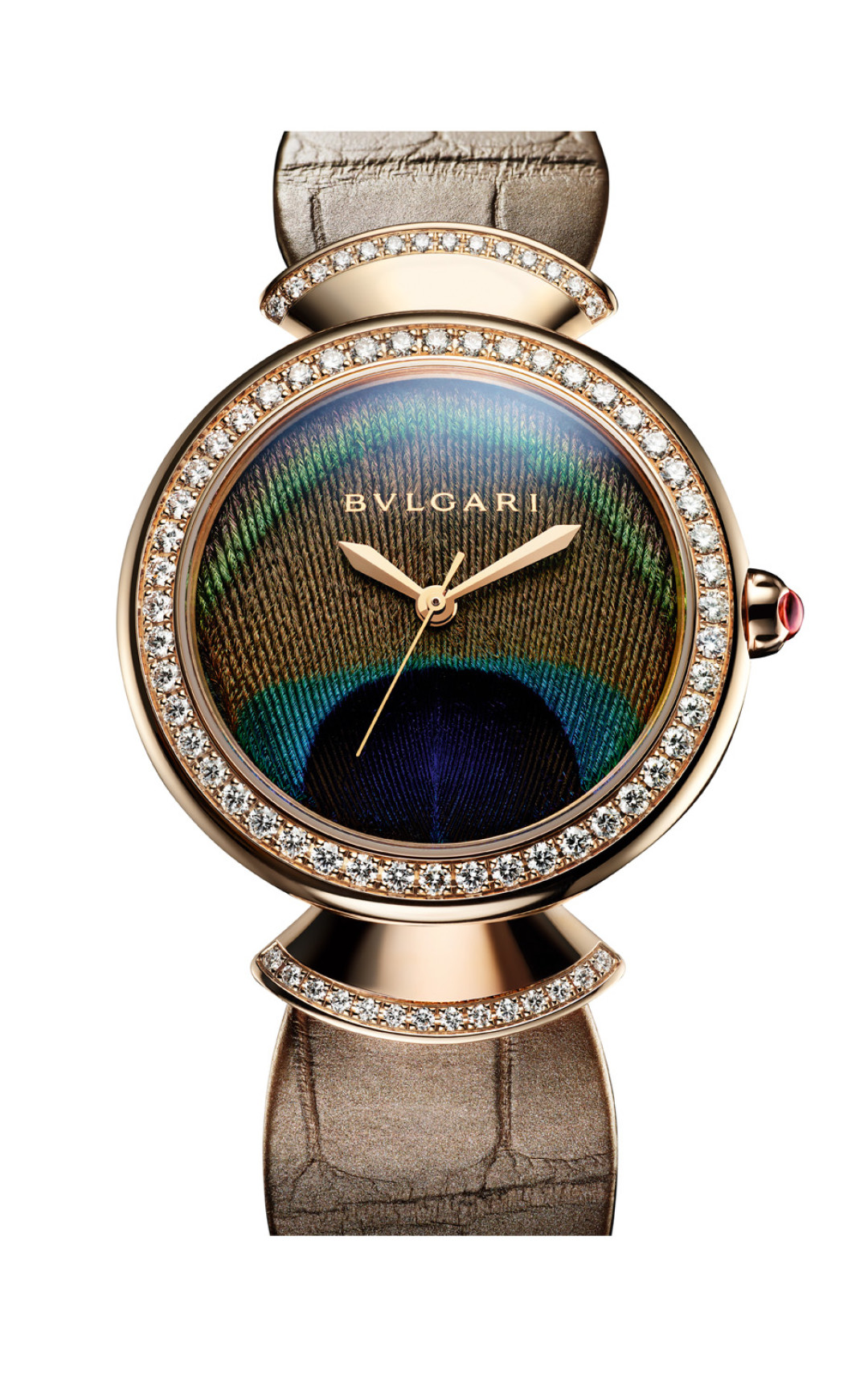 Под кусочком настоящего пера, врезанного в 37-миллиметровый корпус из розового золота, бьется мануфактурный калибр BVL191 с автоматическим заводом. Остальной обвес вполне в павлиньем характере: бриллианты по ободку, рубеллит на заводной головке, ремешок из кожи аллигатора.