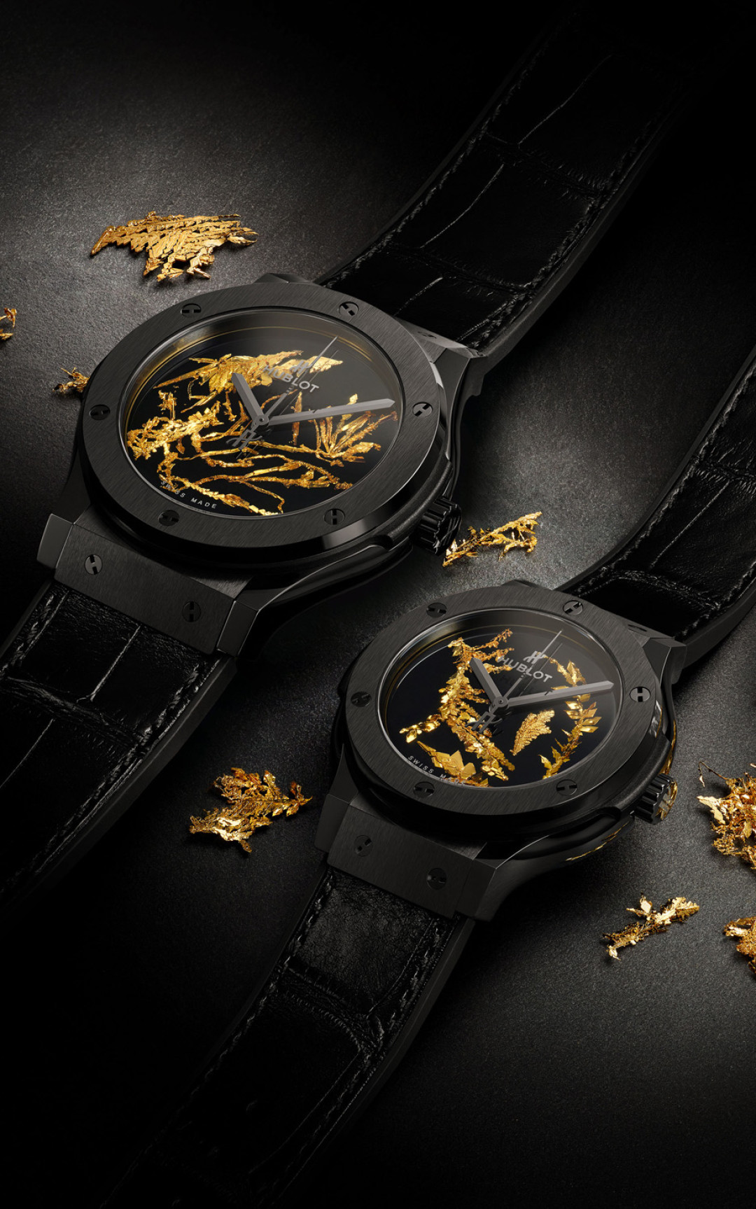В часовом мире впервые используют золото такой структуры. Самородки в виде цельных тонких пластин с ответвлениями встречаются в природе нечасто: слишком много условий должно совпасть для их образования. Воссоздать минералогическое чудо мануфактурным способом сумели (и запатентовали метод!) инженеры Hublot, расплавив драгоценный металл 999 пробы до золотого пара, осевшего на холодной поверхности. Кристаллы этого золота — каждый уникальной формы — мастера вручную разложили в вакууме под множеством слоев разработанного ими прозрачного лака. Без единого шанса на появление пузырьков и на повторение узора!