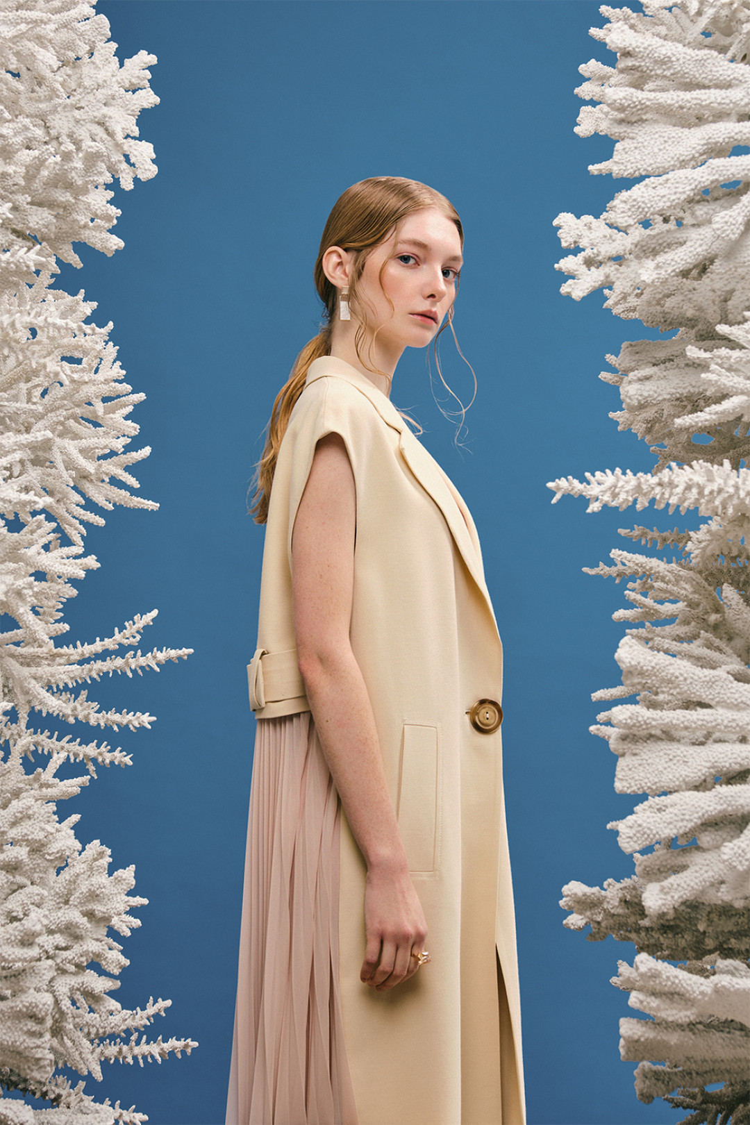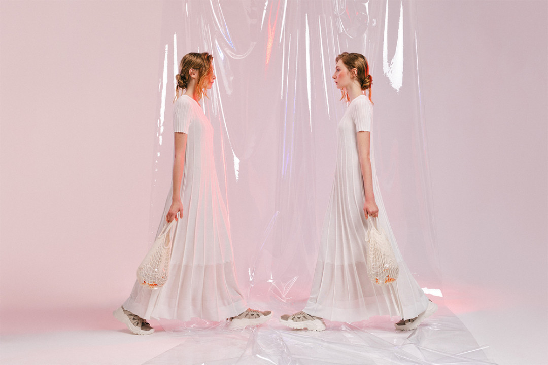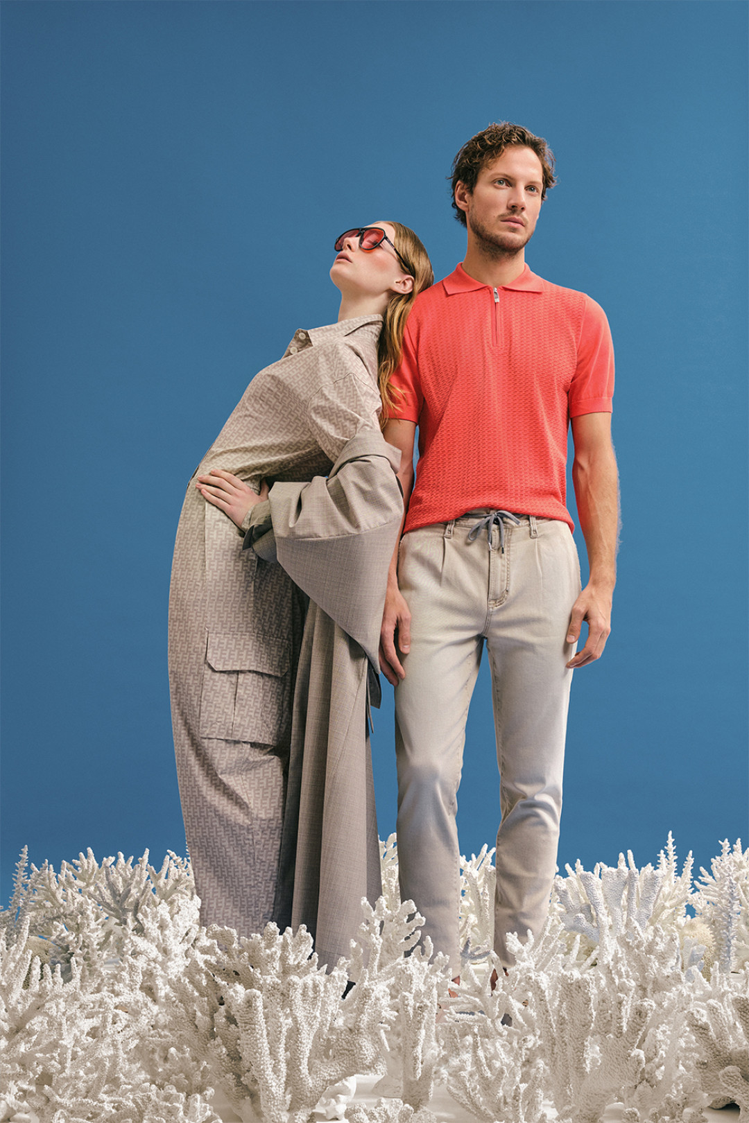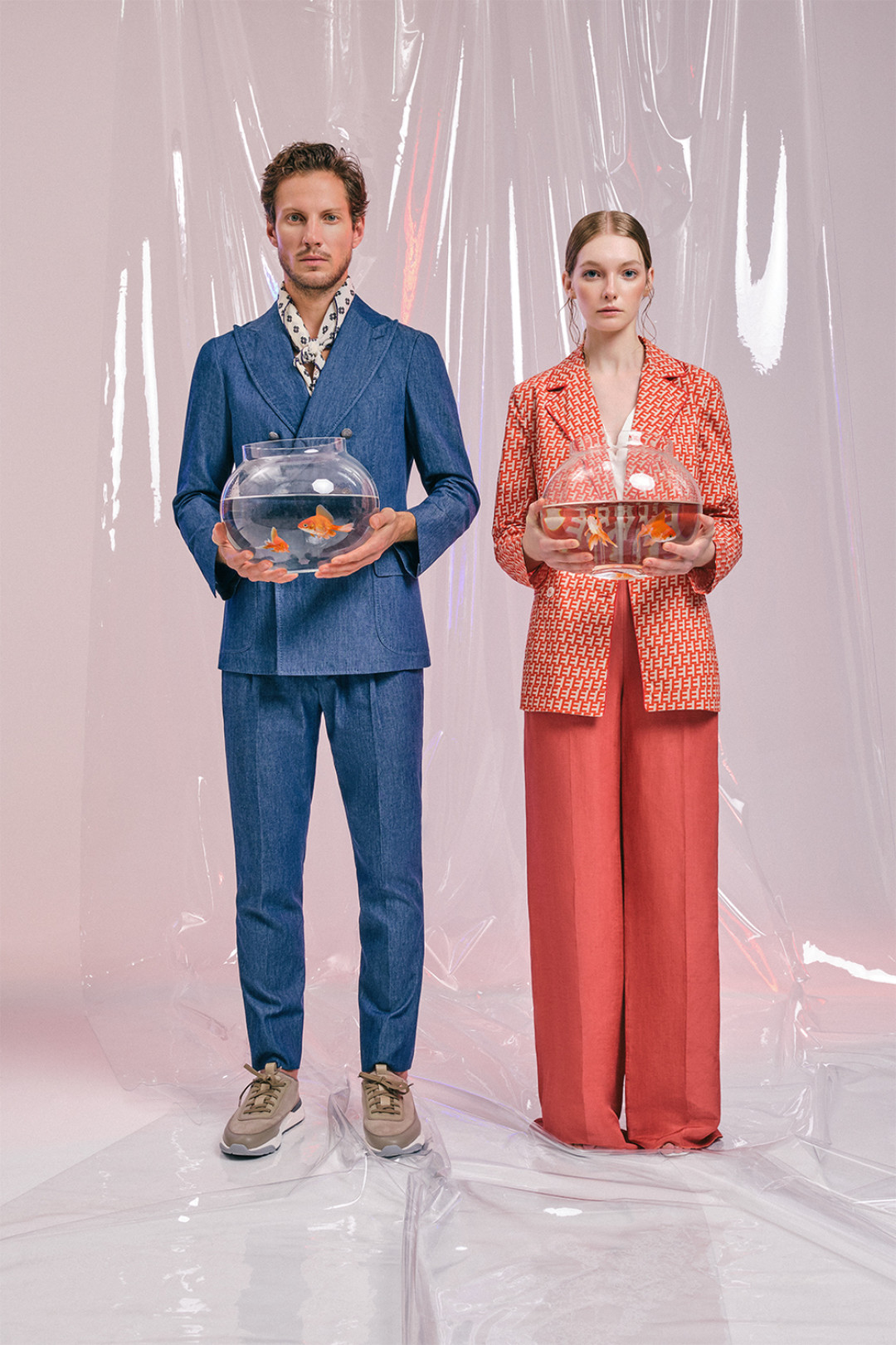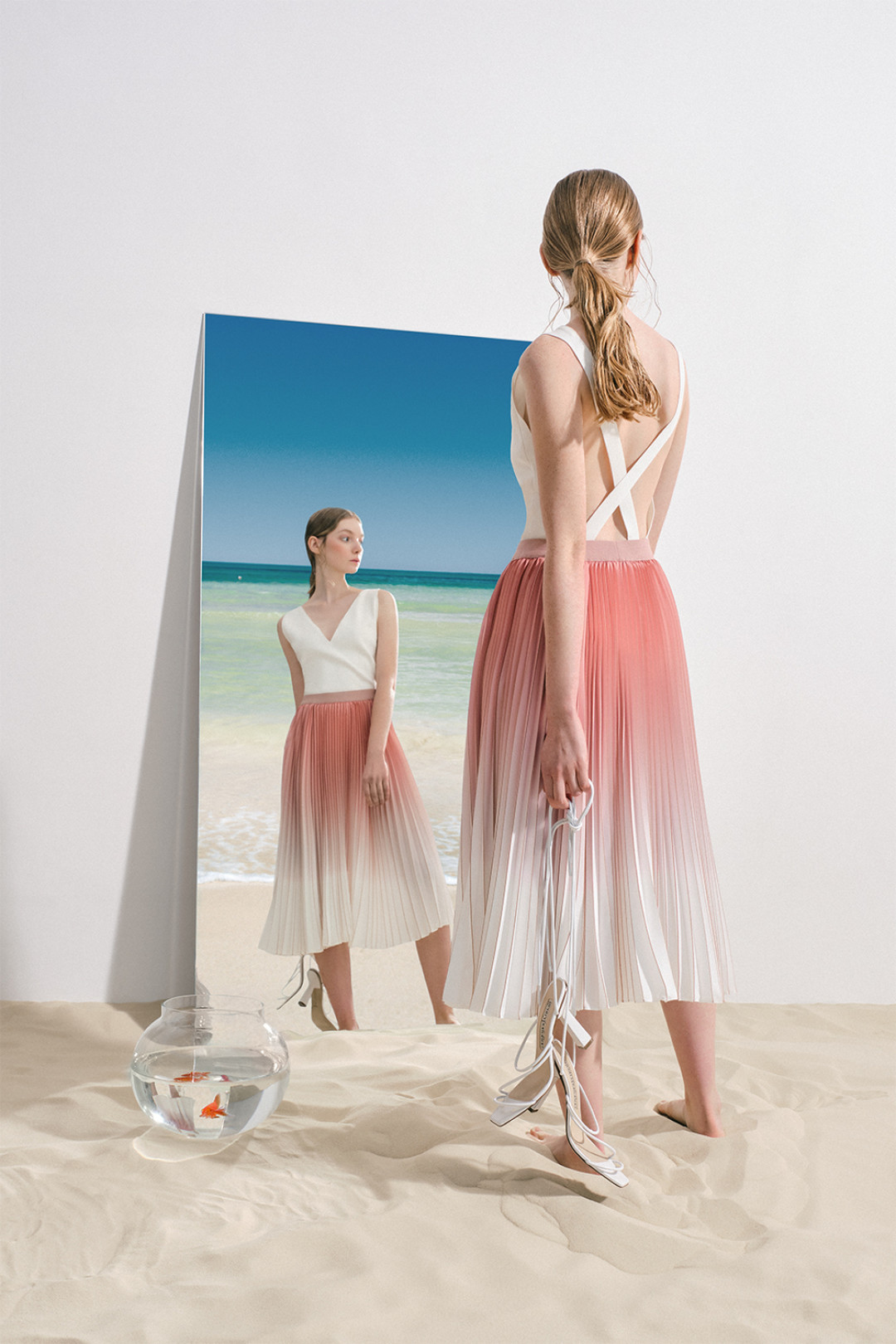 Съемка летнего лукбука «Кашемир и шелк» иллюстрирует мечту о далеких песчаных пляжах, ласкающей пене волн и коралловых рифах, и попытку воссоздать все это в условиях изоляции. Требуется лишь немного фантазии. Закройте глаза и представьте: причудливые формы кораллов, их несравненный яркий цвет; гладь воды, которую имитируют блестящие переливы полиэтилена; рыбки в аквариуме; влажные будто от соленой воды волосы и, конечно, летний гардероб, который усилит эффект в этом мире грез.