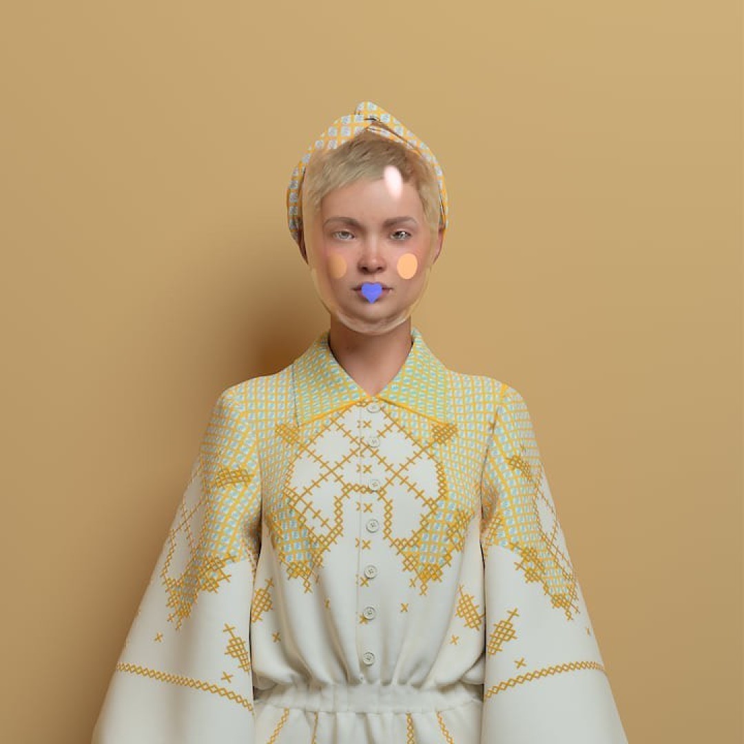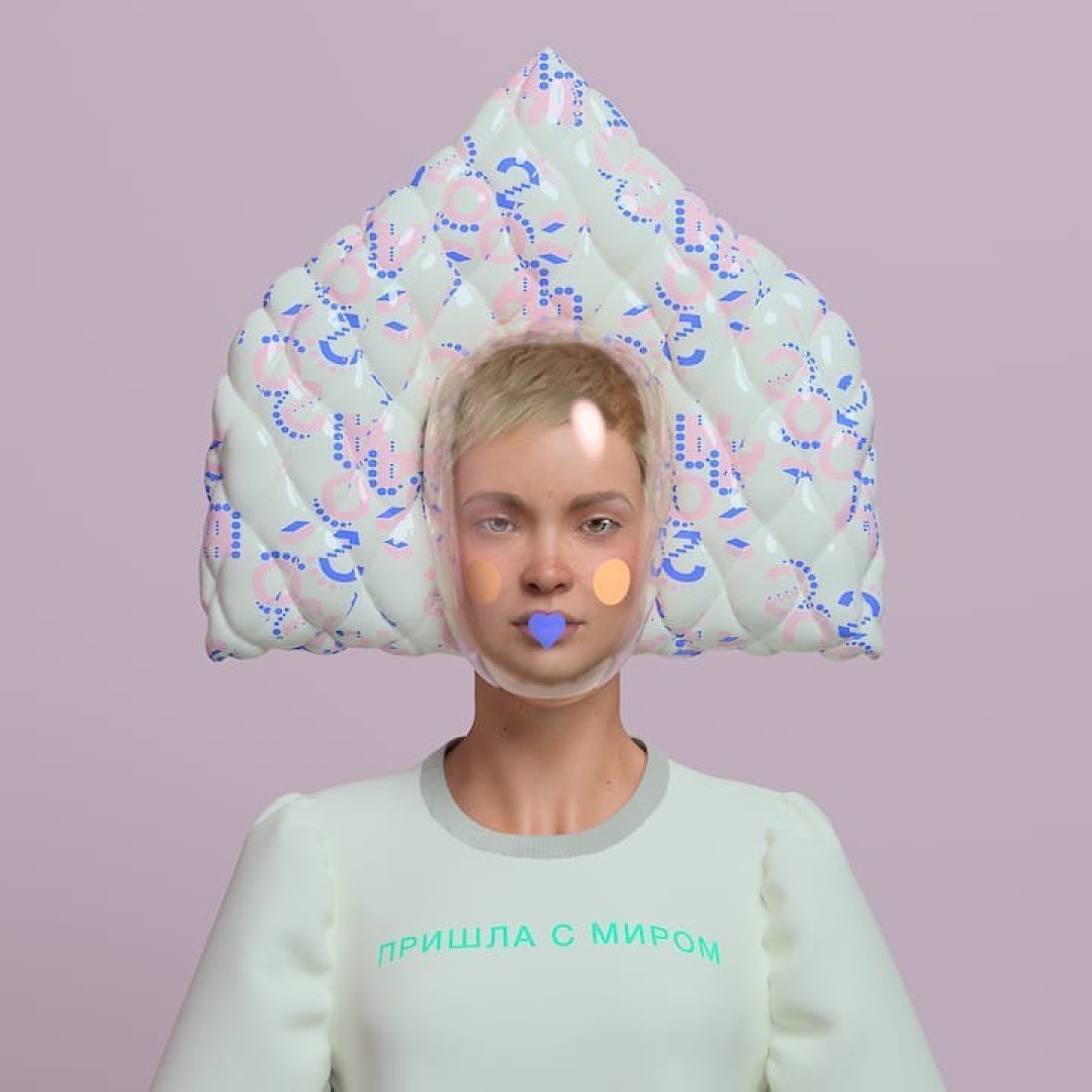 Платья, блузы с объемными рукавами и свитшоты с надписью «Пришла с миром» представила виртуальная модель Алена Пол. На всех кадрах она позирует в масках-шлемах, примеряет расписные нео-кокошники и скафандры, похожие на косынки.