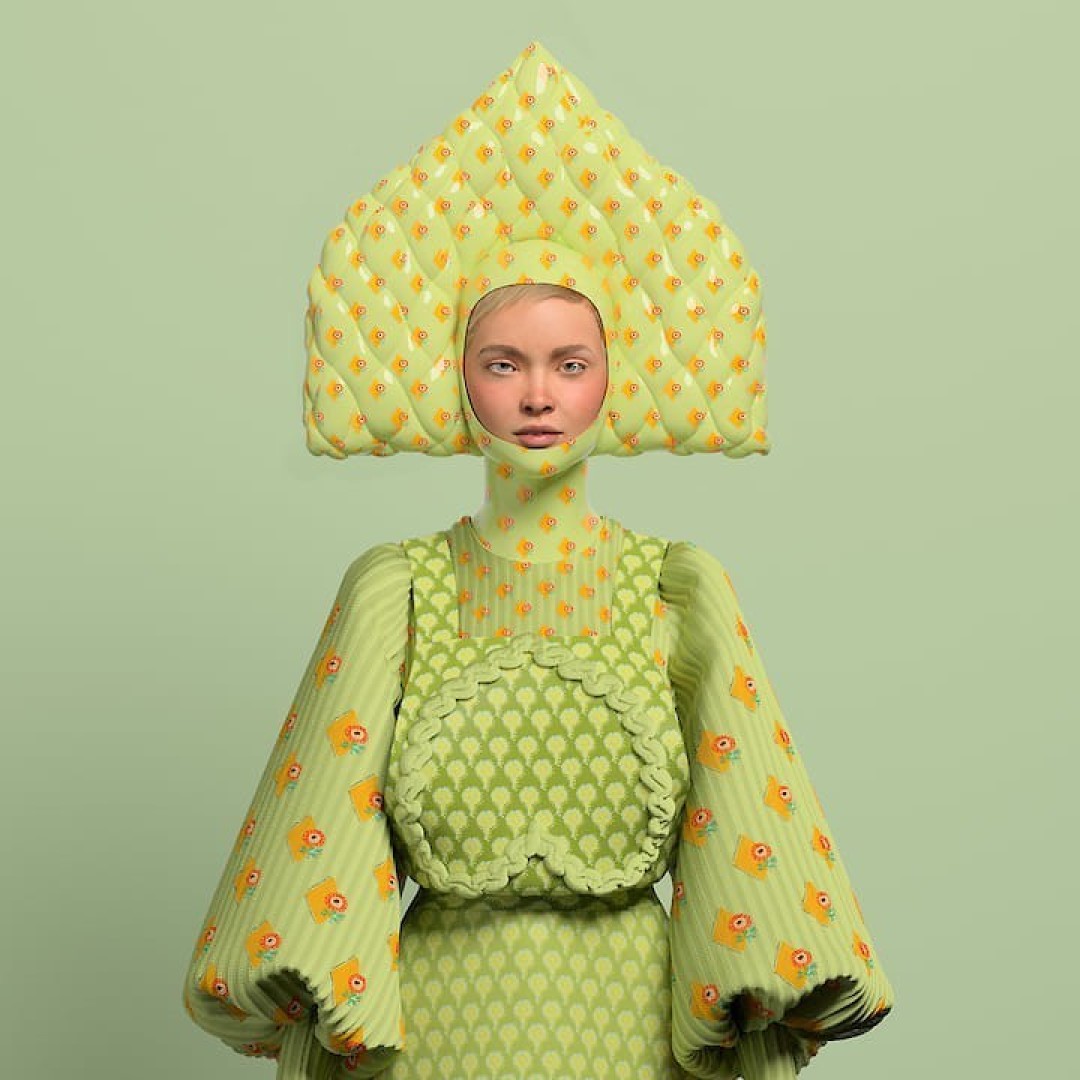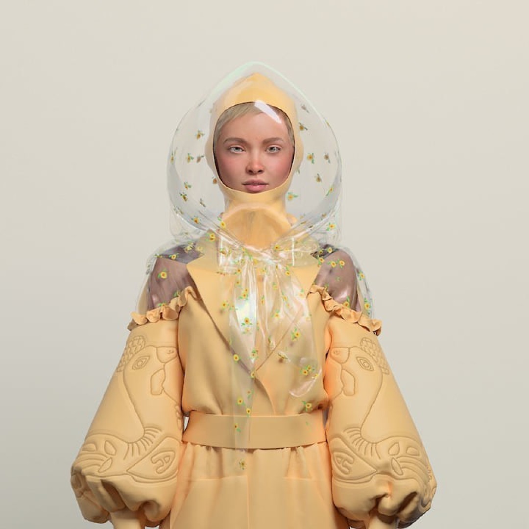 Бренд Alena Akhmadullina представил первую капсулу 3D-одежды, в которую вошли пять комплектов, отразившие мысли создательницы марки и дизайнера Алены Ахмадуллиной о моде будущего и ее связи с исконно-русскими культурными кодами. Шоу-стопперами коллекции стали объемные сарафаны как на дымковских игрушках-куколах, кокошники-дутики и скафанды-косынки.