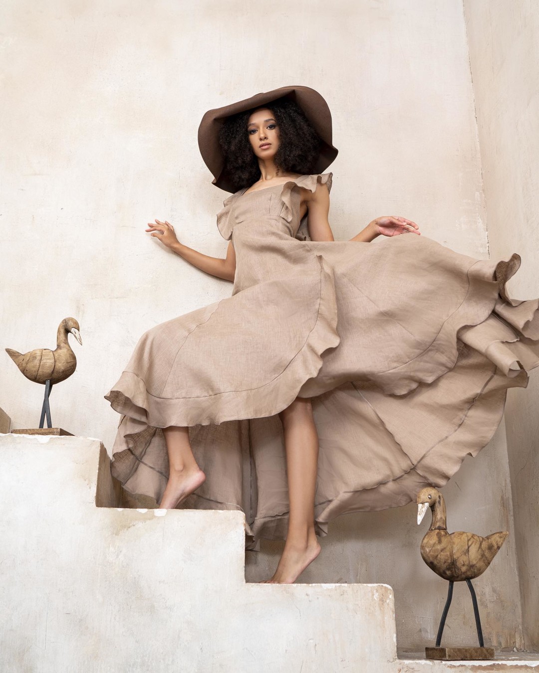 Главные материалы коллекции – лен и традиционный для Brusnika ажурный трикотаж. В основе колорита – природные бежевые и шоколадные оттенки, дополненные растительным принтом в стиле джунглей, который наносят при помощи специального принтера, единственного в России.