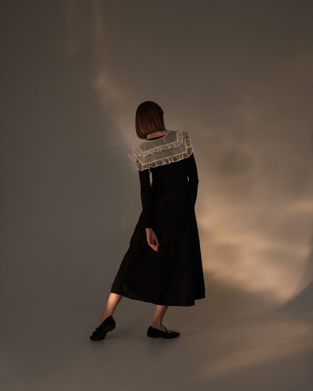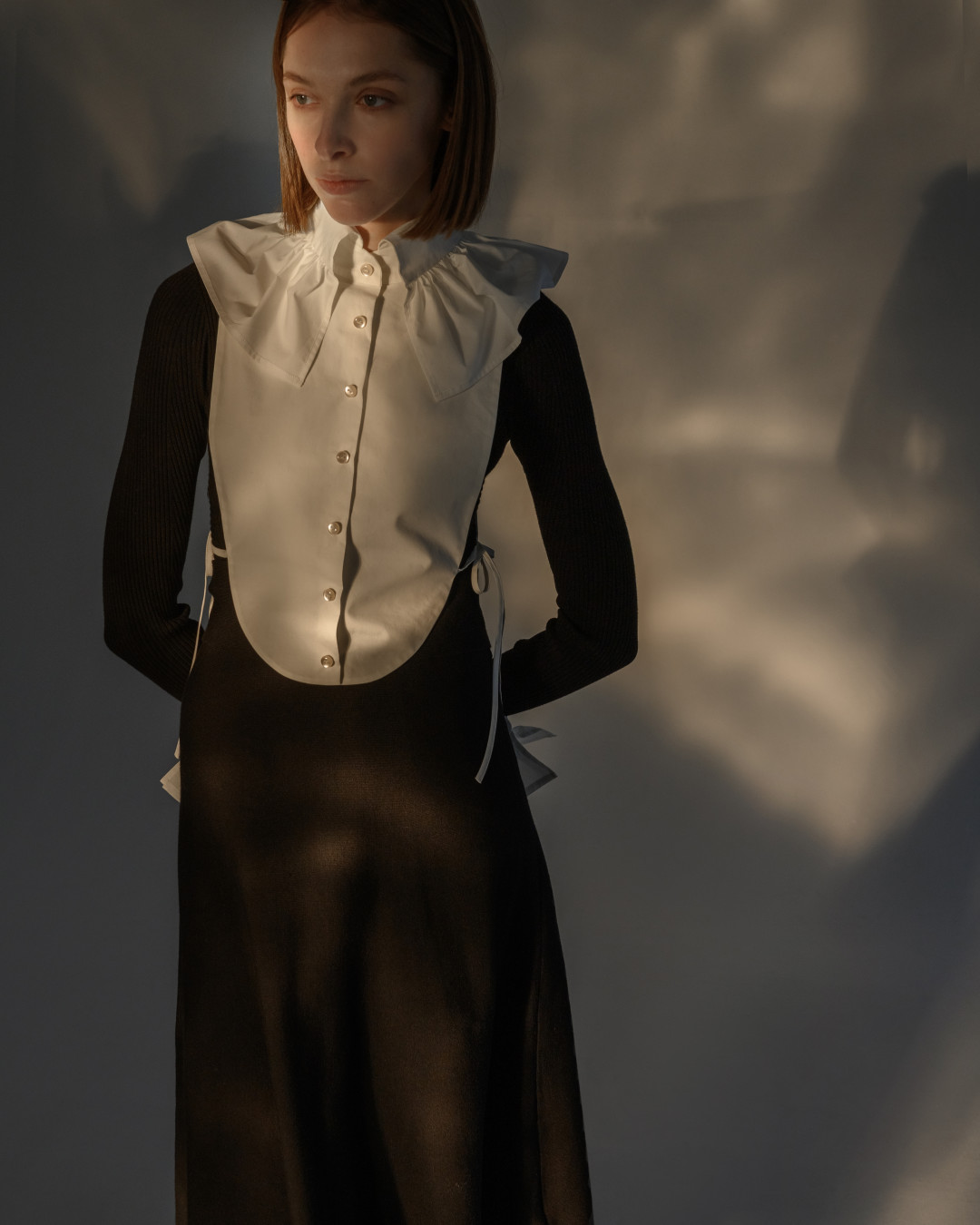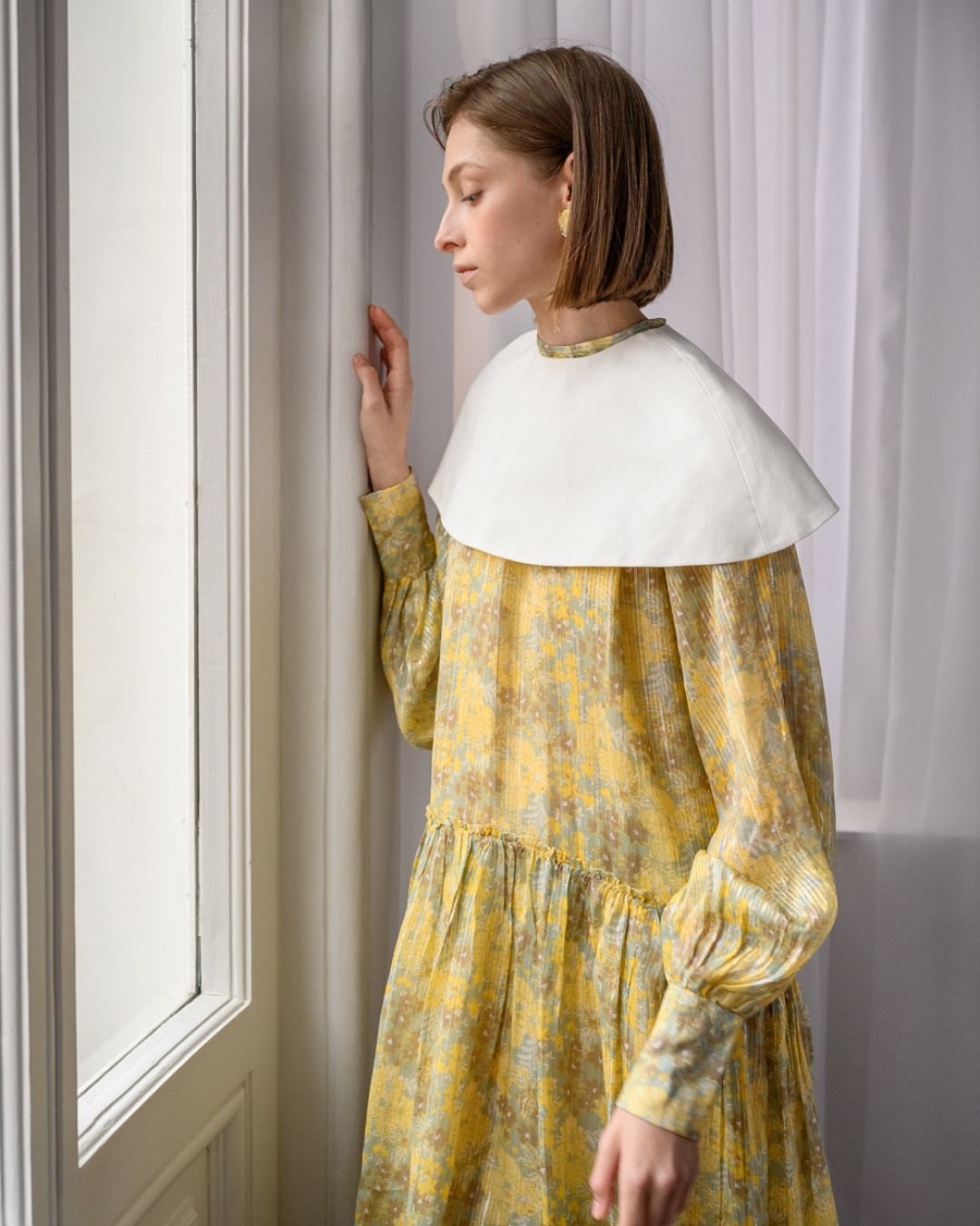 Первая коллекция называется «Девушка из Питера», она о любимом городе, в который Анна Бахарева переехала из Москвы. Съемку проводили в бывшем доходном доме издателя газеты «Речь» Юлиана Бака на Кирочной улице, а вещам бренда создательница дала имена значимых для нее мест. Например, пелерина «Мойка 112» названа в честь известного дома Шретера с эркерными окнами на Новую Голландию, где жила дизайнер при переезде в Петербург. А воротник-гюйс «Ветер над Невой» отсылает к любимой Анной морской теме. Прозрачные шелковые рукава-болеро «Самая белая ночь», пояс-рукава «Дача в Комарово», пелерина из хлопка молочного цвета «Выпускница Смольного» — в каждой вещи своя история.