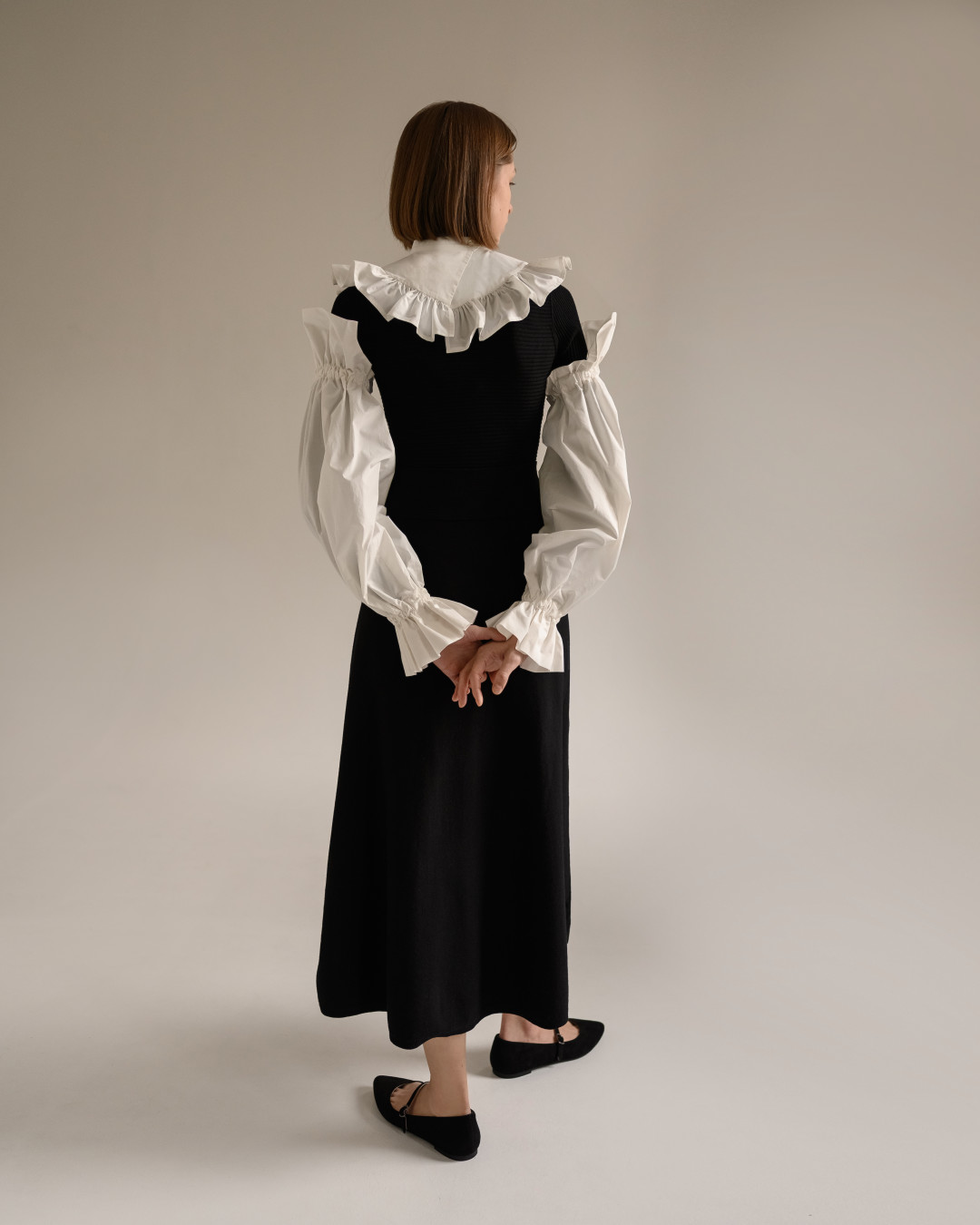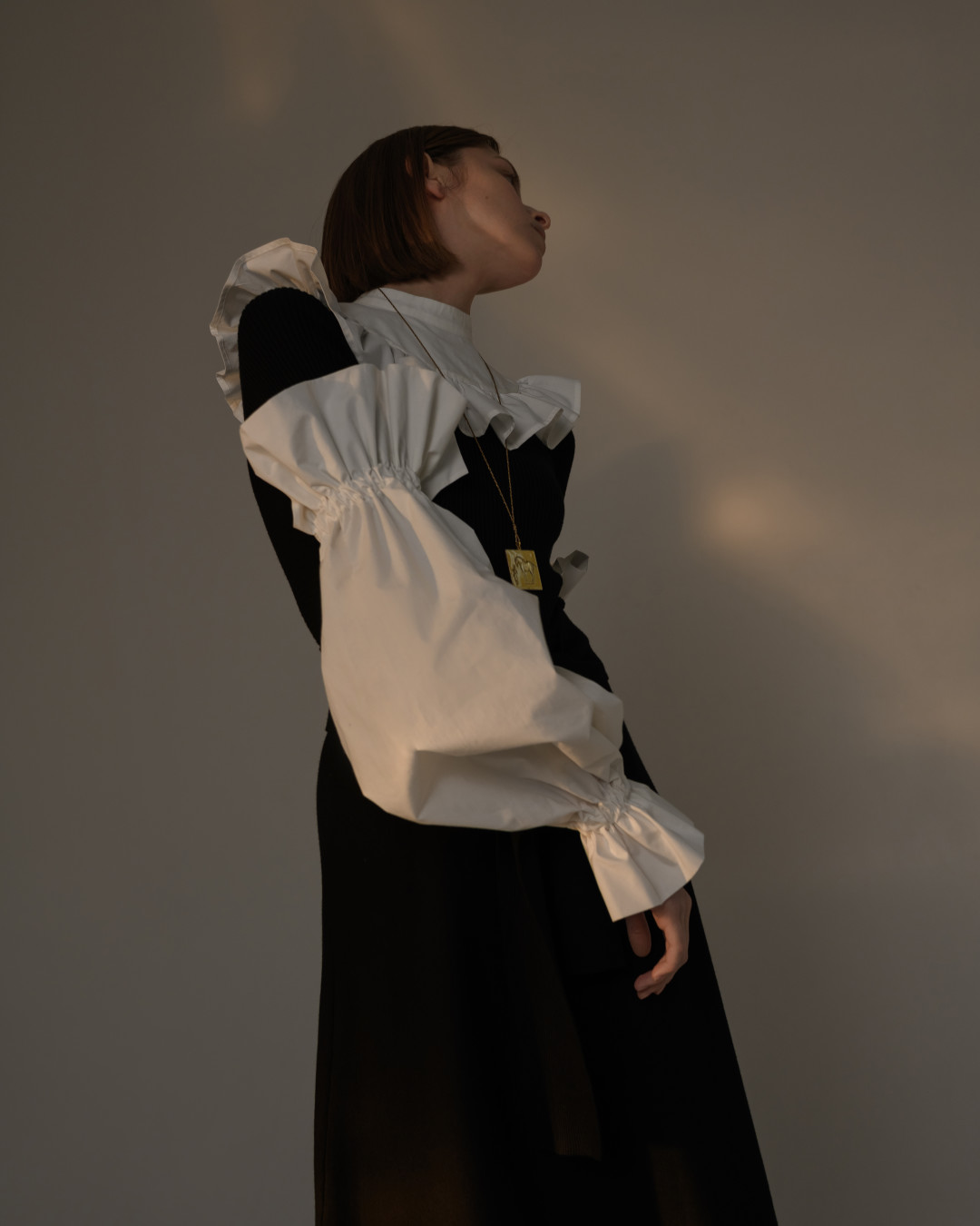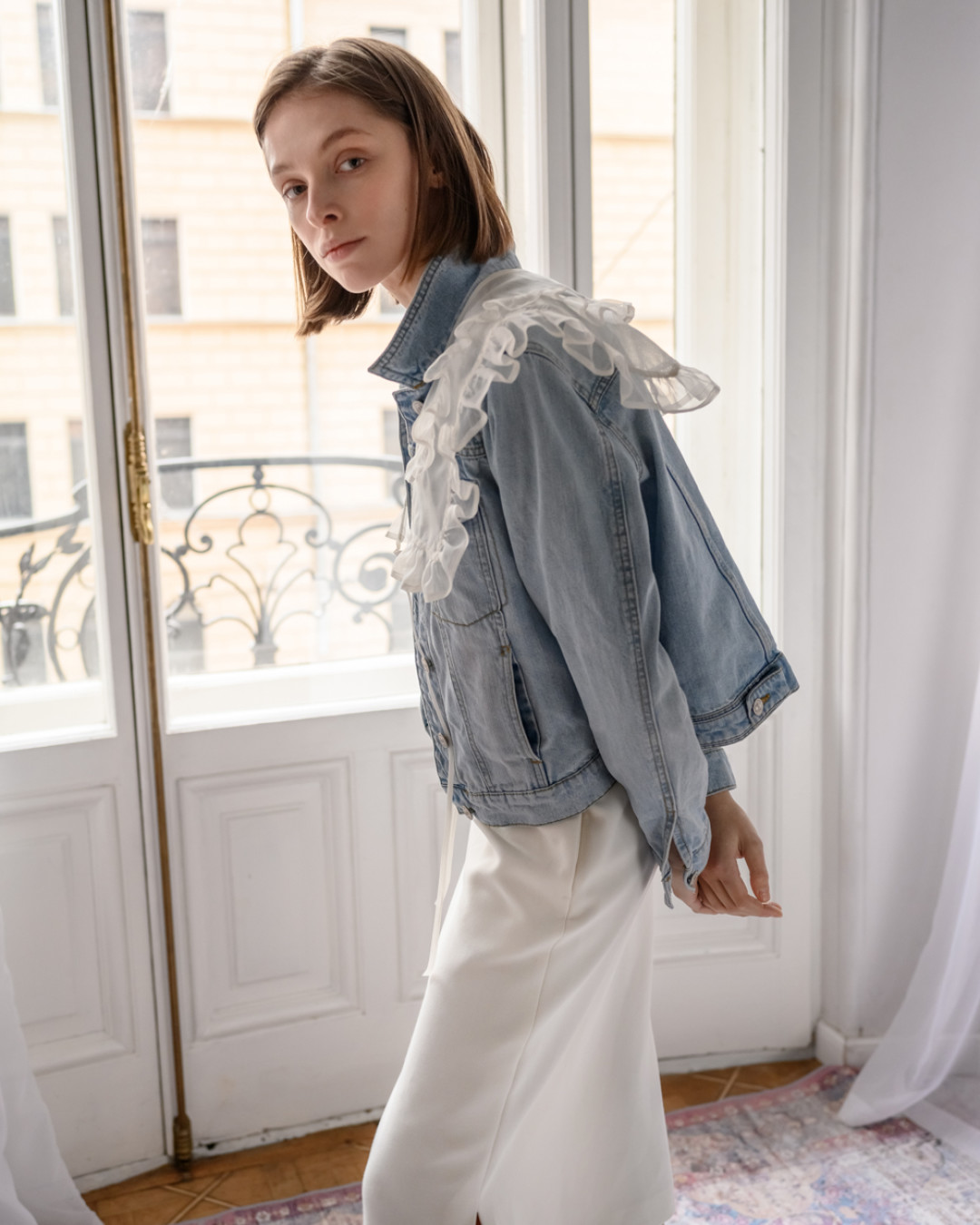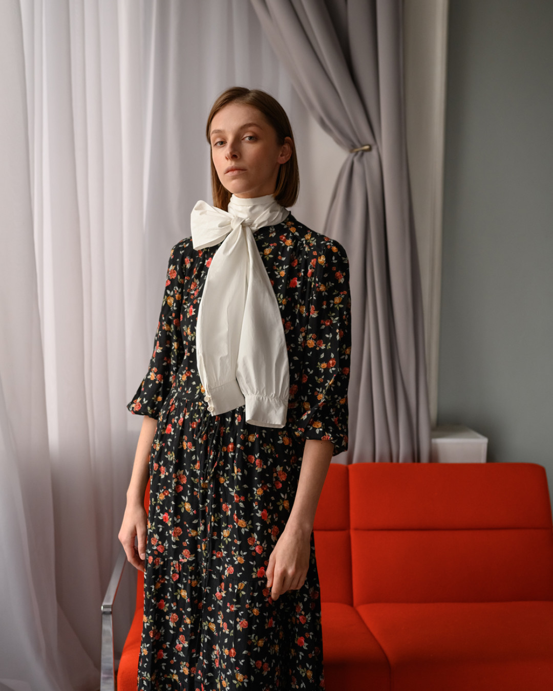 Первая коллекция называется «Девушка из Питера», она о любимом городе, в который Анна Бахарева переехала из Москвы. Съемку проводили в бывшем доходном доме издателя газеты «Речь» Юлиана Бака на Кирочной улице, а вещам бренда создательница дала имена значимых для нее мест. Например, пелерина «Мойка 112» названа в честь известного дома Шретера с эркерными окнами на Новую Голландию, где жила дизайнер при переезде в Петербург. А воротник-гюйс «Ветер над Невой» отсылает к любимой Анной морской теме. Прозрачные шелковые рукава-болеро «Самая белая ночь», пояс-рукава «Дача в Комарово», пелерина из хлопка молочного цвета «Выпускница Смольного» — в каждой вещи своя история.