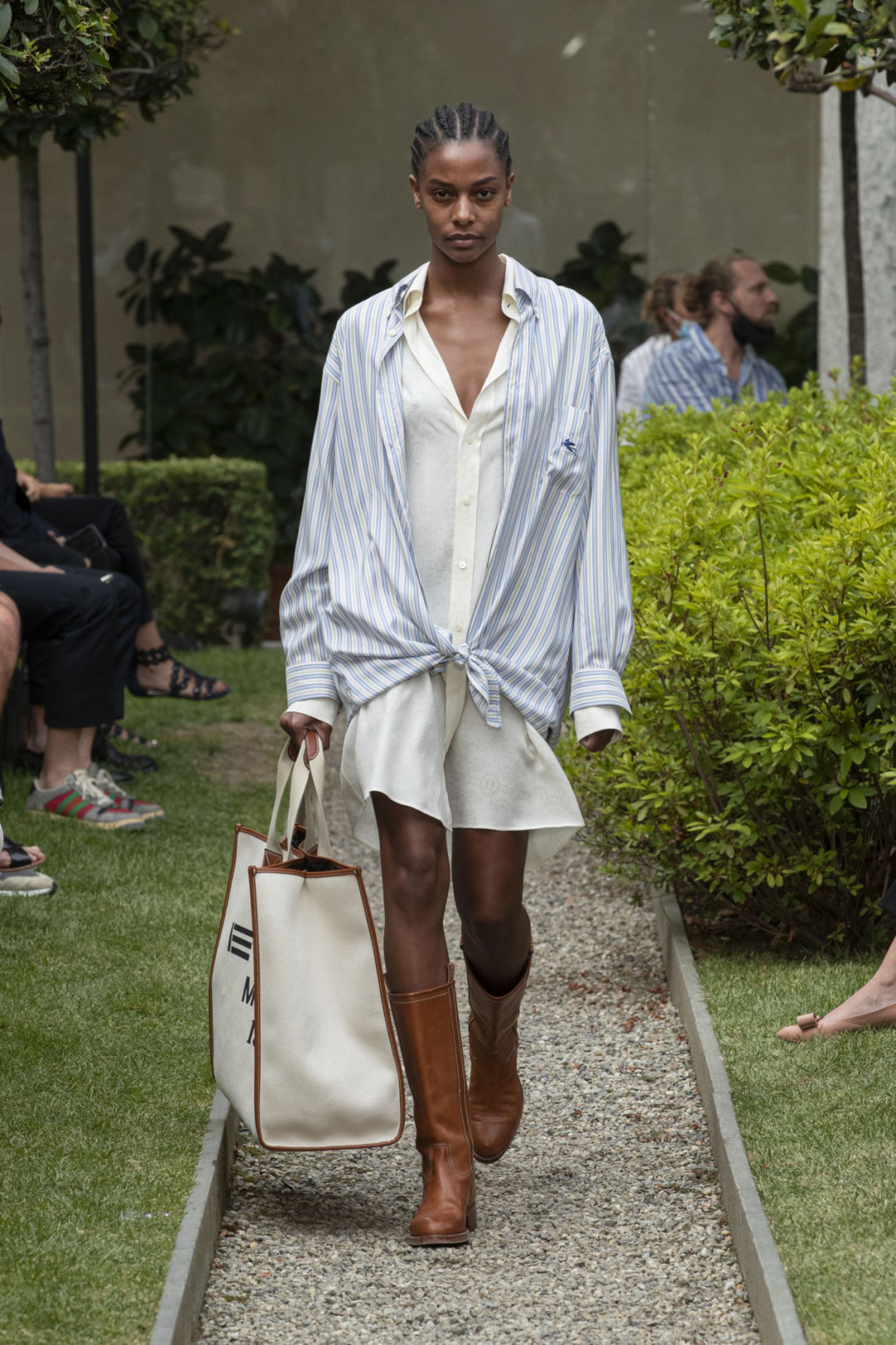 По миланскому саду ходили модели под живую музыку, а за ними наблюдали зрители — все по допандемическим канонам показов на Неделях моды. Гости шоу, среди которых замечена инфлюенсер Каро Даур, были в масках (ну, почти все), а рассадили их в соответствии с требования социальной дистанции.