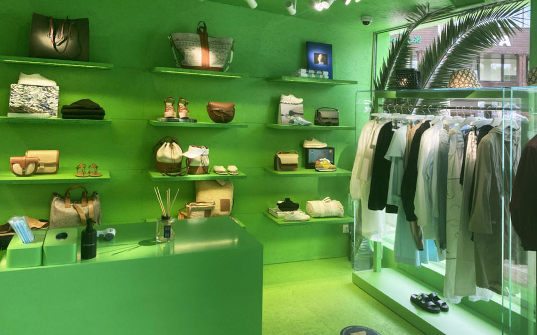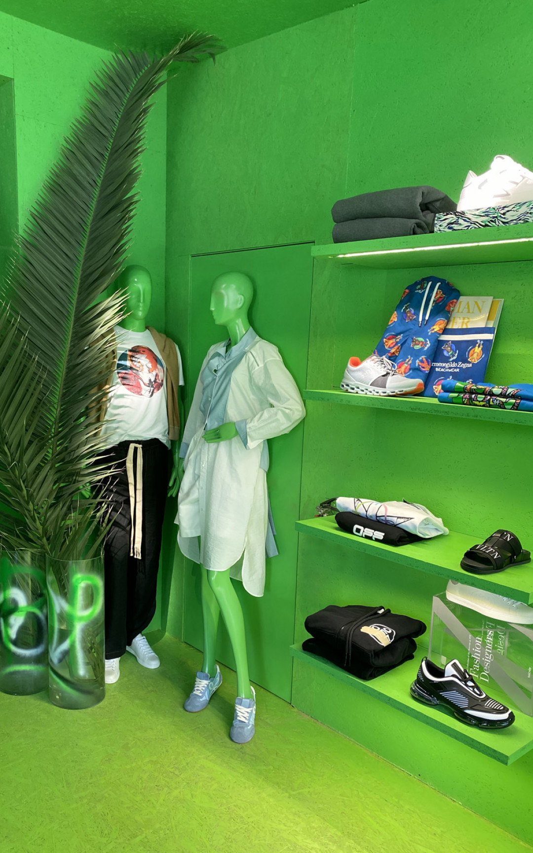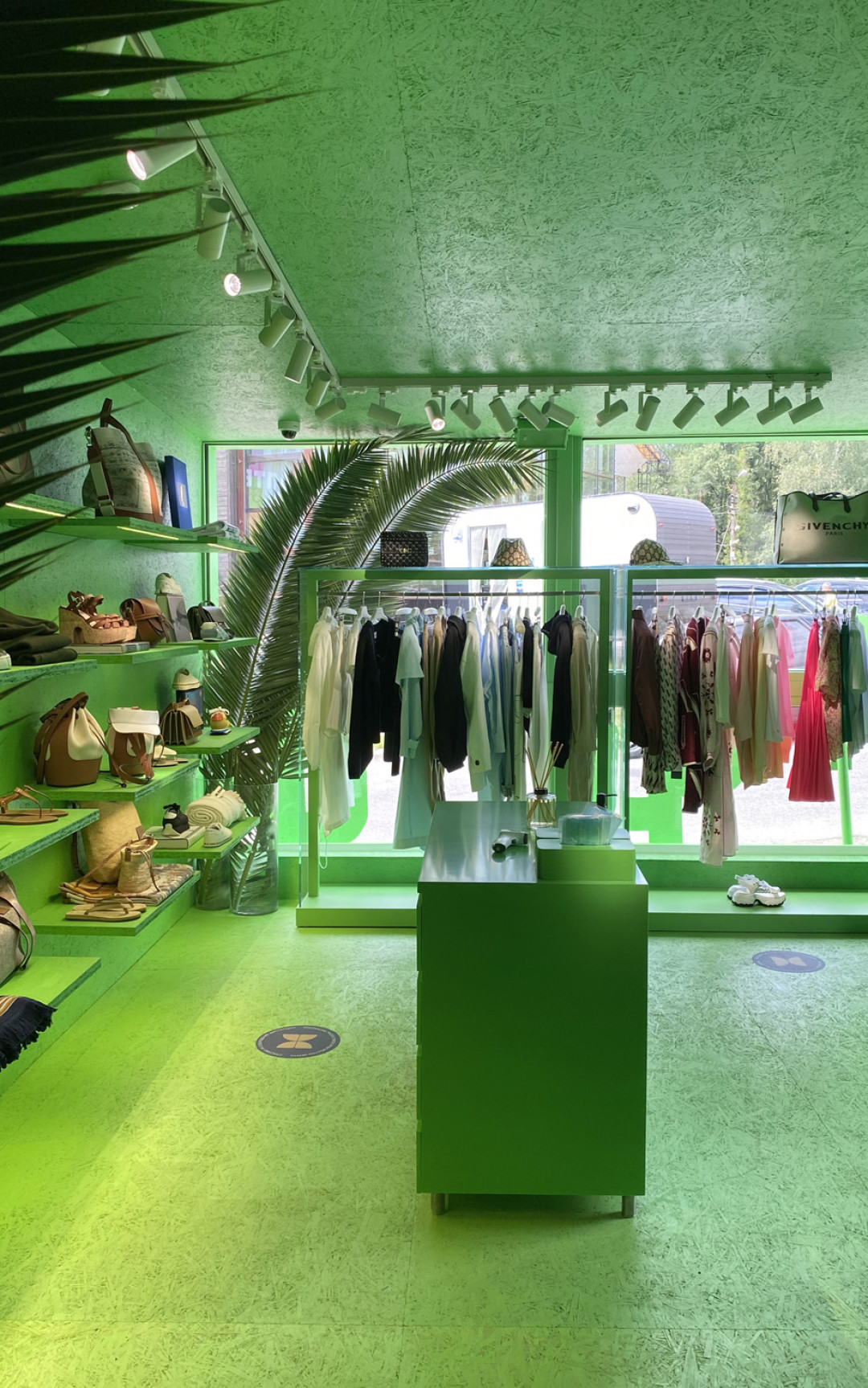 Коллекция pop-up store состоит из самых необходимых позиций для отдыха на море: спортивного, casual и коктейльного выхода на открытом воздухе. В пространстве ярко-зеленого куба, которое напоминает нам об эко-повестке, можно примерить летние костюмы, платья-рубашки, трендовые велосипедки, свободные миди и захватить легкие плащи, если с моря подул ветер. К лукам здесь же подберут обувь – от белоснежных сникерсов и шлепанцев до сандалий без каблуки или на танкетке, – и необходимые на пляже аксессуары: панамы, бейсболки и соломенные сумки.