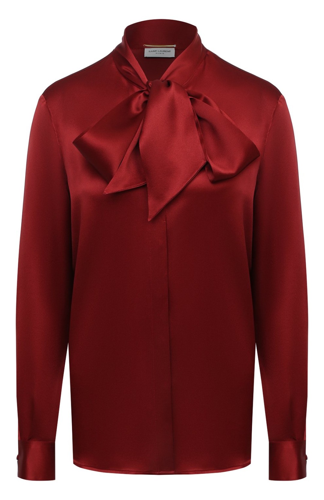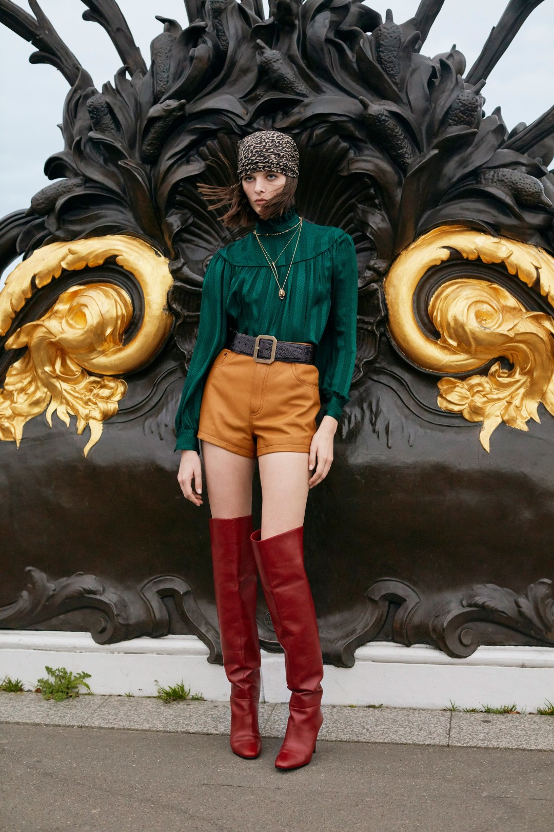 В пре-коллекции Saint Laurent представлены ультракороткие платья и шорты, летящие блузы с бантами, жакеты, юбки в пол с высокой посадкой и ботфорты. Цветовая палитра необычно яркая для модного дома — в ней есть изумрудные, алые и песочные оттенки.