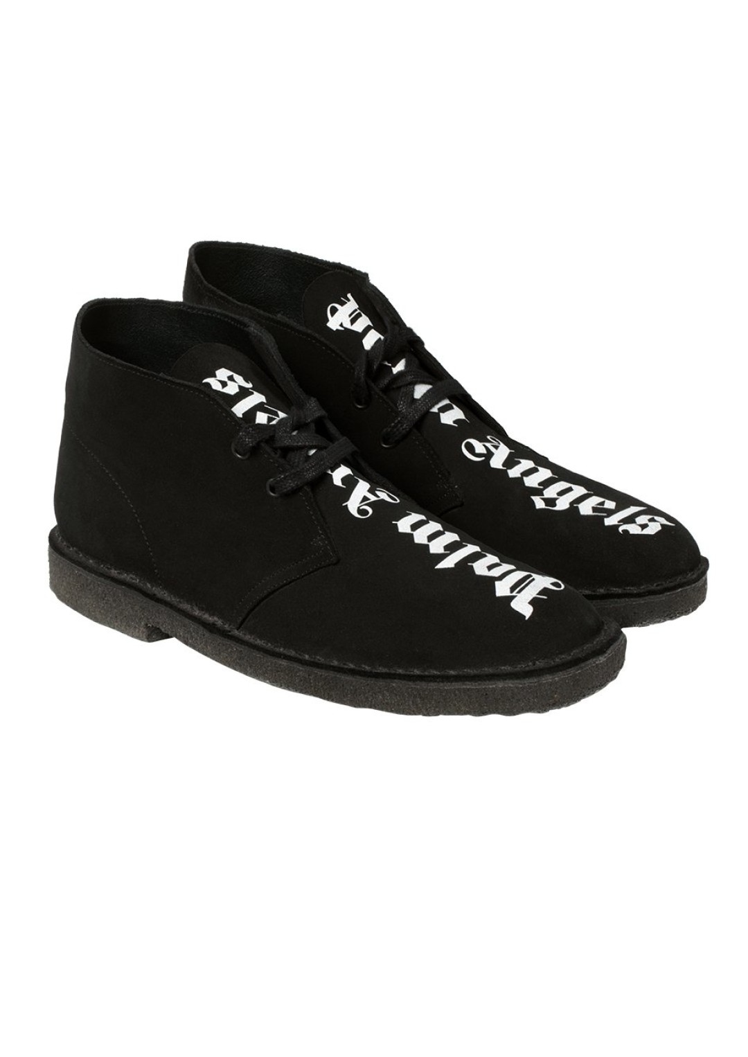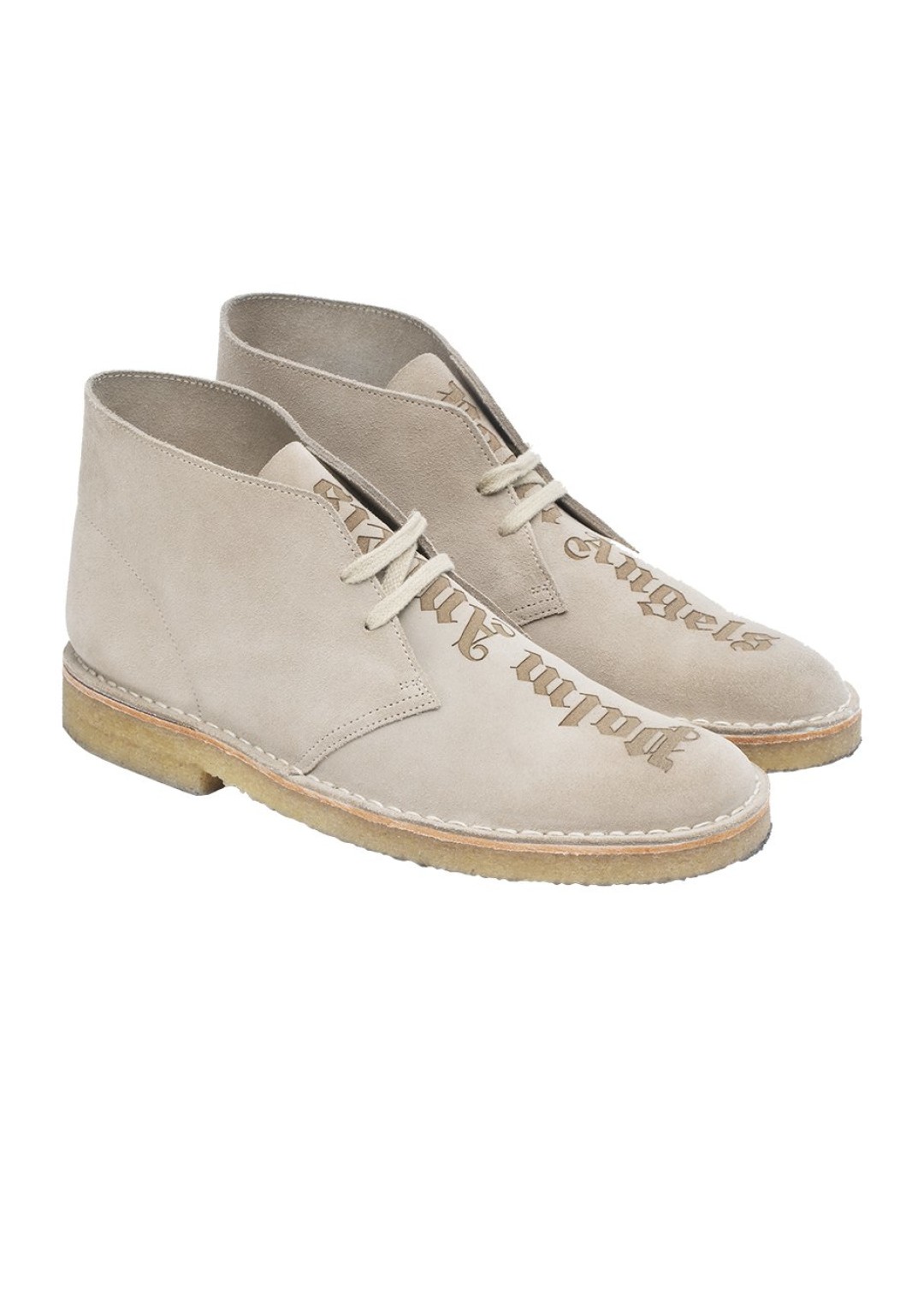 Новинка — результат сотрудничества обувного бренда Clarks Originals и стритвир-марки Palm Angels. Отличительная черта модели, в основе которой классические ботинки Desert, принт в виде логотипа Palm Angels на верхней части. Обувь представлена в двух базовых цветах: бежевом и черном, верх пары выполнен из замши, а подошва — из каучука.