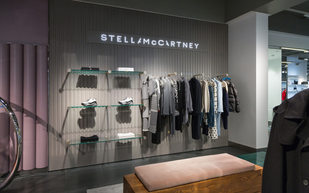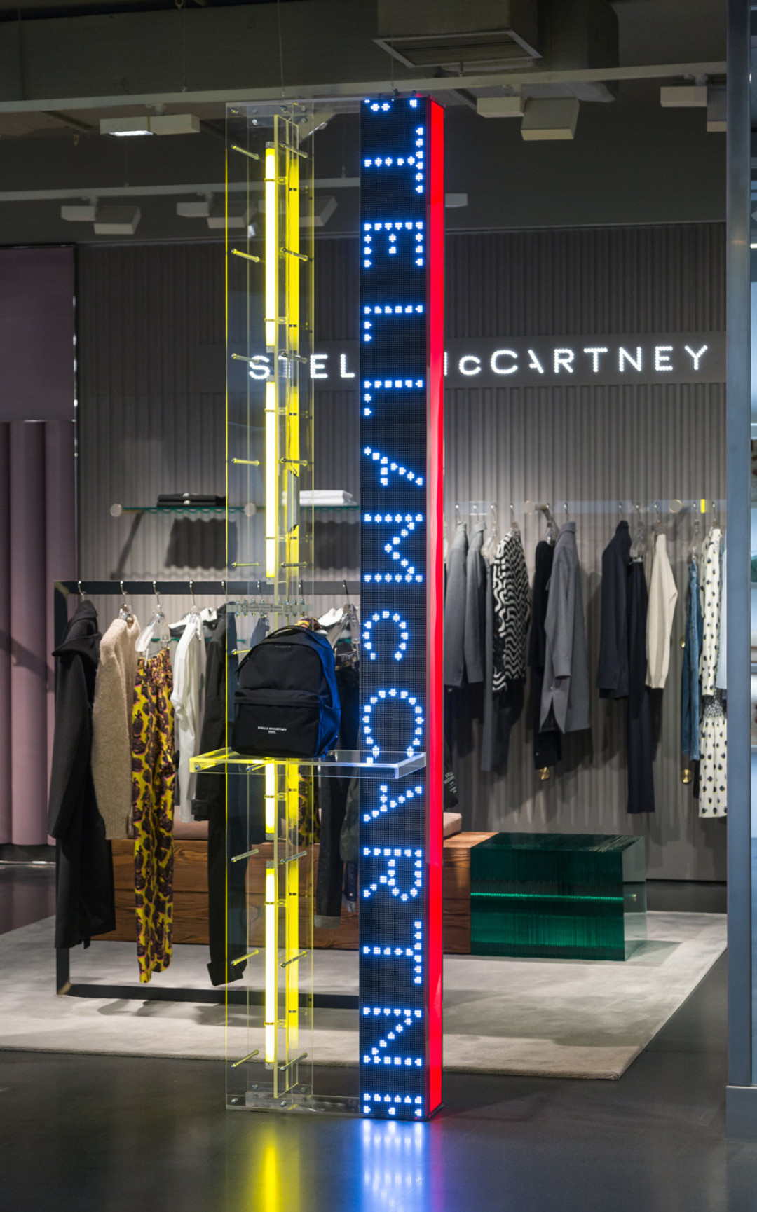 Чтобы соотвествовать философии бренда Stella McCartney, декораторы корнера выбрали в качестве основных материалов сталь, дерево, необработанное стекло – все или натуральное, или переработанное. Даже манекен был специально произведен из биопластика. Стены передают особую трубчатую текстуру и напоминают, по словам Стеллы, оформление ее детской комнаты. Тему веселья и хорошего настроения поддерживает световая инсталляция в духе ДНК бренда, ведь для самого дизайнера самое важное – это не причинять вред природе и оставаться жизнерадостным в любое время. Такой подход к жизни отражается и в интерьере, и в коллекции FW2020.