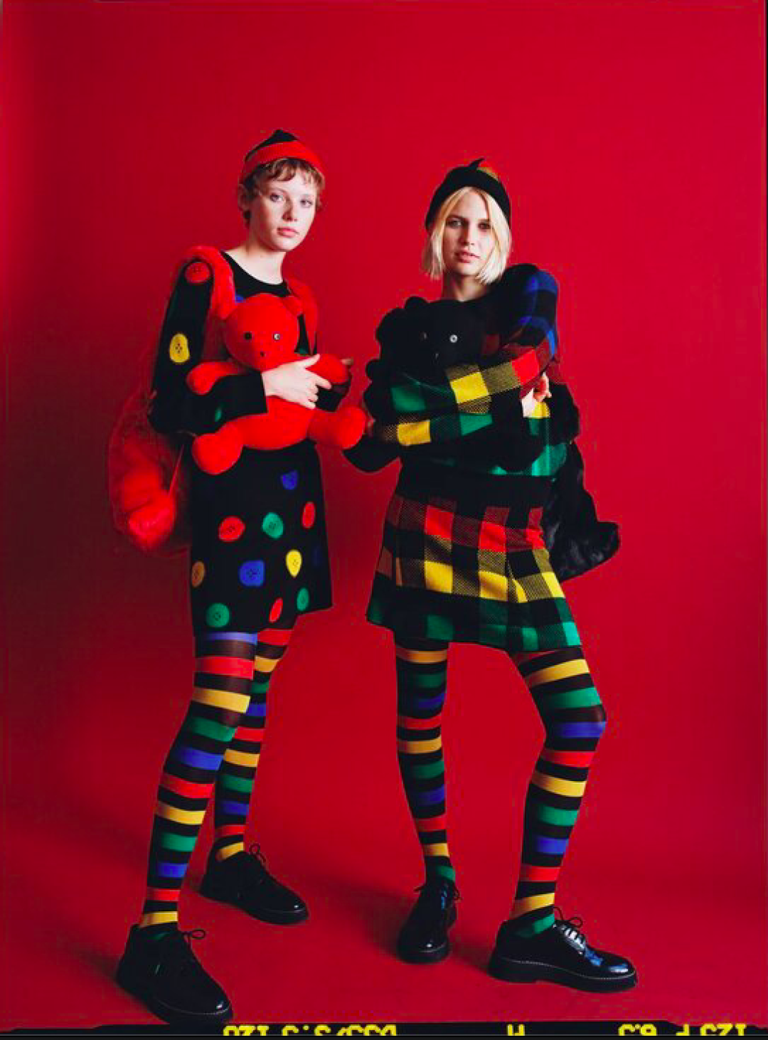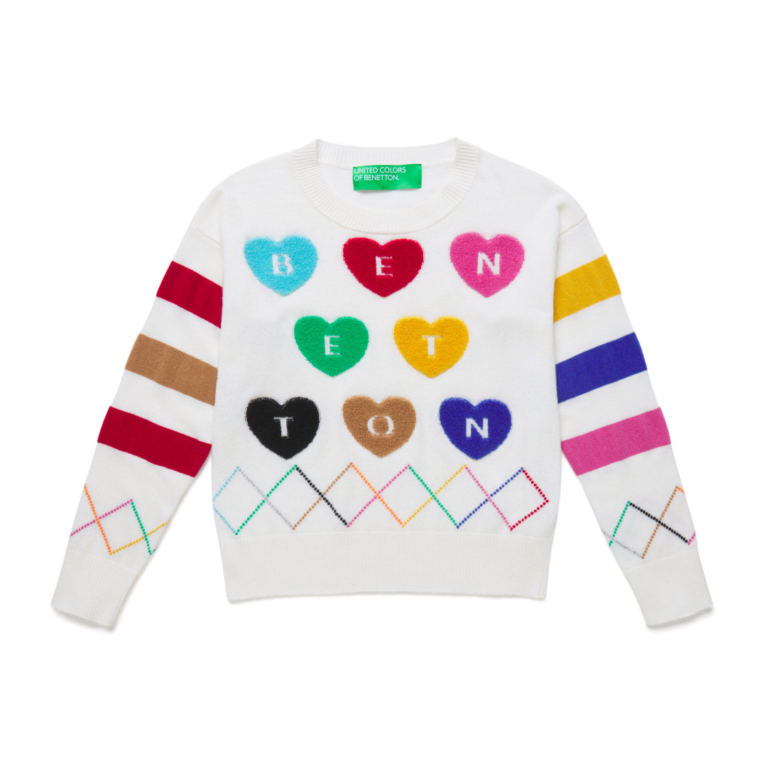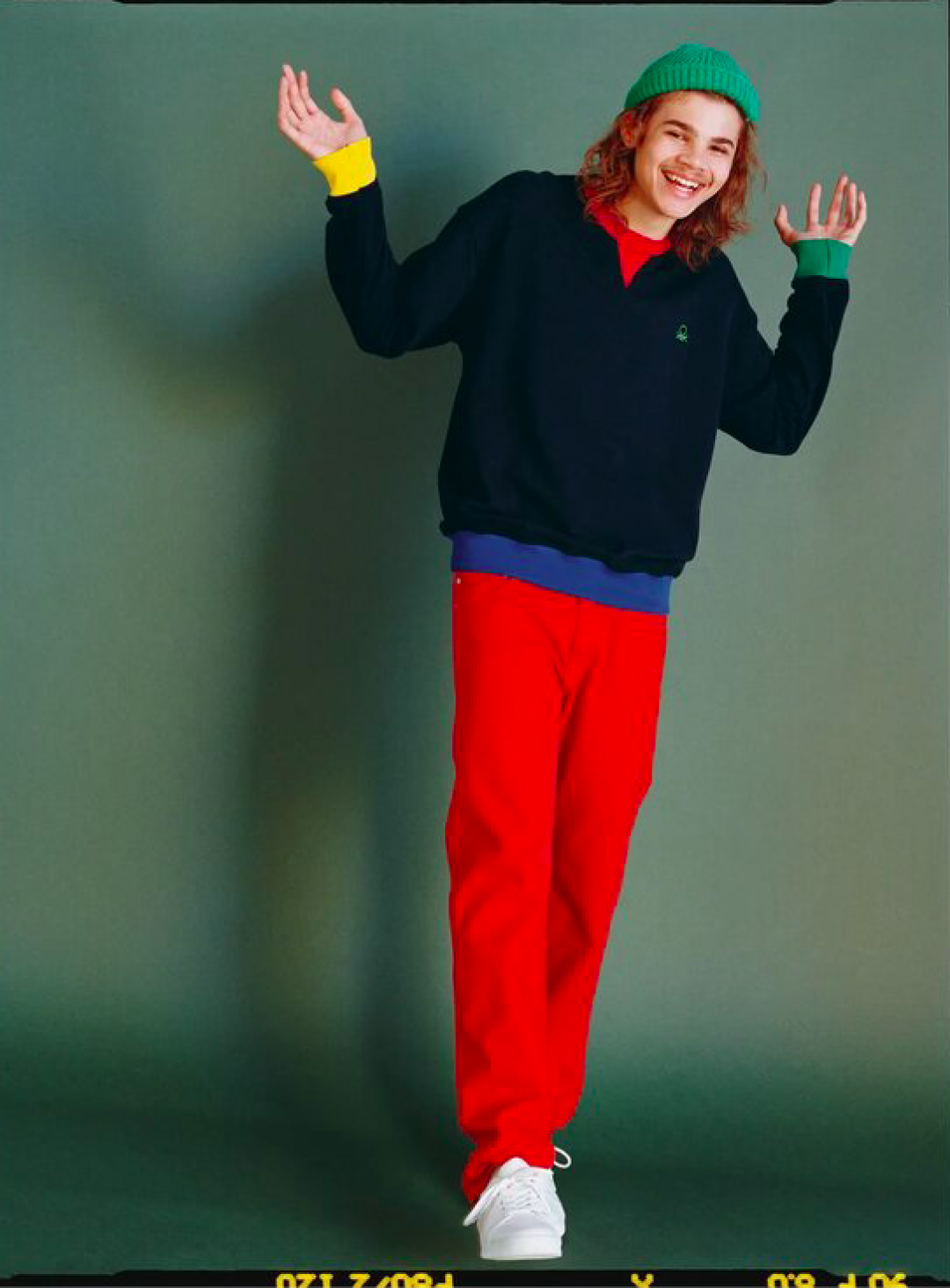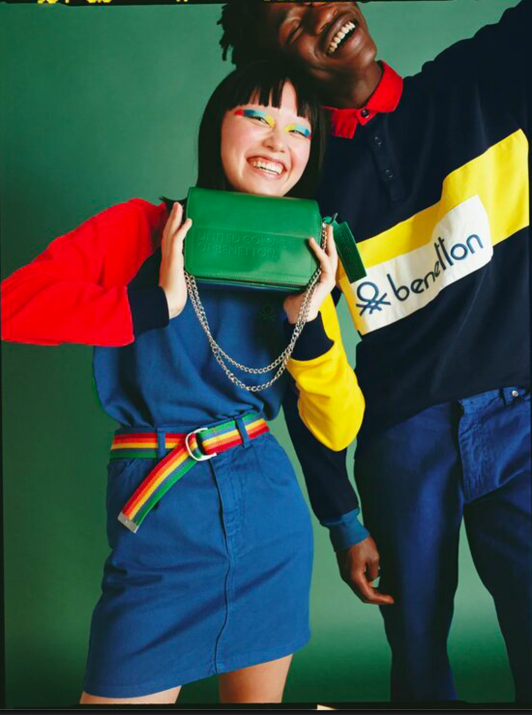 Женская линейка капсулы отчасти отсылает к 70-м с их джинсами клеш с высокой талией. У Benetton они представлены в белом, синем и томатно-красном цветах. В мужской линейке фокус на принты, имитирующие разноцветные надписи, также в нее входят свитшоты и футболки свободного кроя с круглым воротом.