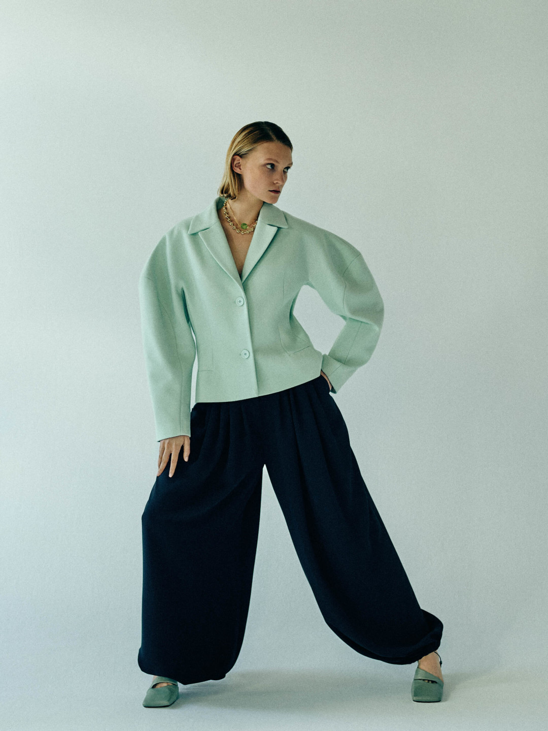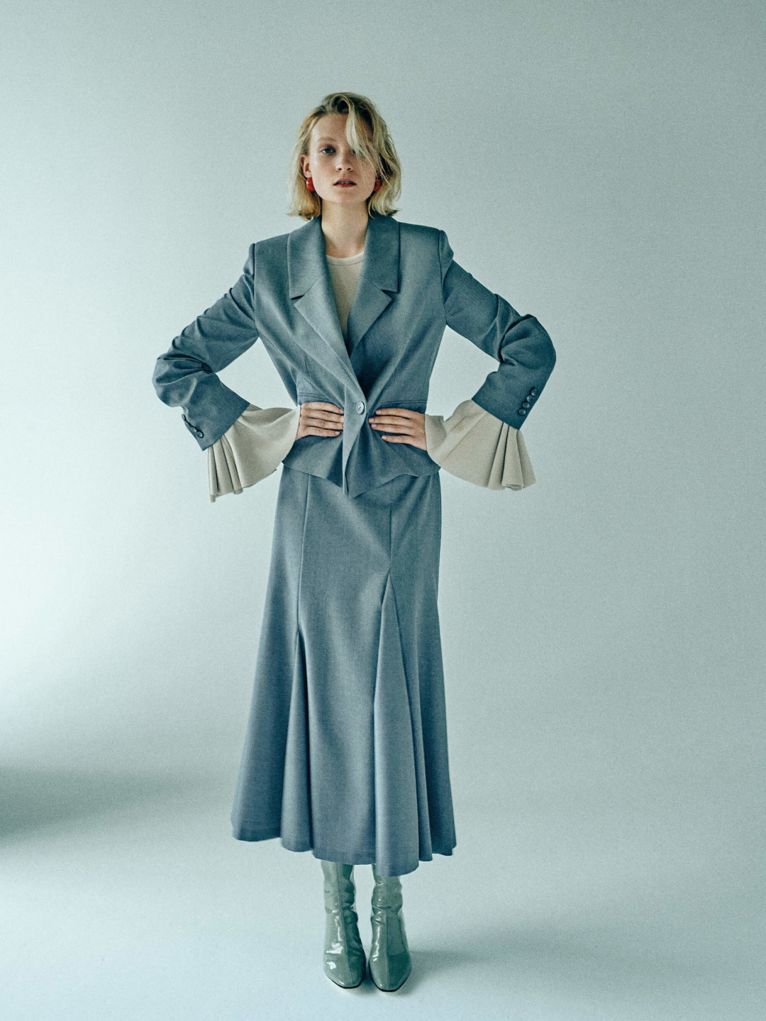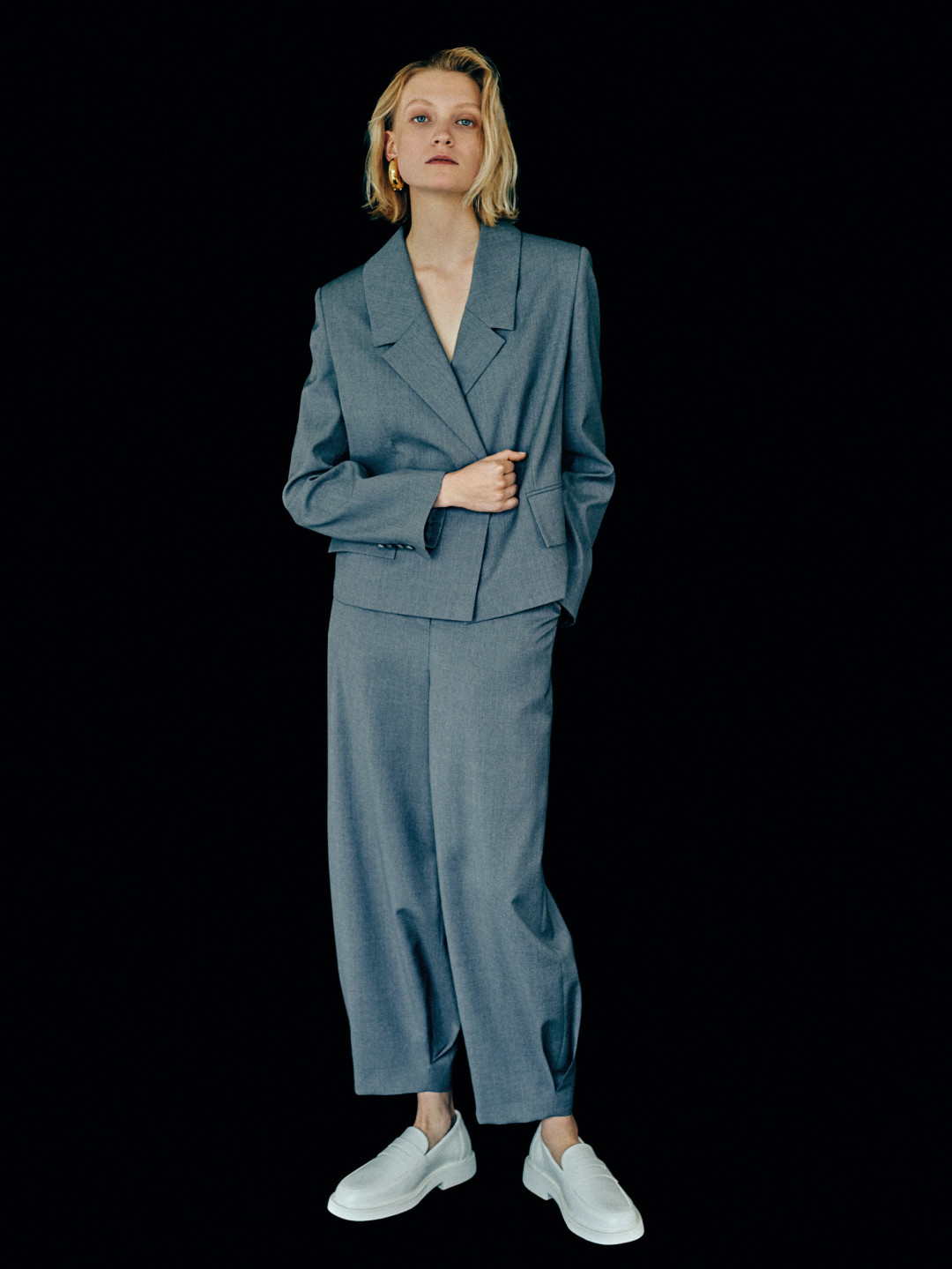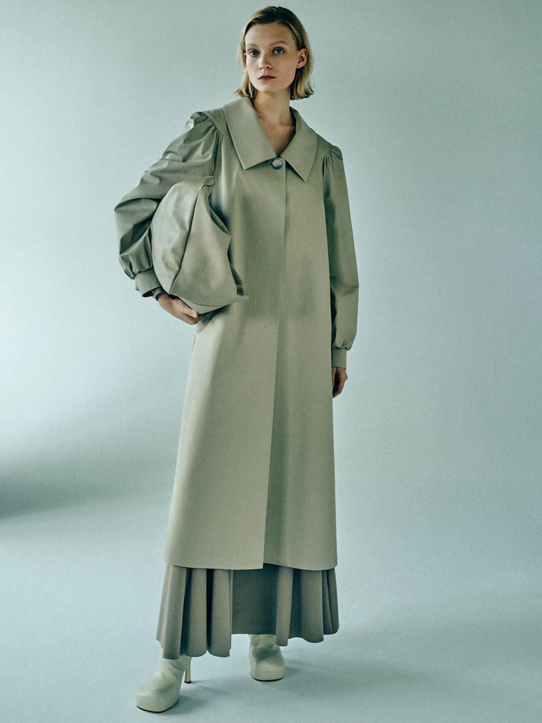 В коллекцию FW 20/21 петербургской марки вошли широкие шаровары, свободные платья, жилет с выведенными объемными плечами, юбка-годе и брючный костюм с объемным жакетом. Ключевые оттенки — бежевый, синий, черный и серый.
