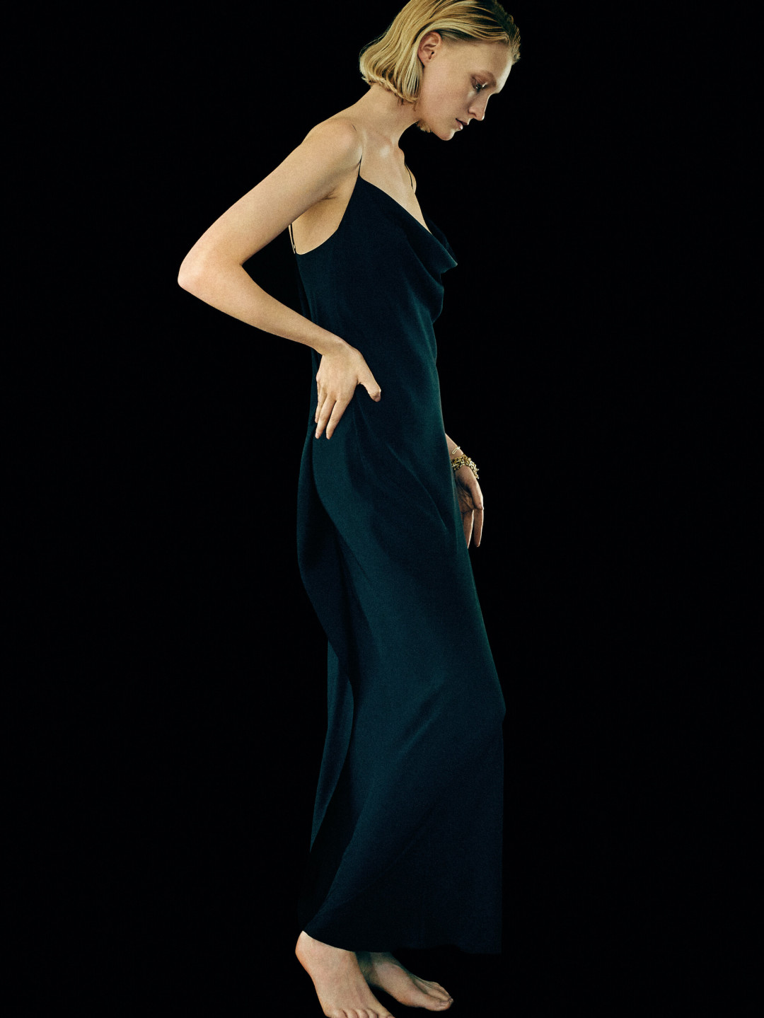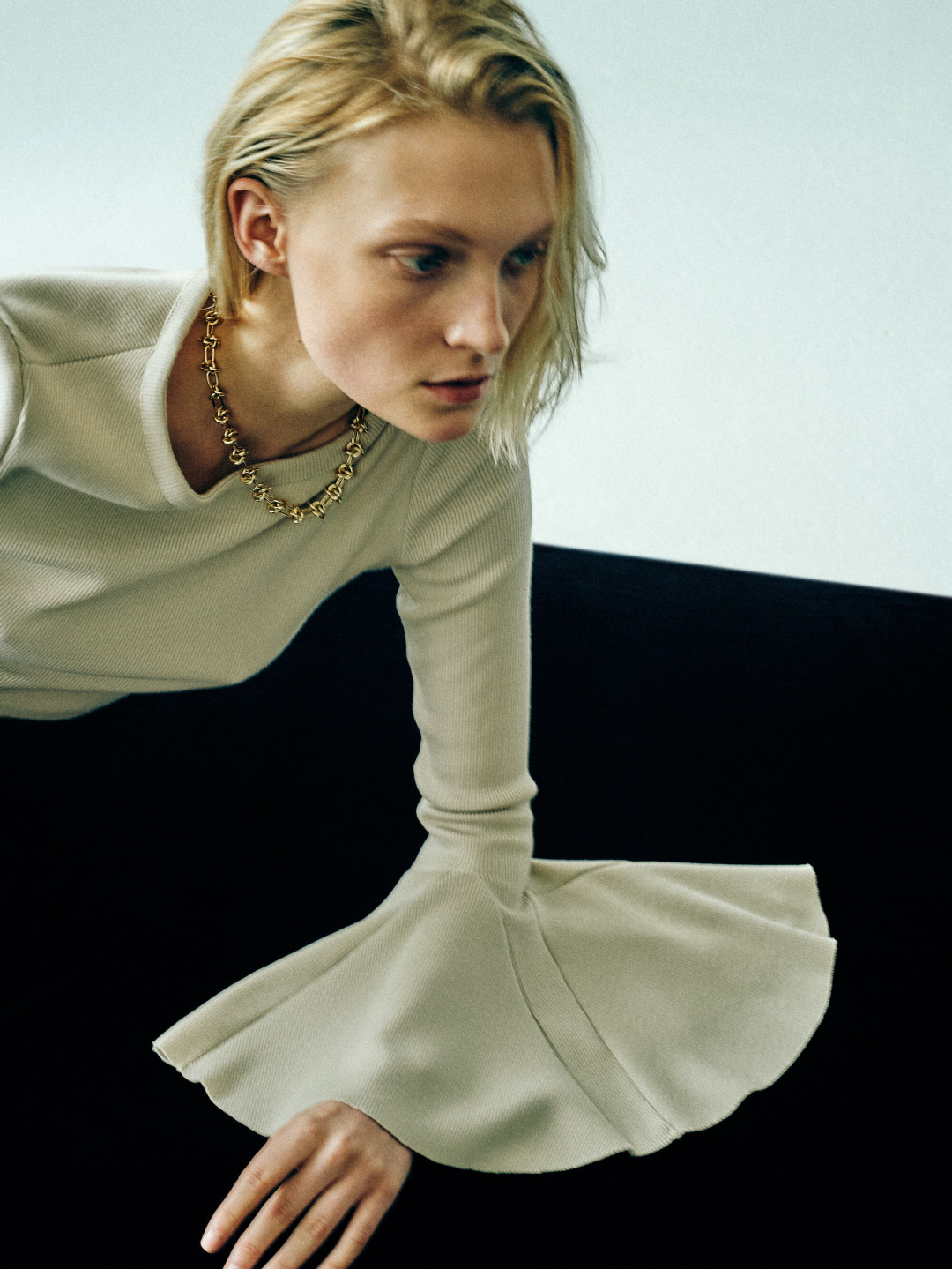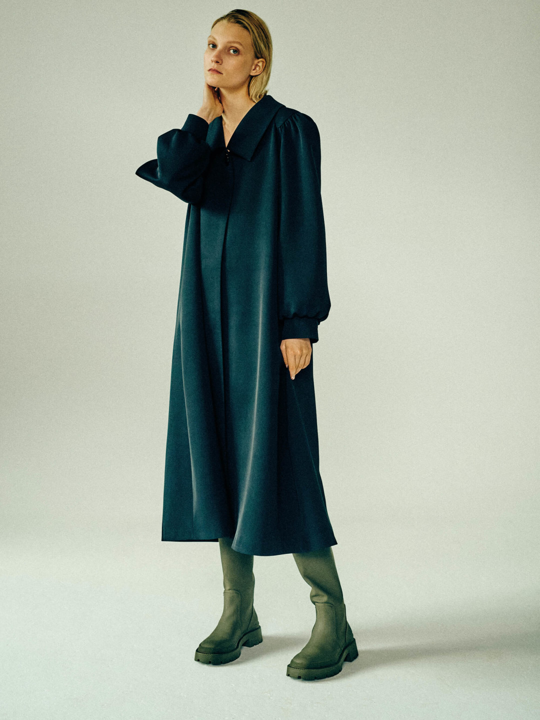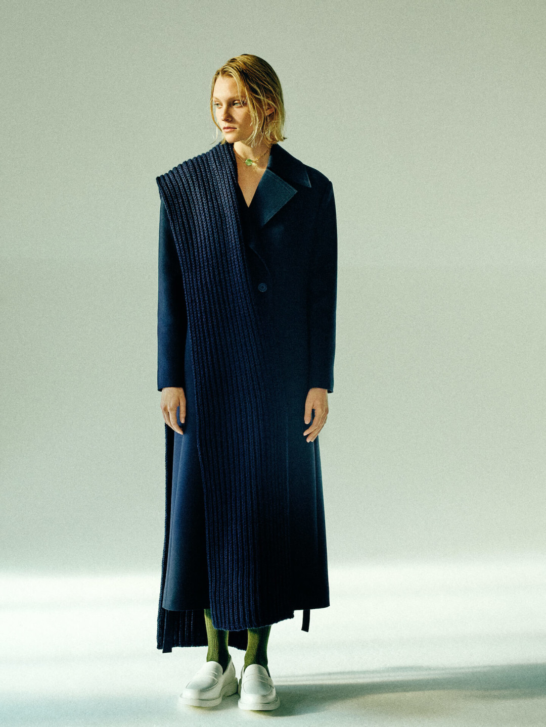В коллекцию FW 20/21 петербургской марки вошли широкие шаровары, свободные платья, жилет с выведенными объемными плечами, юбка-годе и брючный костюм с объемным жакетом. Ключевые оттенки — бежевый, синий, черный и серый.