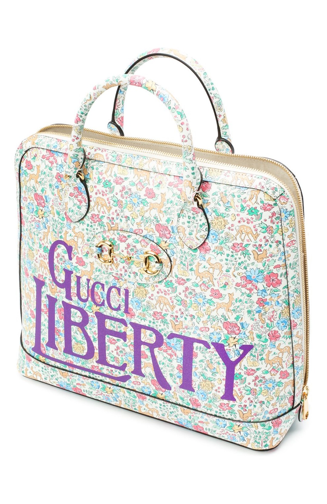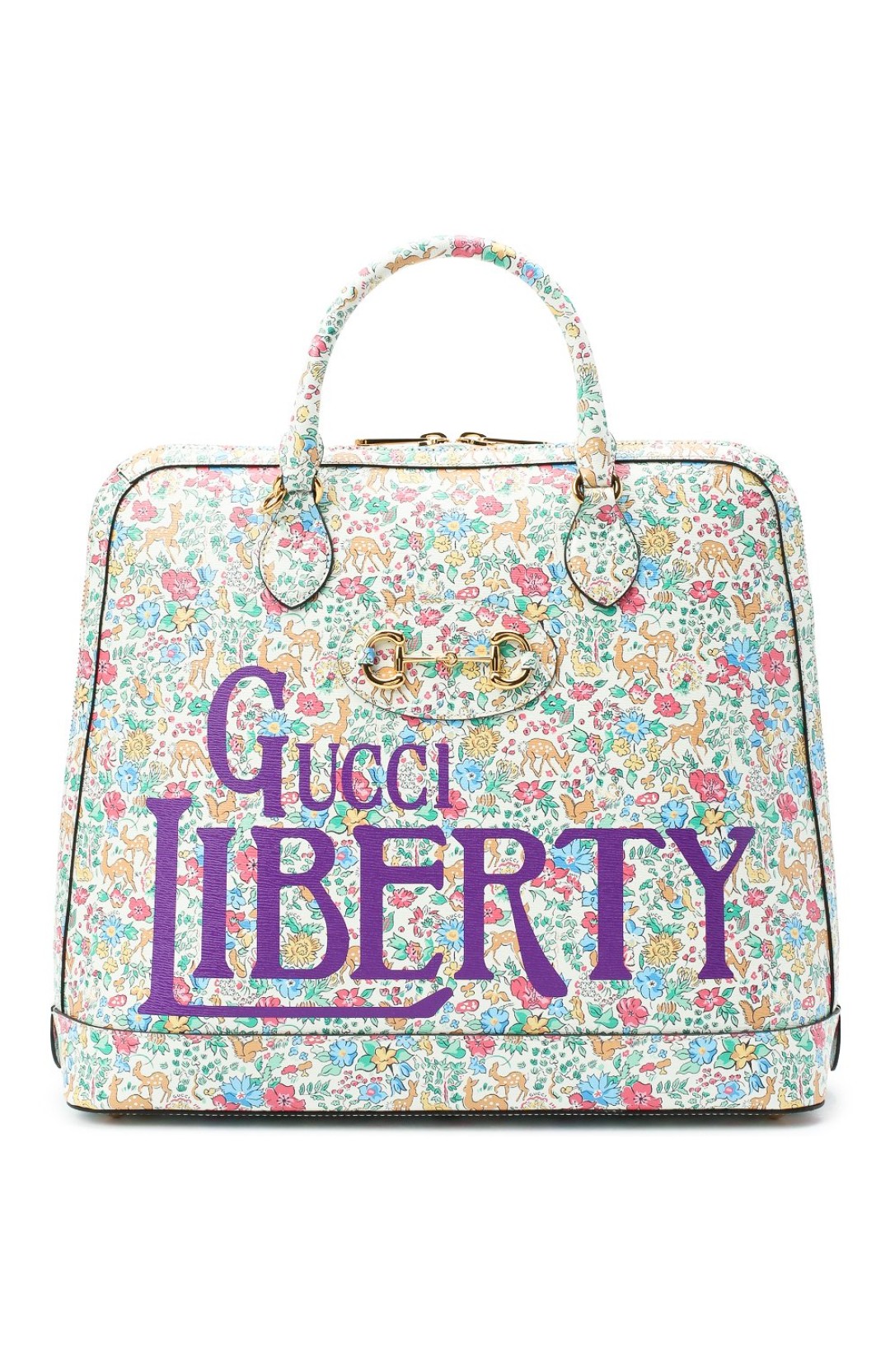 Совместная капсула бренда и универмага вошла в подиумную коллекцию Gucci осень-зима 20/21. Она состоит из сумок, обуви и аксессуаров, украшенных цветочными орнаментами из архивов Liberty. Наш лот не стал исключением — сумка Gucci Horsebit 1955 отличается флористическим орнаментом, а ее лицевая часть декорирована принтом Gucci Liberty в честь эксклюзивного сотрудничества.