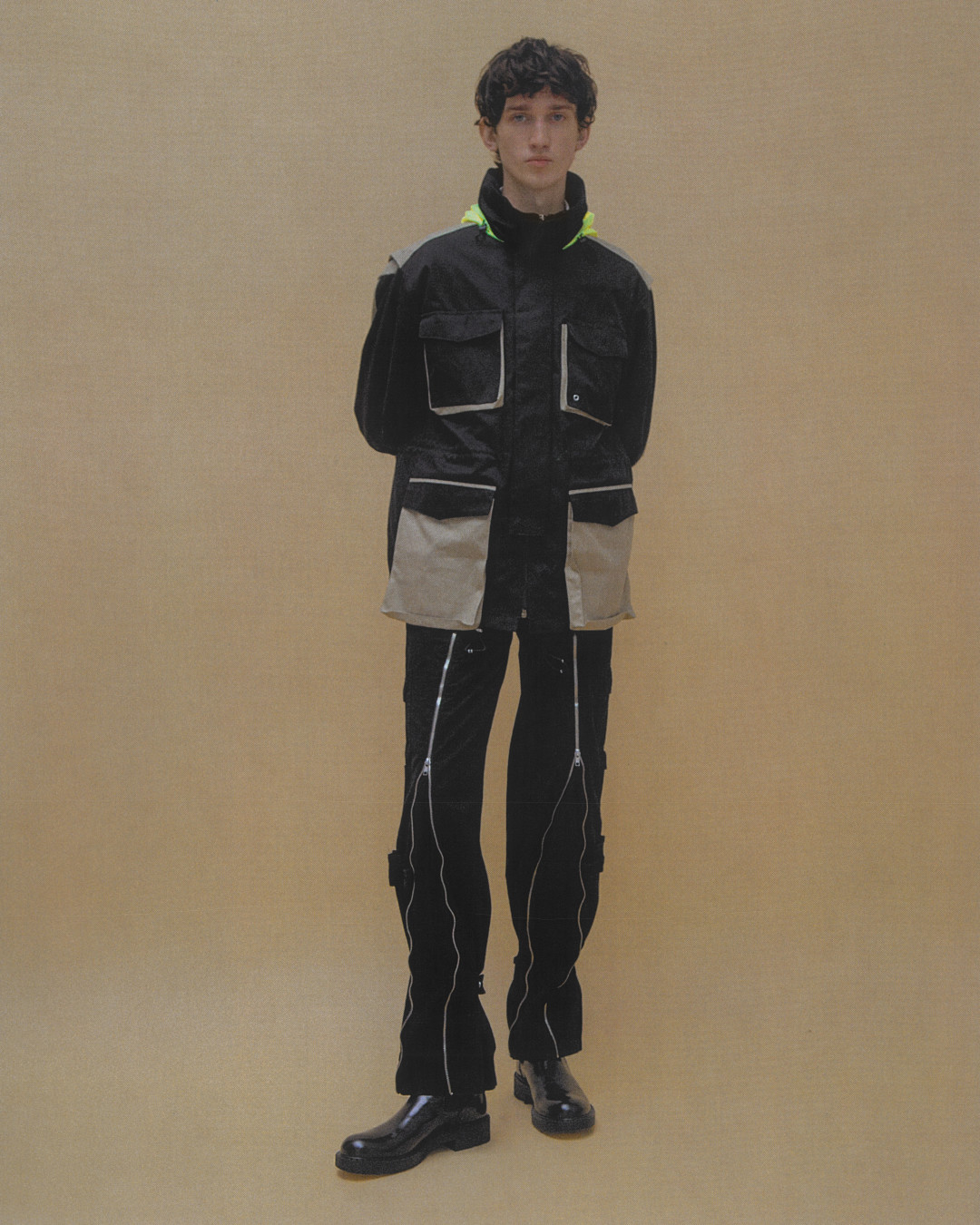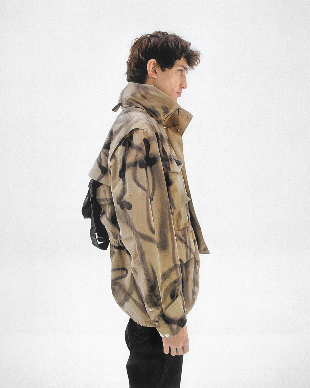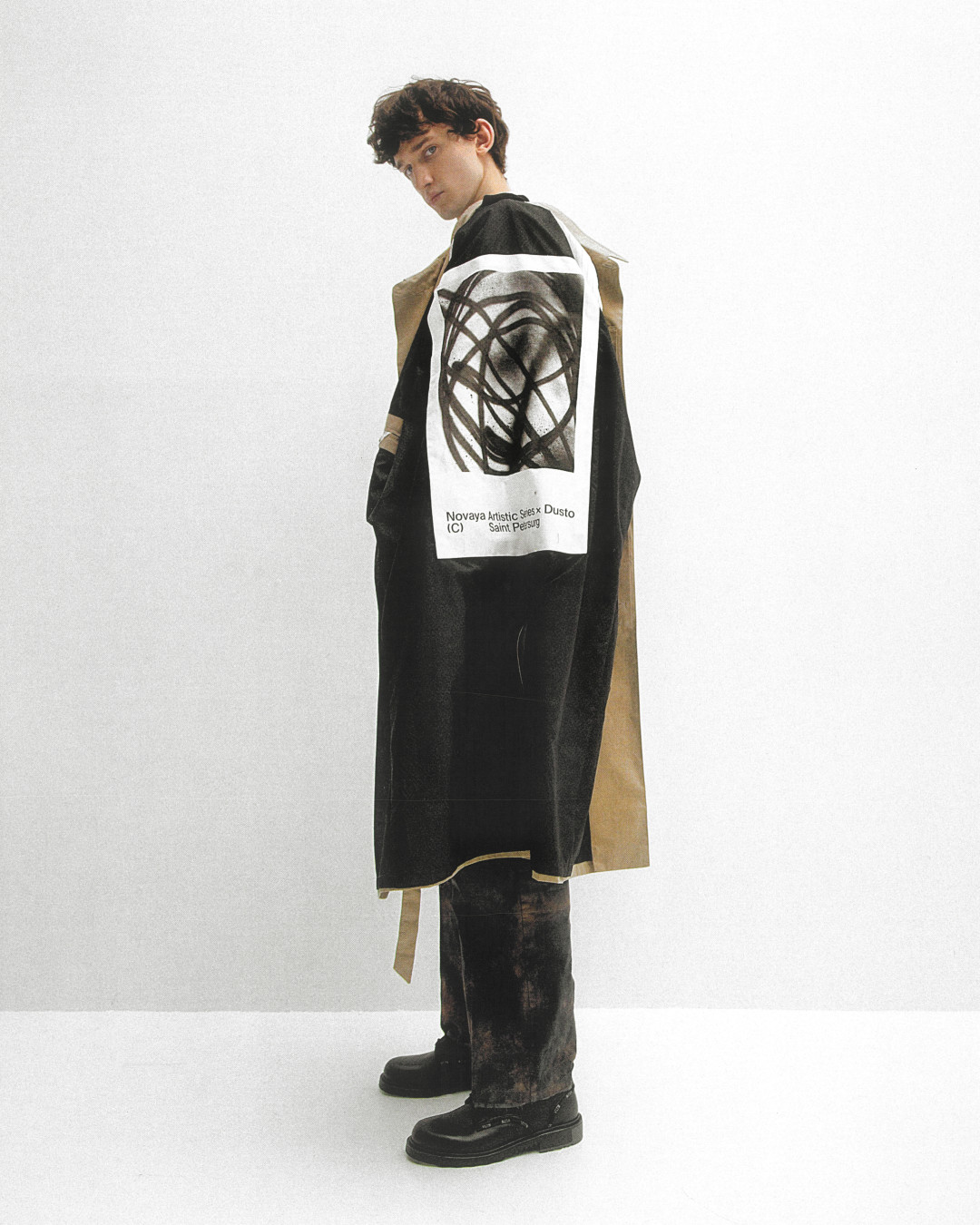 В нее вошли рубашка, тренч и куртка field jacket, украшенные абстрактными работами в технике action painting авторства Никиты Dusto. Капсула создана из стоковых материалов люксовых фабрик — плотного твил-хлопка базовых оттенков: бежевого, черного, оливкового и молочного. В каждую вещь вшита работа Dusto, нарисованная спреем на куске белой ткани.