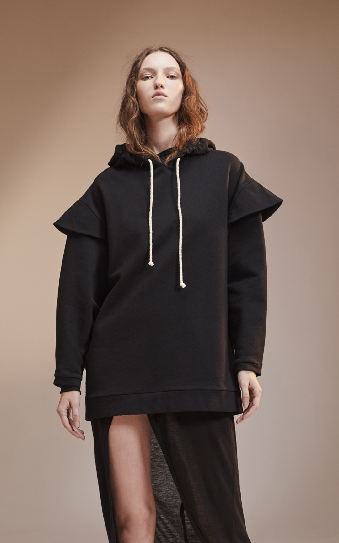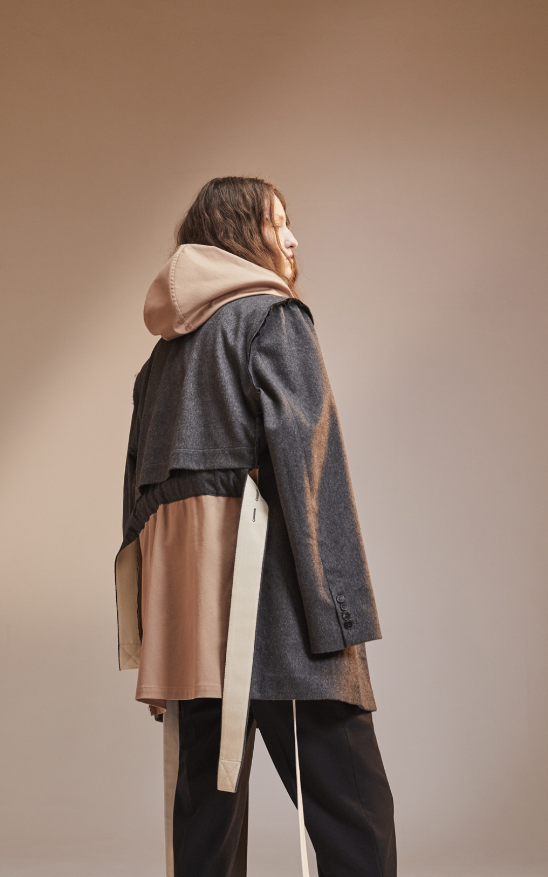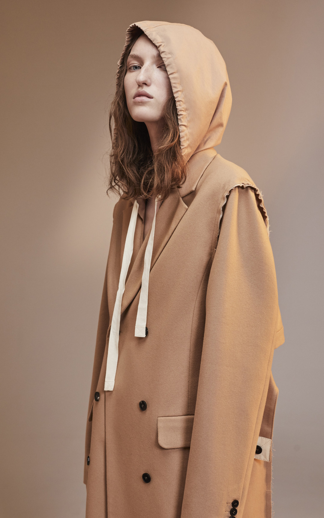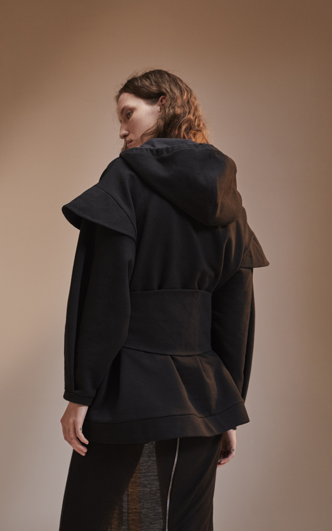 Пальто также отличаются спущенной линией плеча. RUBAN предлагают носить их с джинсами, свитшотами и трикотажным платьем с фигурным разрезом. Жакет из капсульной коллекции WINTER’20/21 дополнен капюшоном и кулиской.