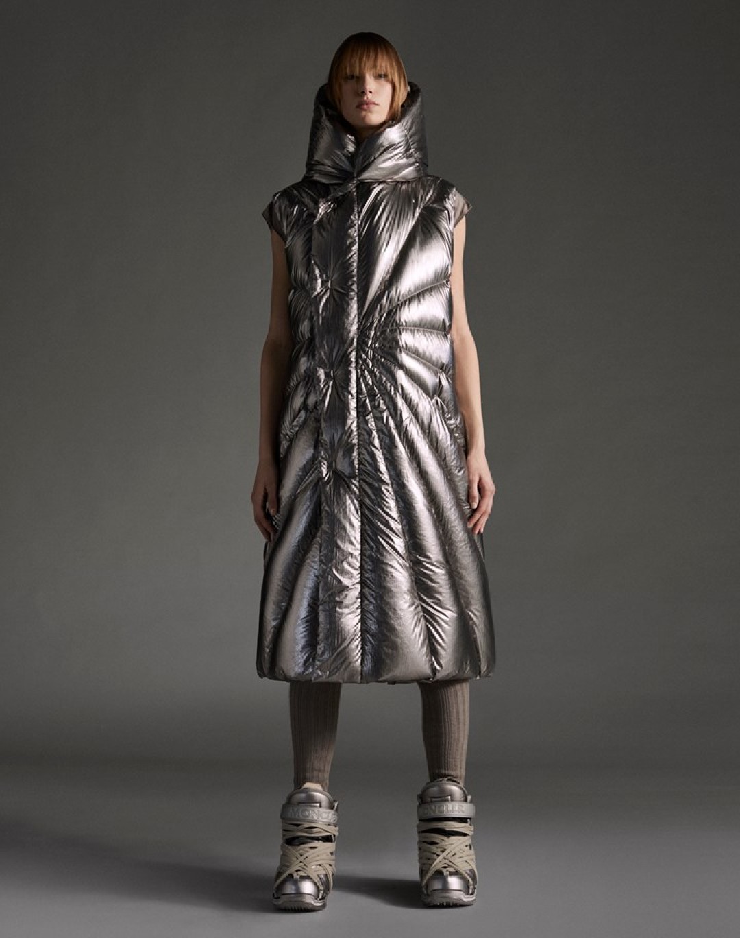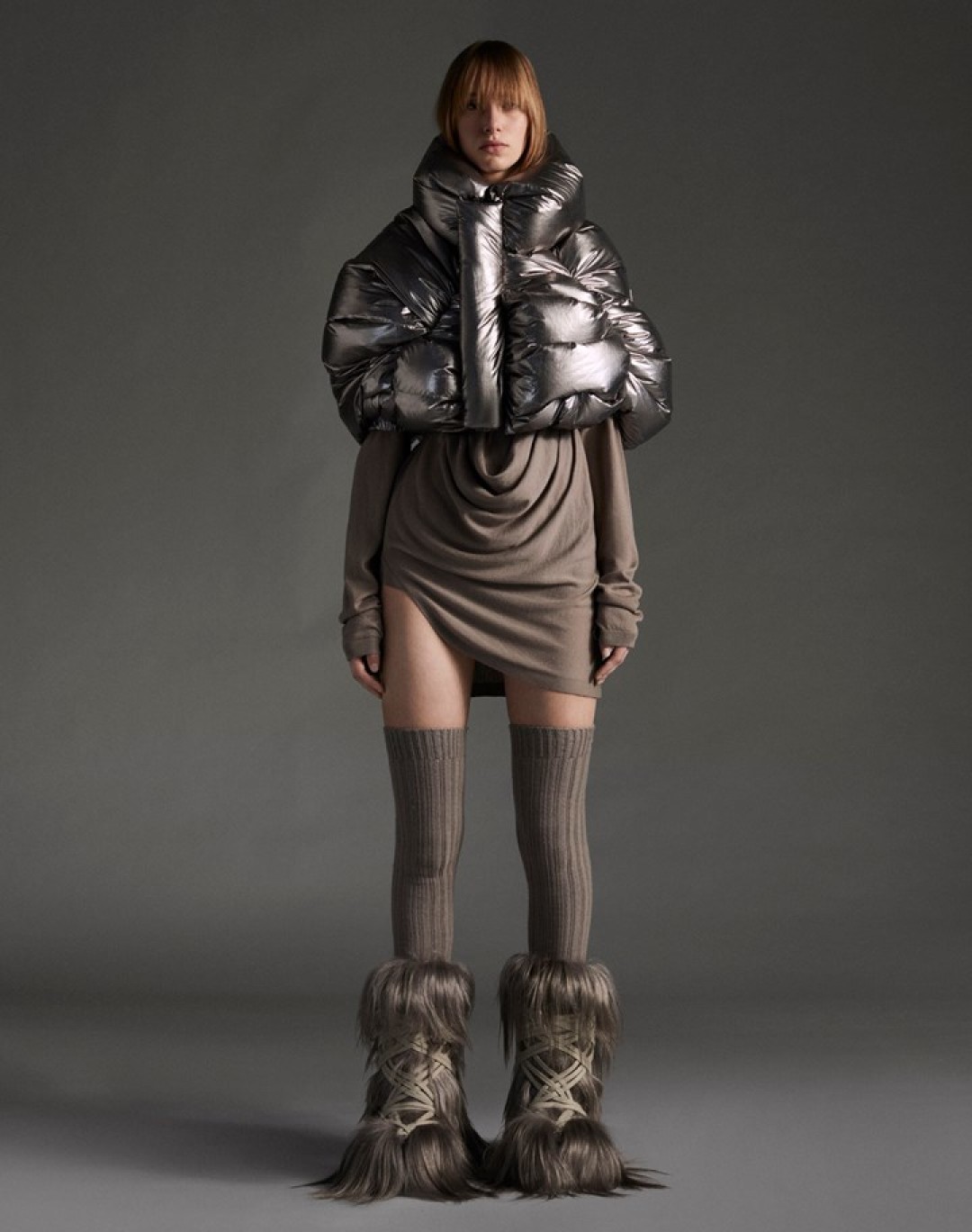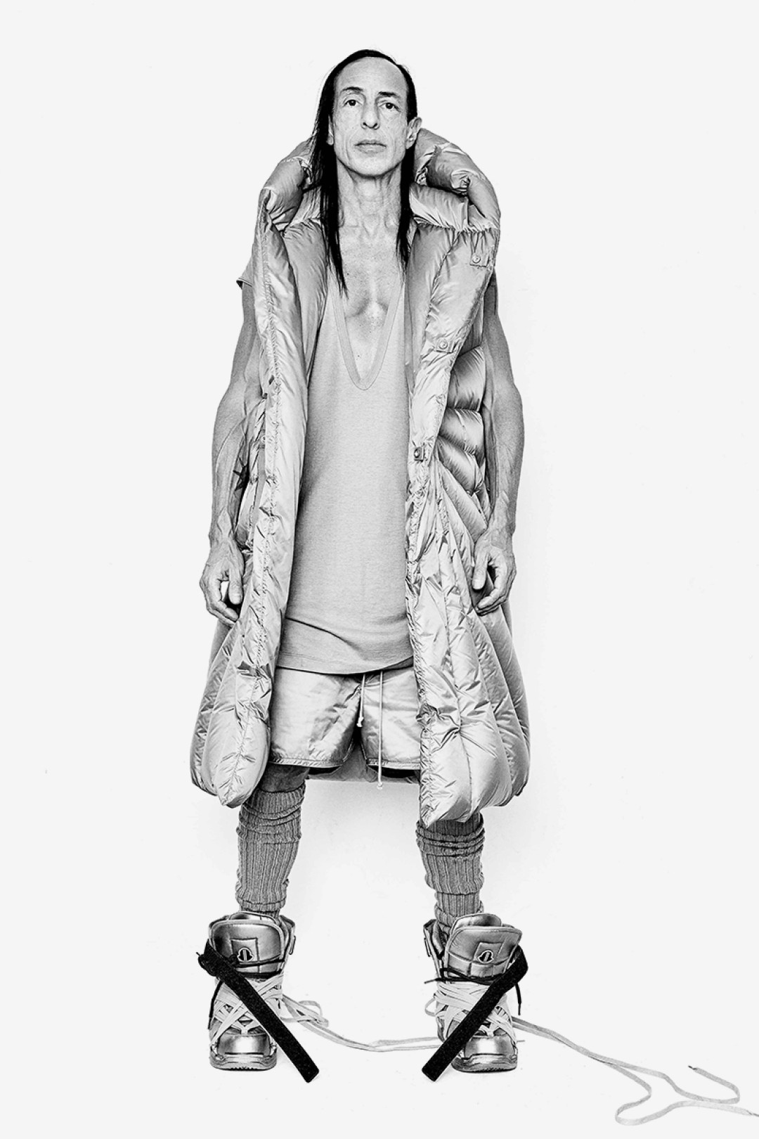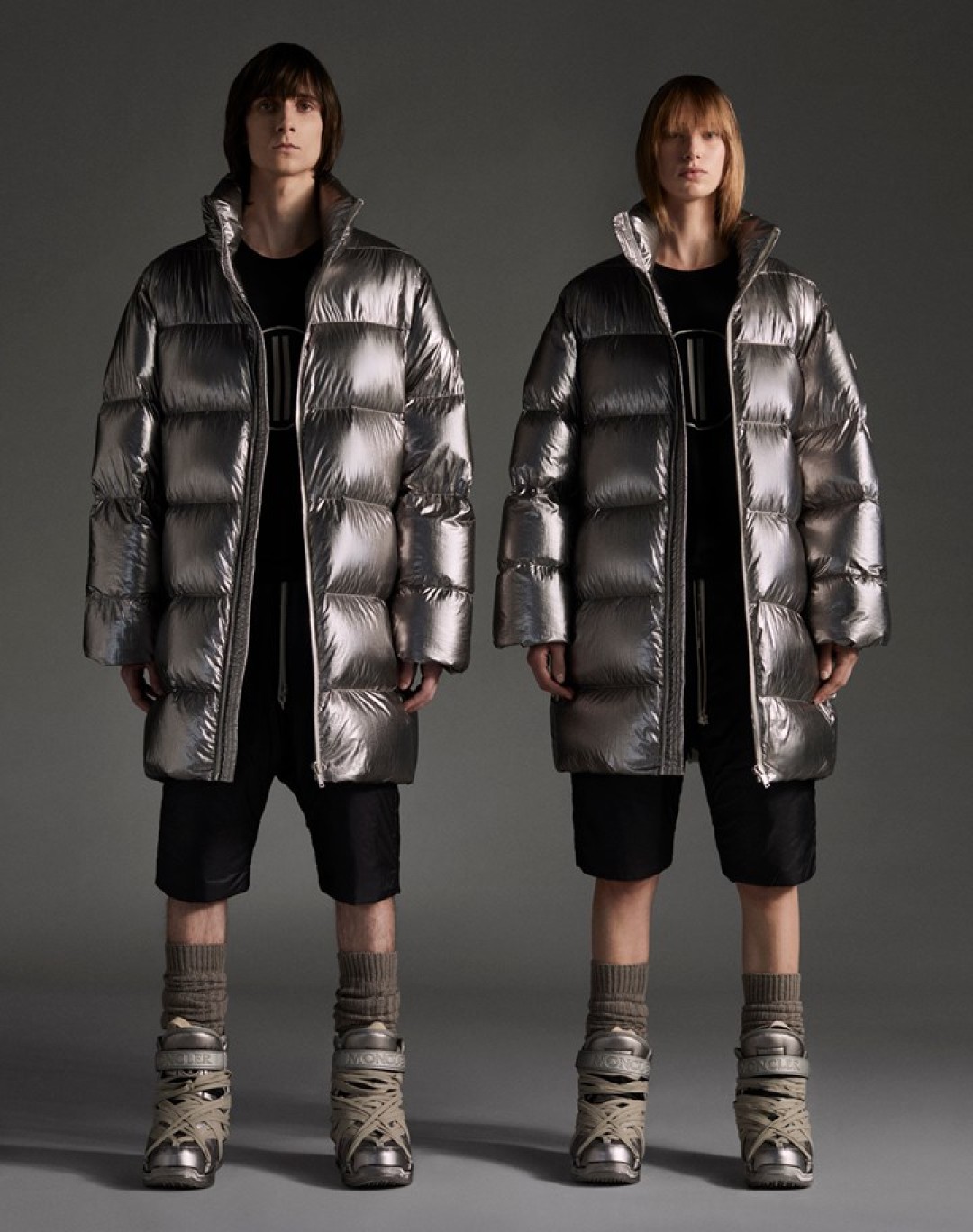 Все пуховики отличаются архитектурной формой, объемными рукавами и воротниками. Коллекция выдержана в трех цветах: черном, бежевом и металлик. В кампейне снялись сами Рик Оуэнс и Мишель Лами — модельер и жена дизайнера.
