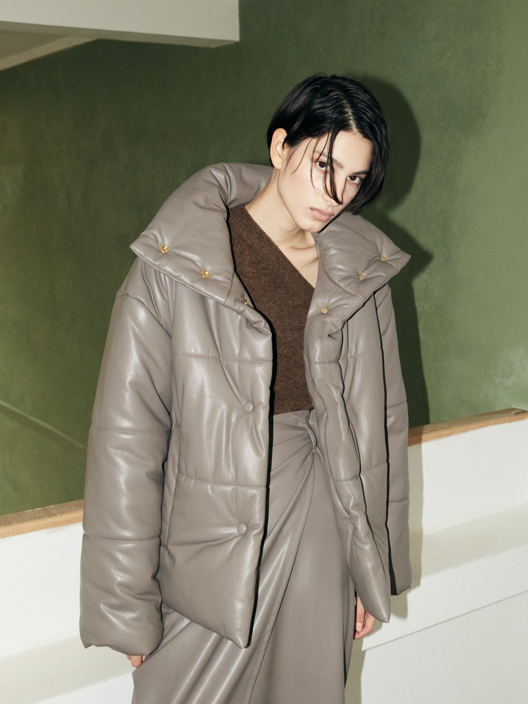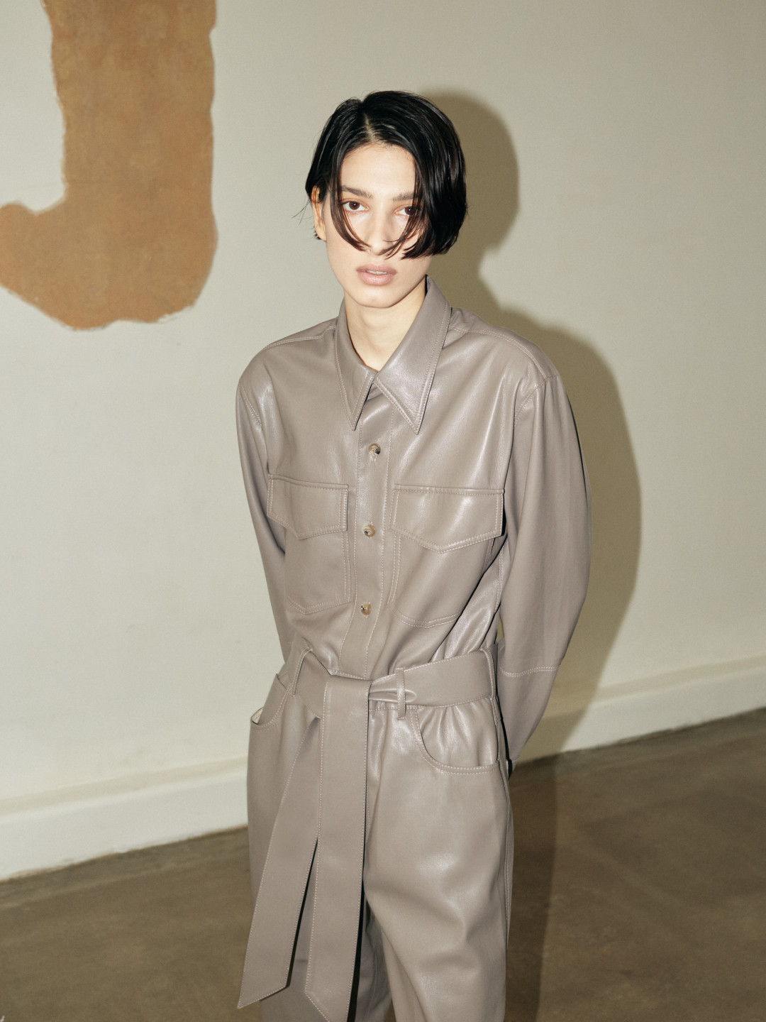 Вещи капсулы созданы из инновационного материала, который имитирует структуру натуральной кожи, но создается путем нанесения полиуретана на текстильную основу c соблюдением стандартов Cruelty Free. Веганская кожа отличается прочностью, не требует особого обращения и пригодна для стирки в домашних условиях. Бонусом — гипоаллергенность и высокая морозостойкость.
